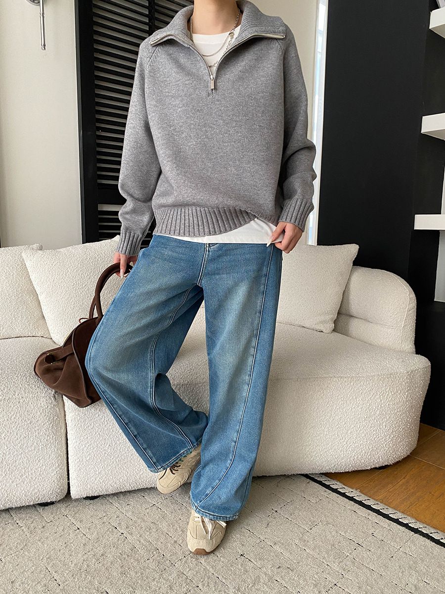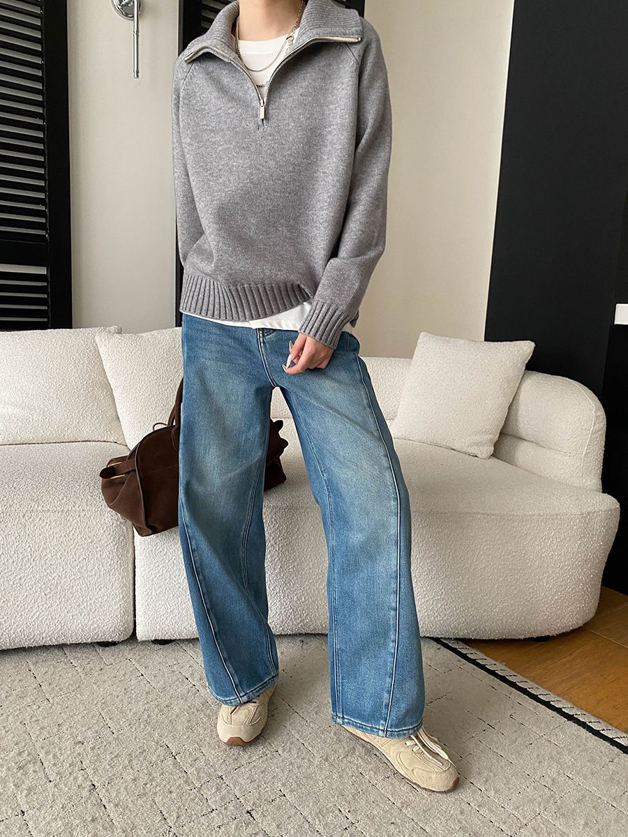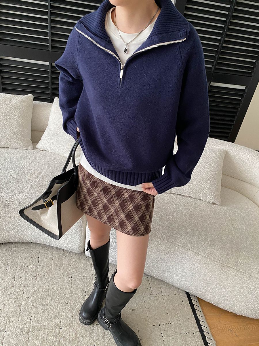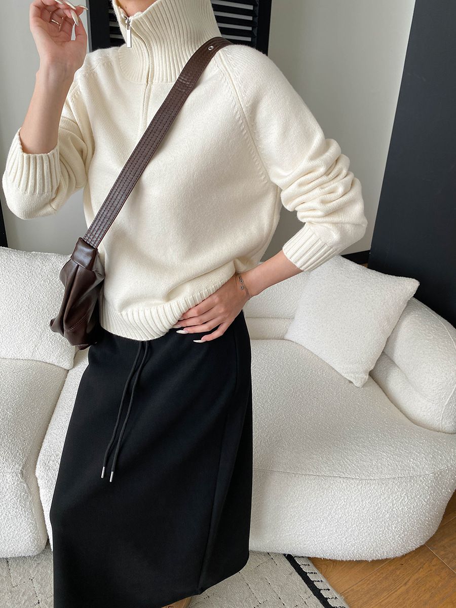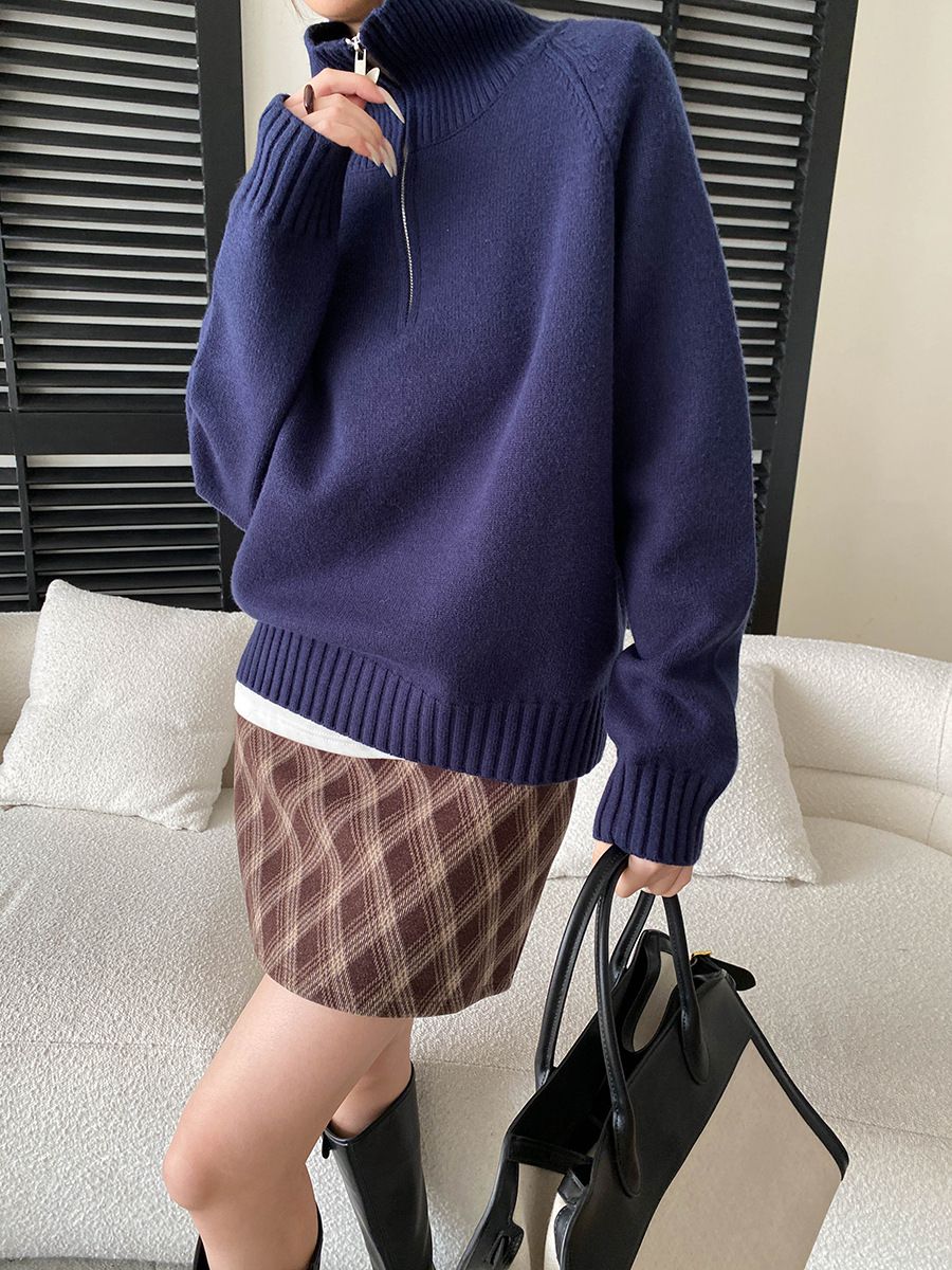 半開襟拉鍊領/立領.高領/連肩袖 - 休閒居家簡約百搭素面拉鍊立領針織衫針織上衣厚磅半開襟高領長袖上衣黃色米白色淺灰色深灰色深藍色