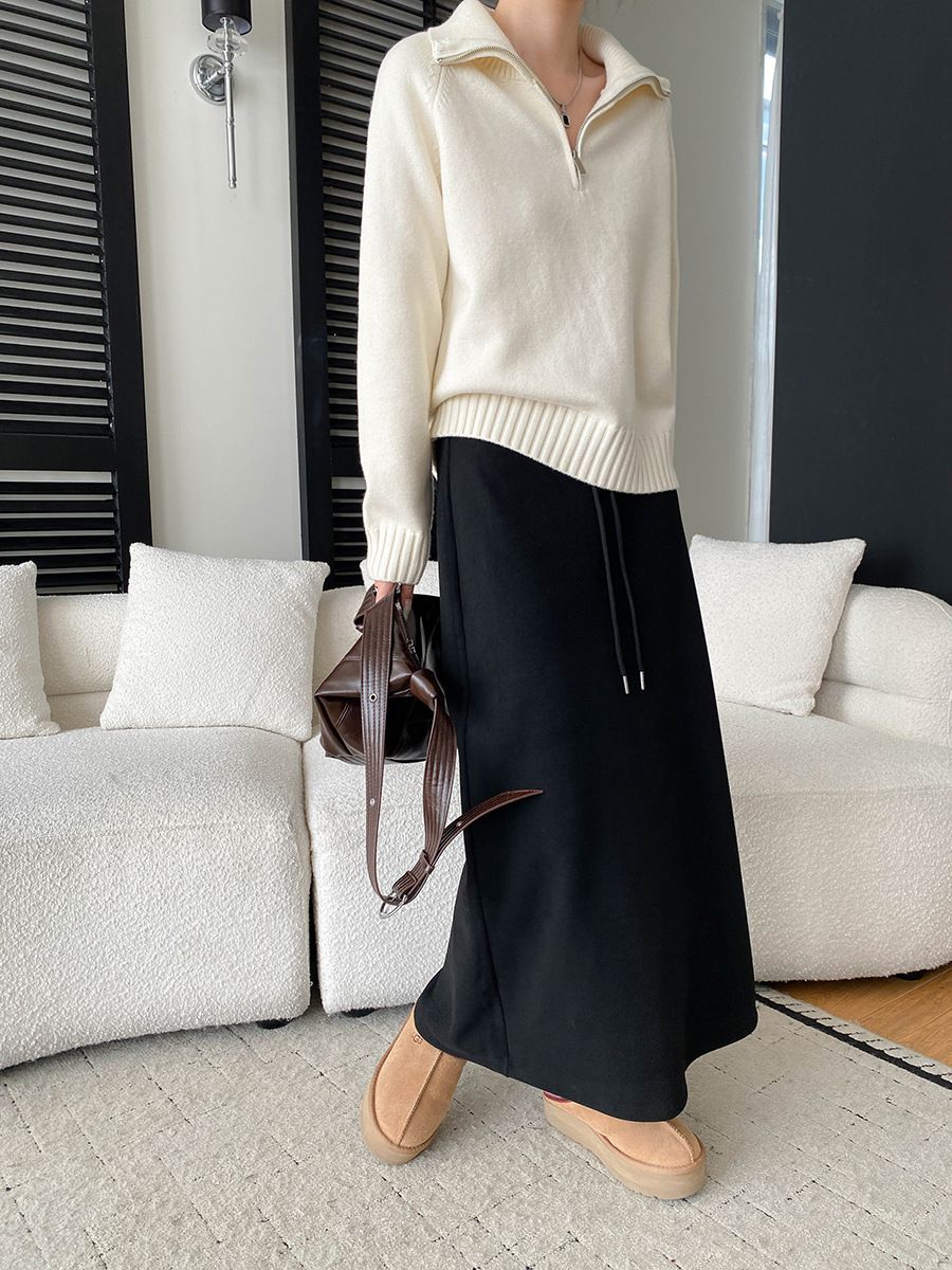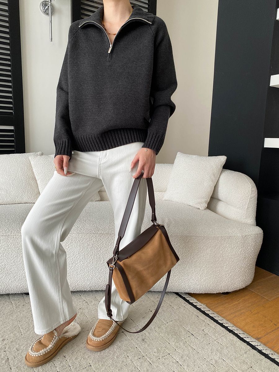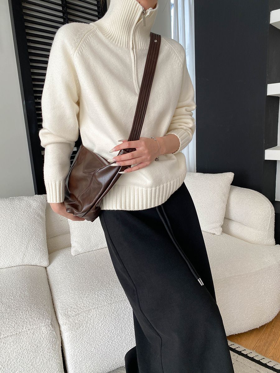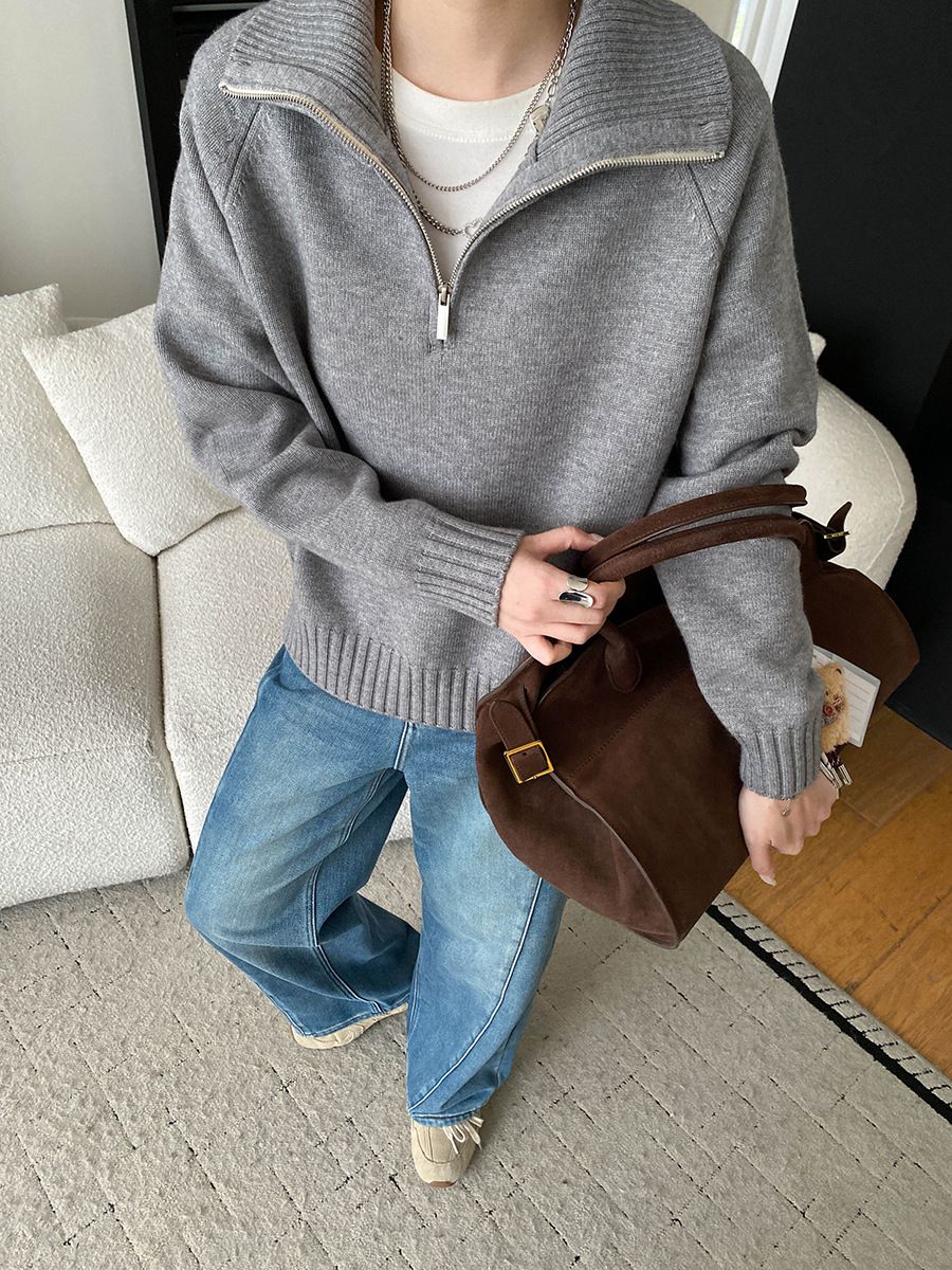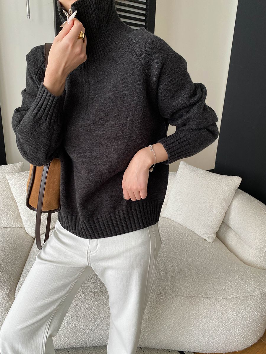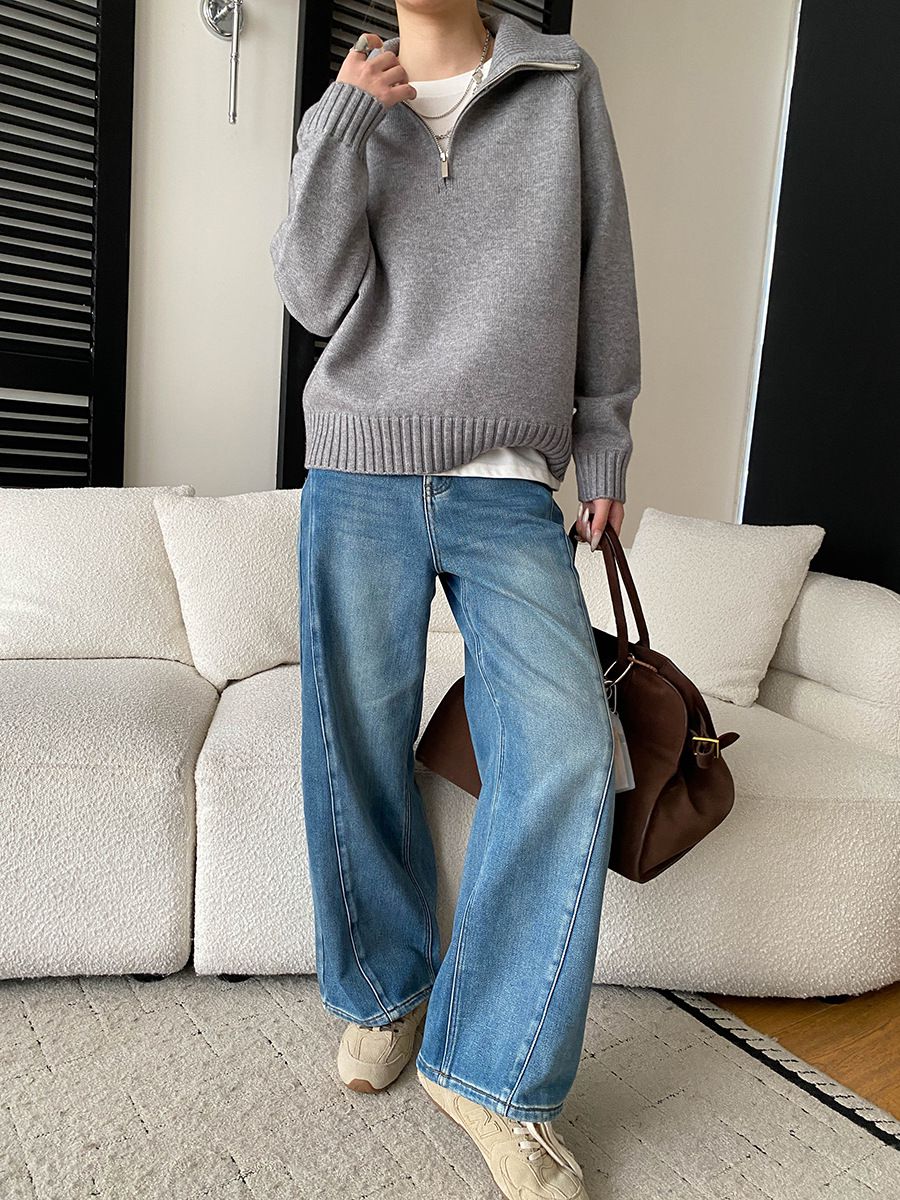 半開襟拉鍊領/立領.高領/連肩袖 - 休閒居家簡約百搭素面拉鍊立領針織衫針織上衣厚磅半開襟高領長袖上衣黃色米白色淺灰色深灰色深藍色