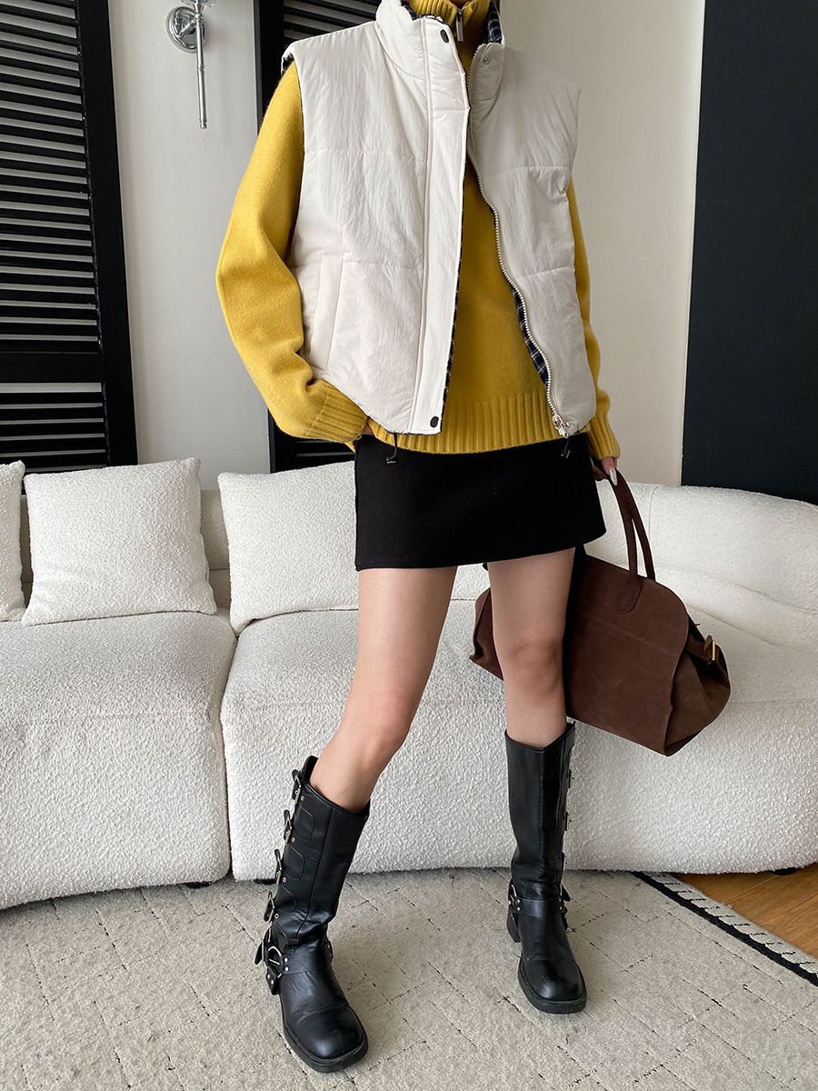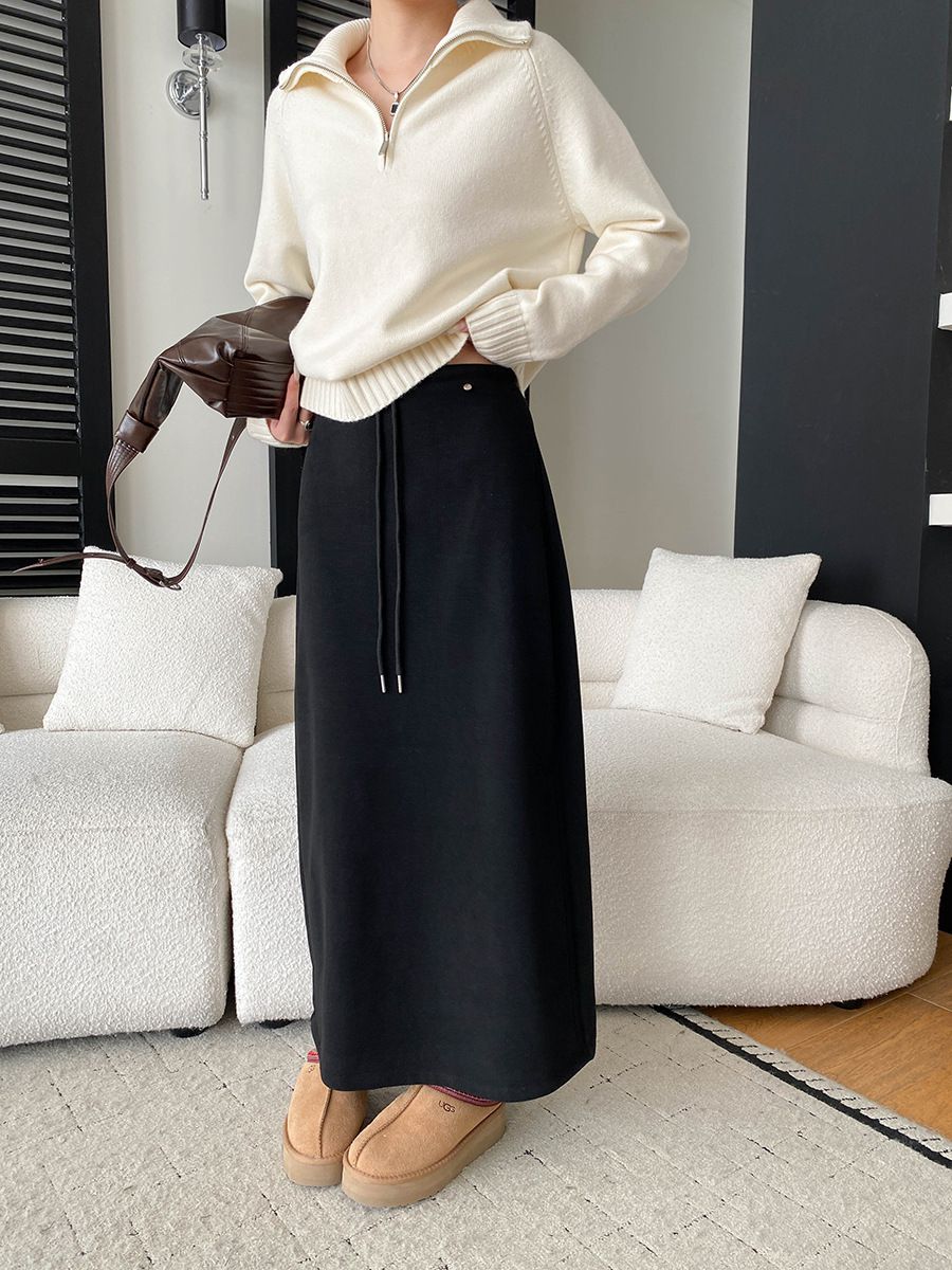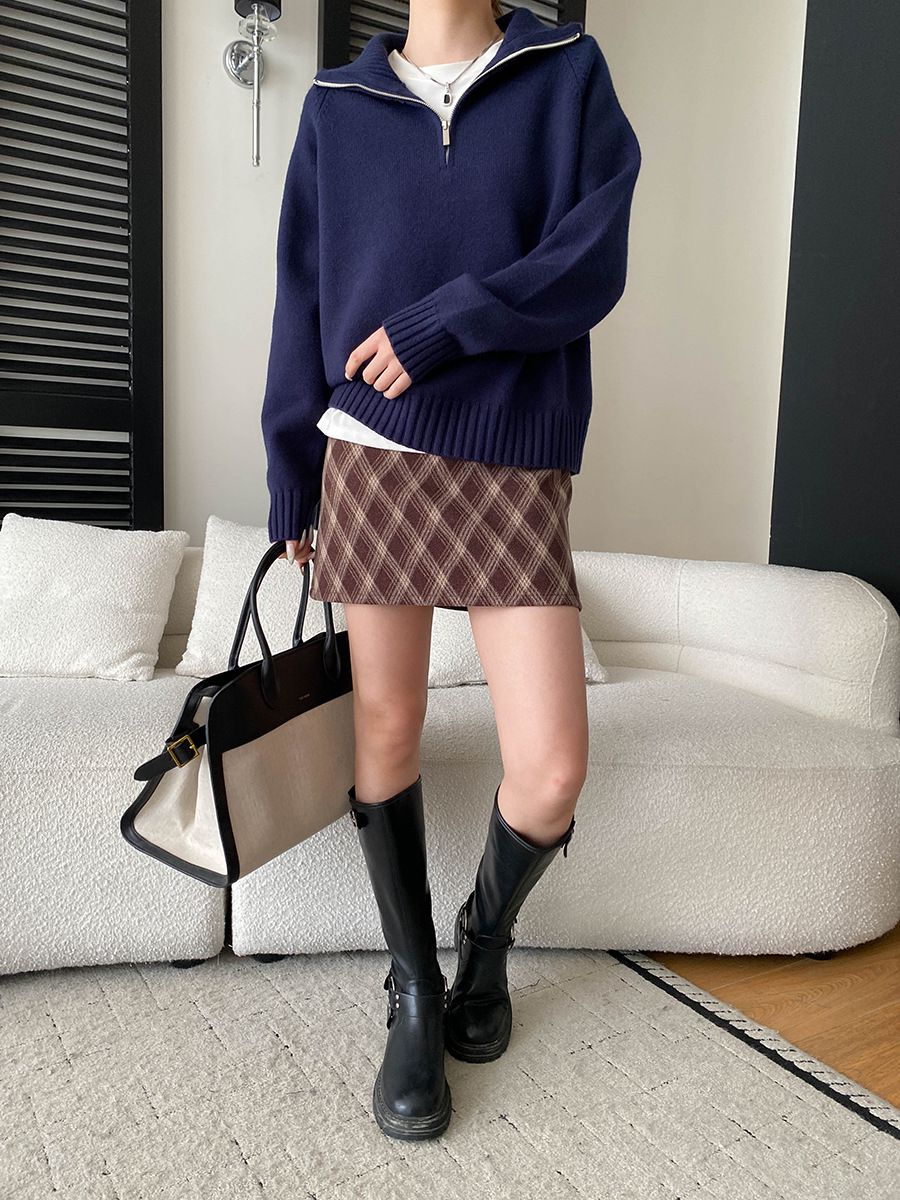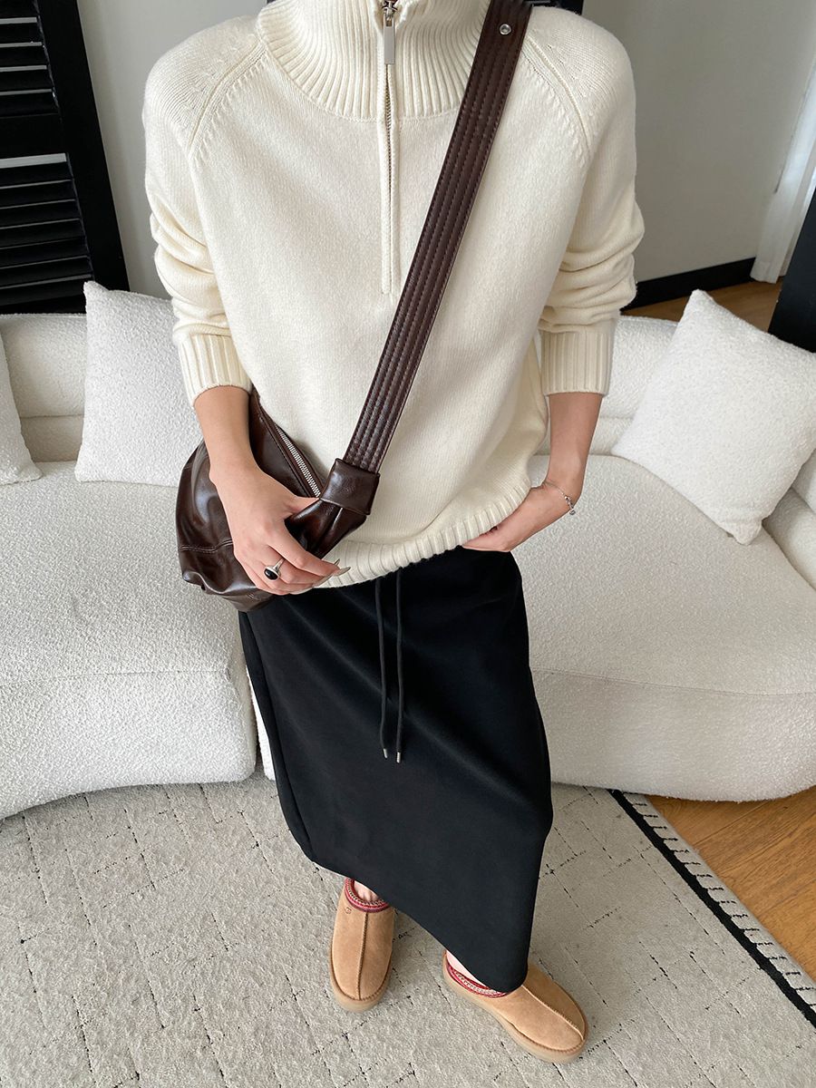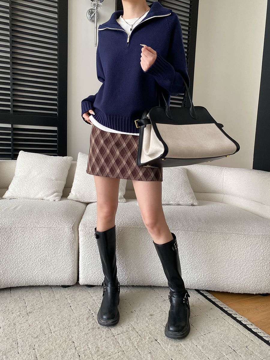 半開襟拉鍊領/立領.高領/連肩袖 - 休閒居家簡約百搭素面拉鍊立領針織衫針織上衣厚磅半開襟高領長袖上衣黃色米白色淺灰色深灰色深藍色