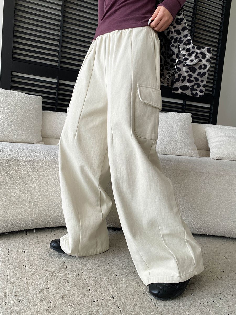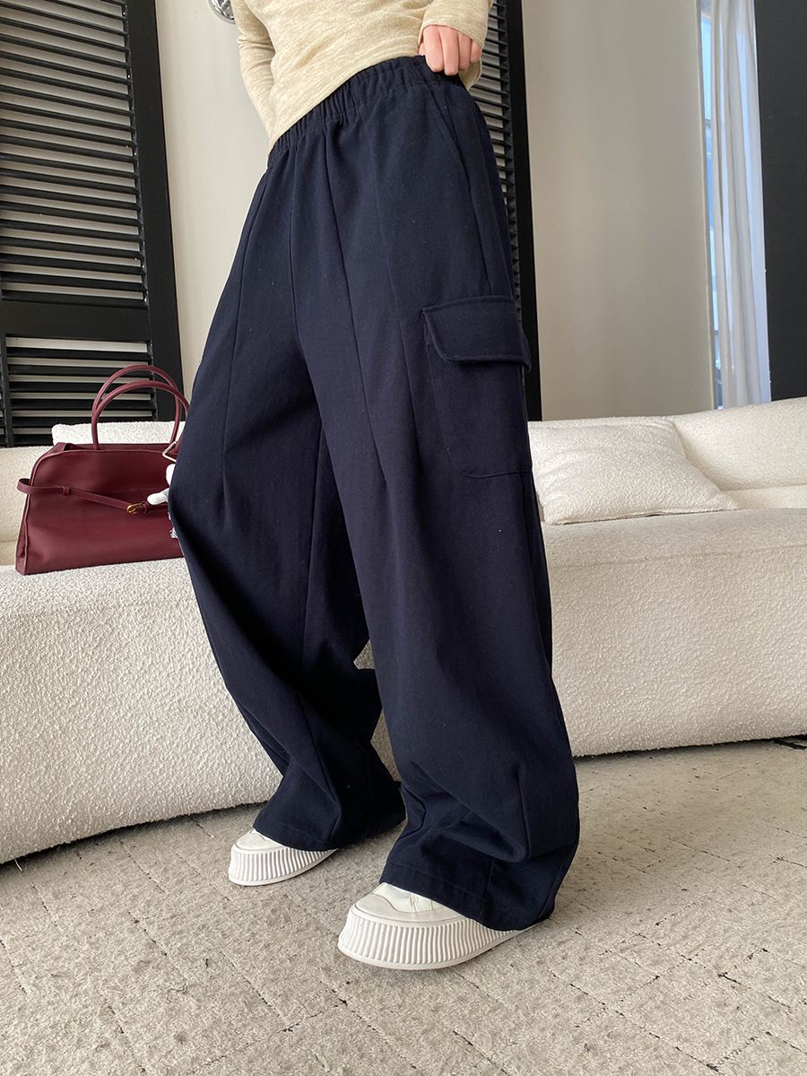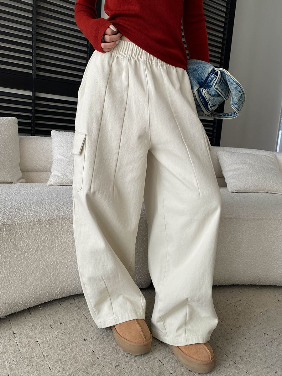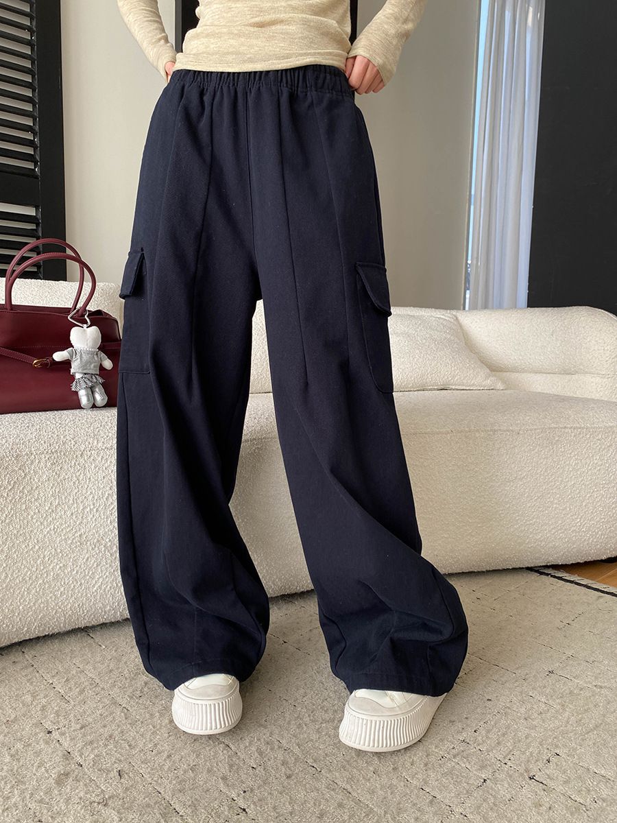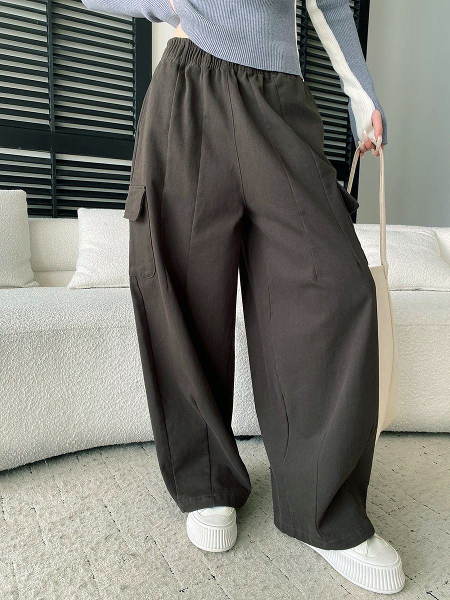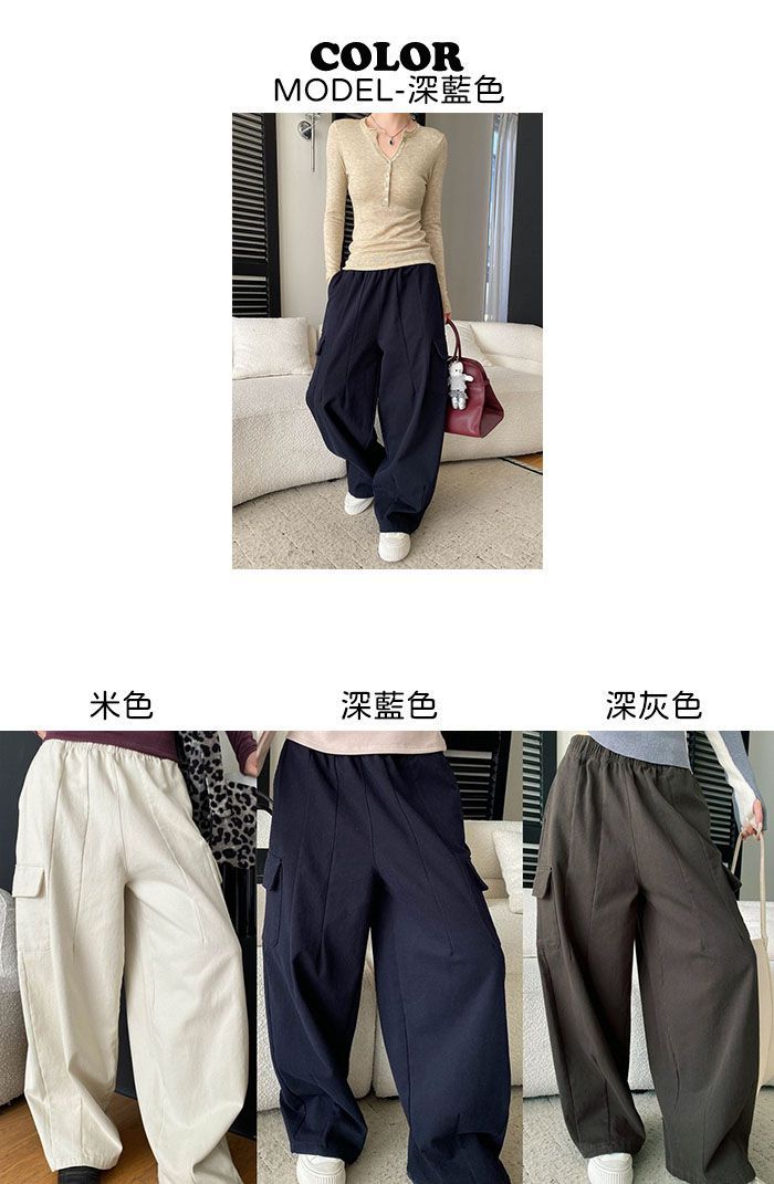 兩種尺寸/全腰鬆緊/立體車線/寬褲管/雙口袋 - 休閒居家渡假簡約百搭素面大口袋工裝褲長褲多尺寸ML米色深藍色深灰色