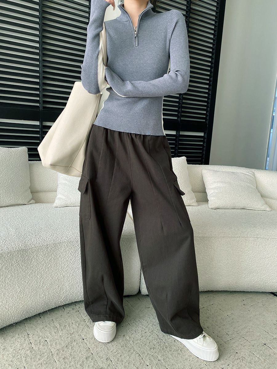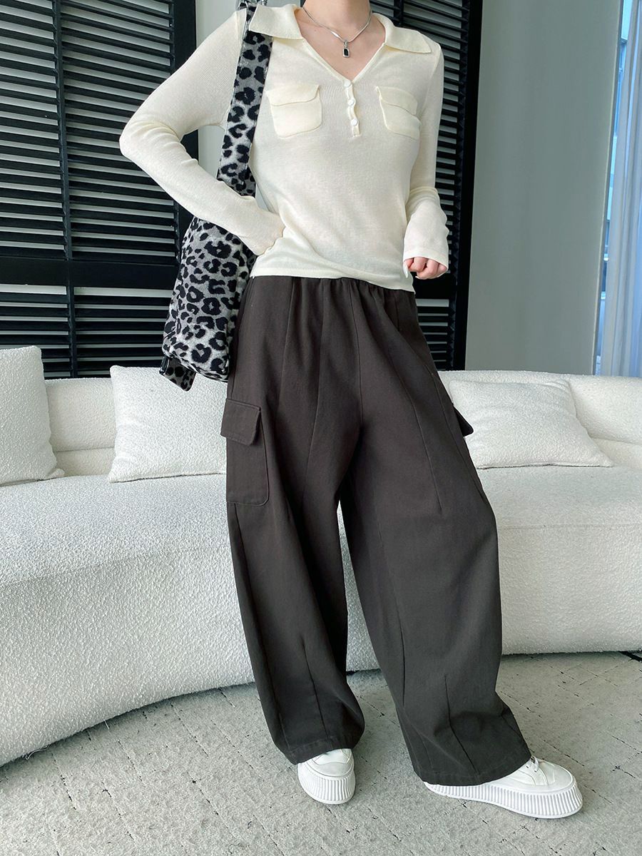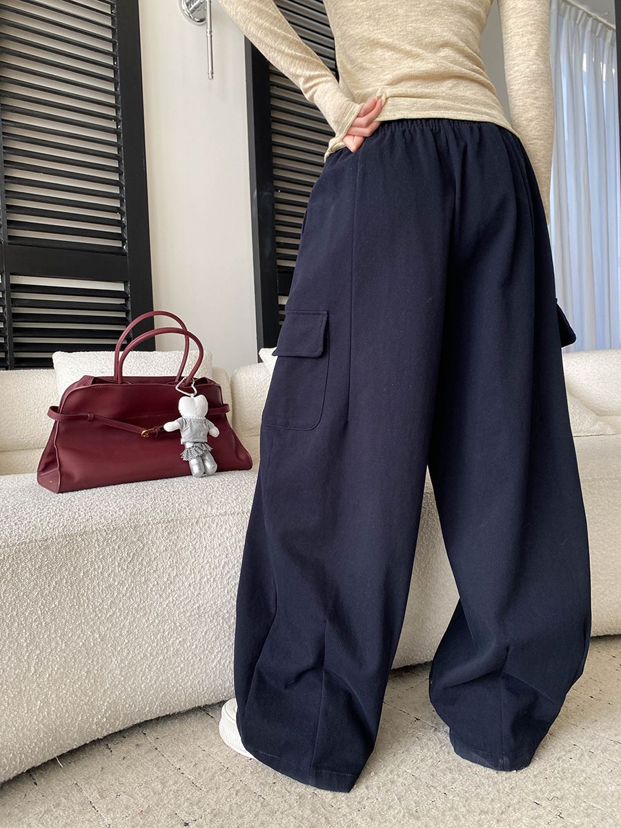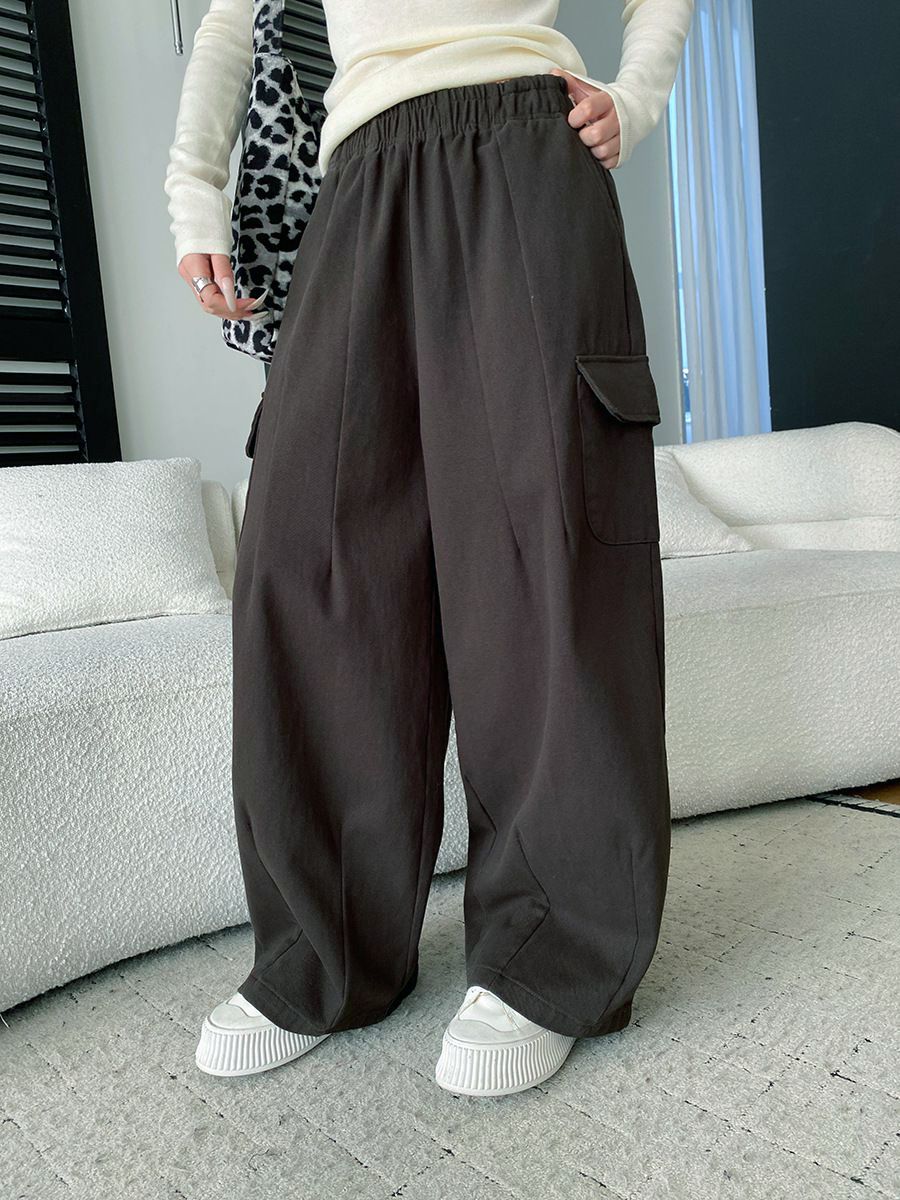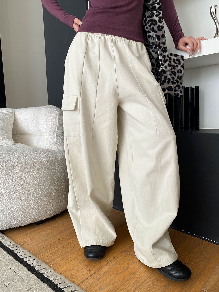 兩種尺寸/全腰鬆緊/立體車線/寬褲管/雙口袋 - 休閒居家渡假簡約百搭素面大口袋工裝褲長褲多尺寸ML米色深藍色深灰色
