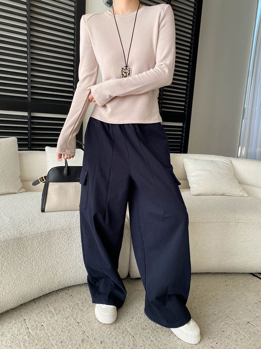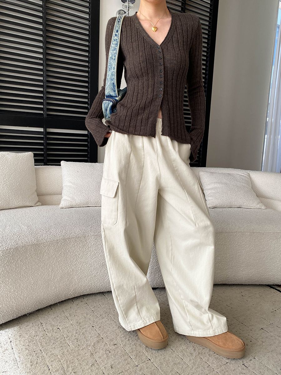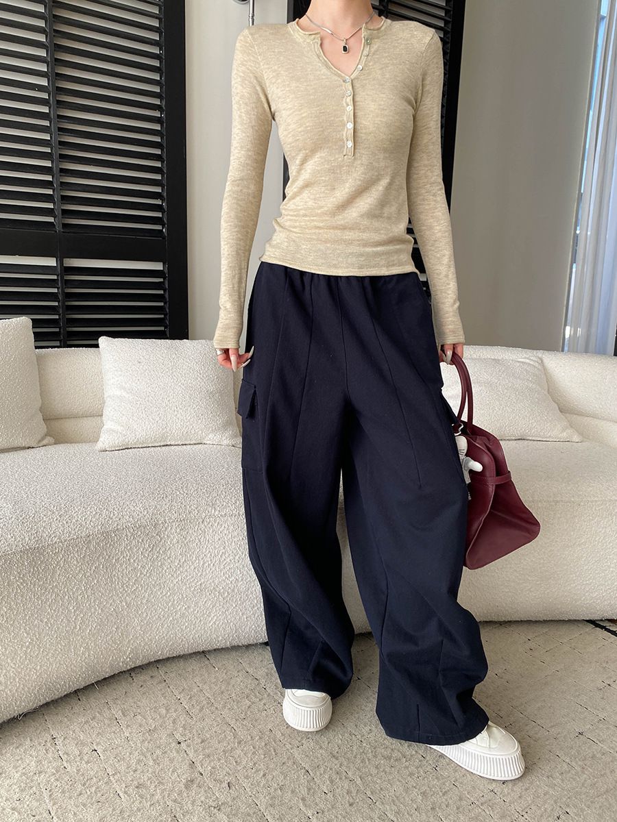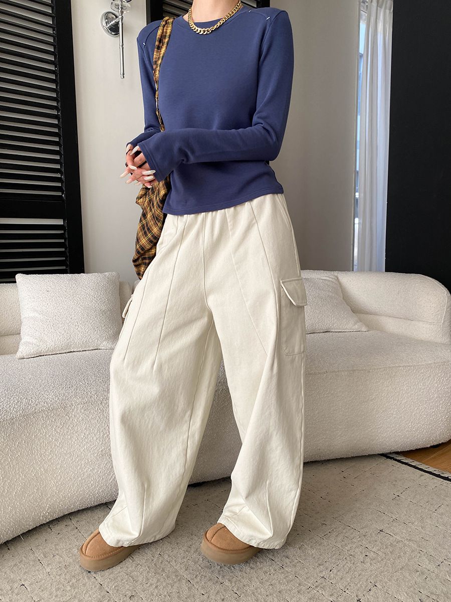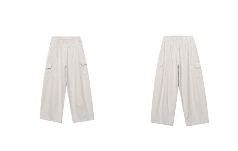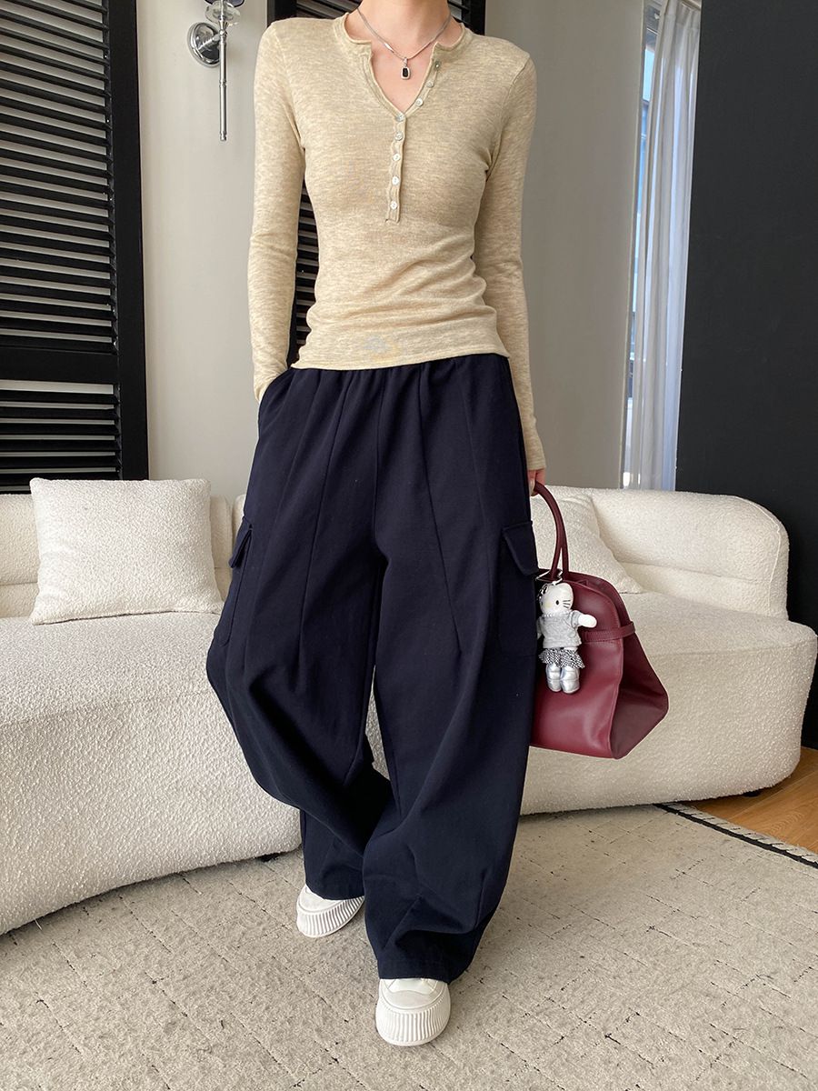 兩種尺寸/全腰鬆緊/立體車線/寬褲管/雙口袋 - 休閒居家渡假簡約百搭素面大口袋工裝褲長褲多尺寸ML米色深藍色深灰色