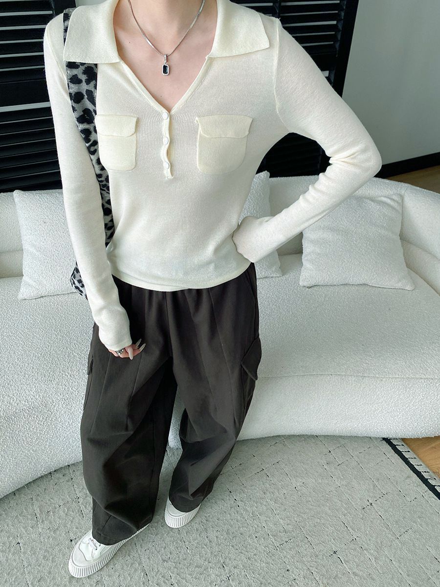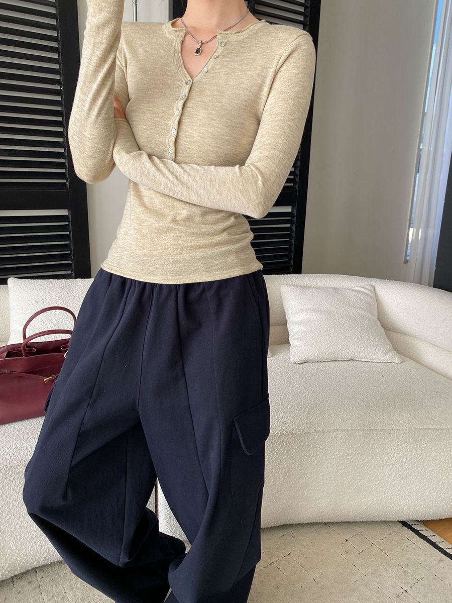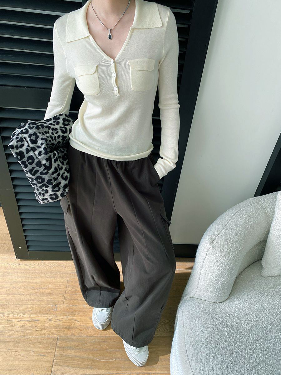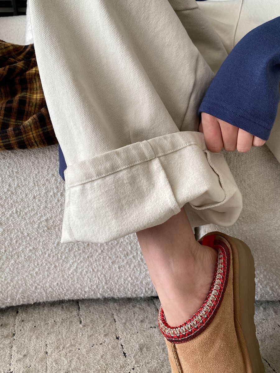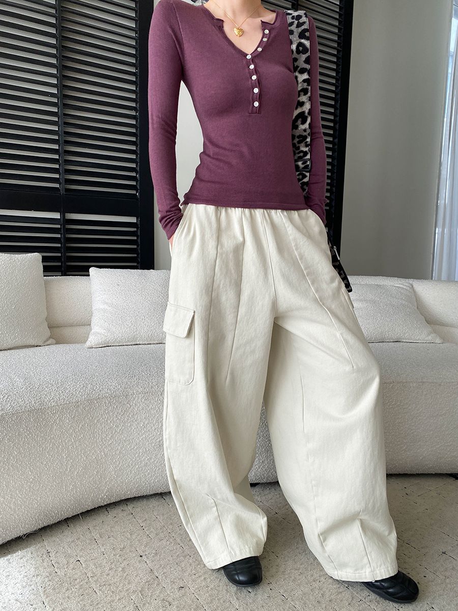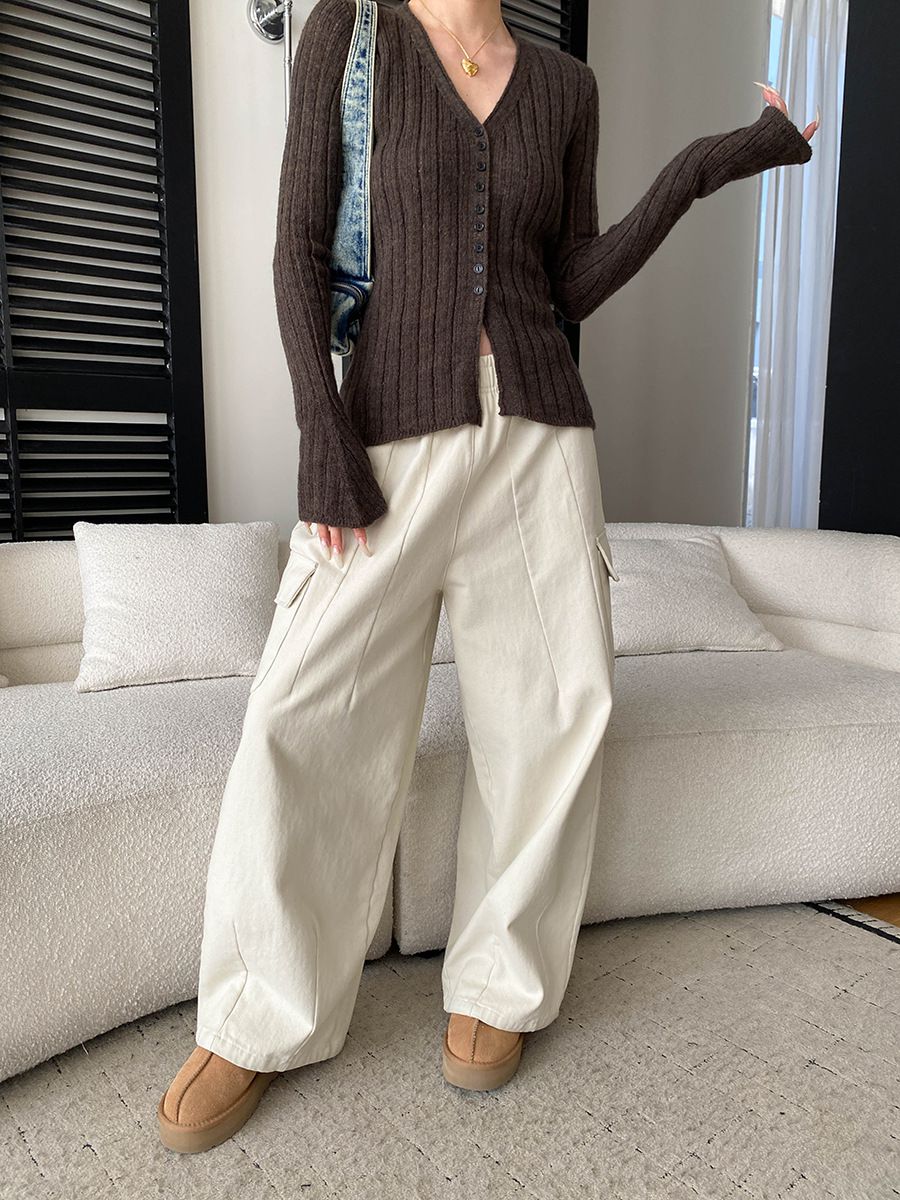 兩種尺寸/全腰鬆緊/立體車線/寬褲管/雙口袋 - 休閒居家渡假簡約百搭素面大口袋工裝褲長褲多尺寸ML米色深藍色深灰色