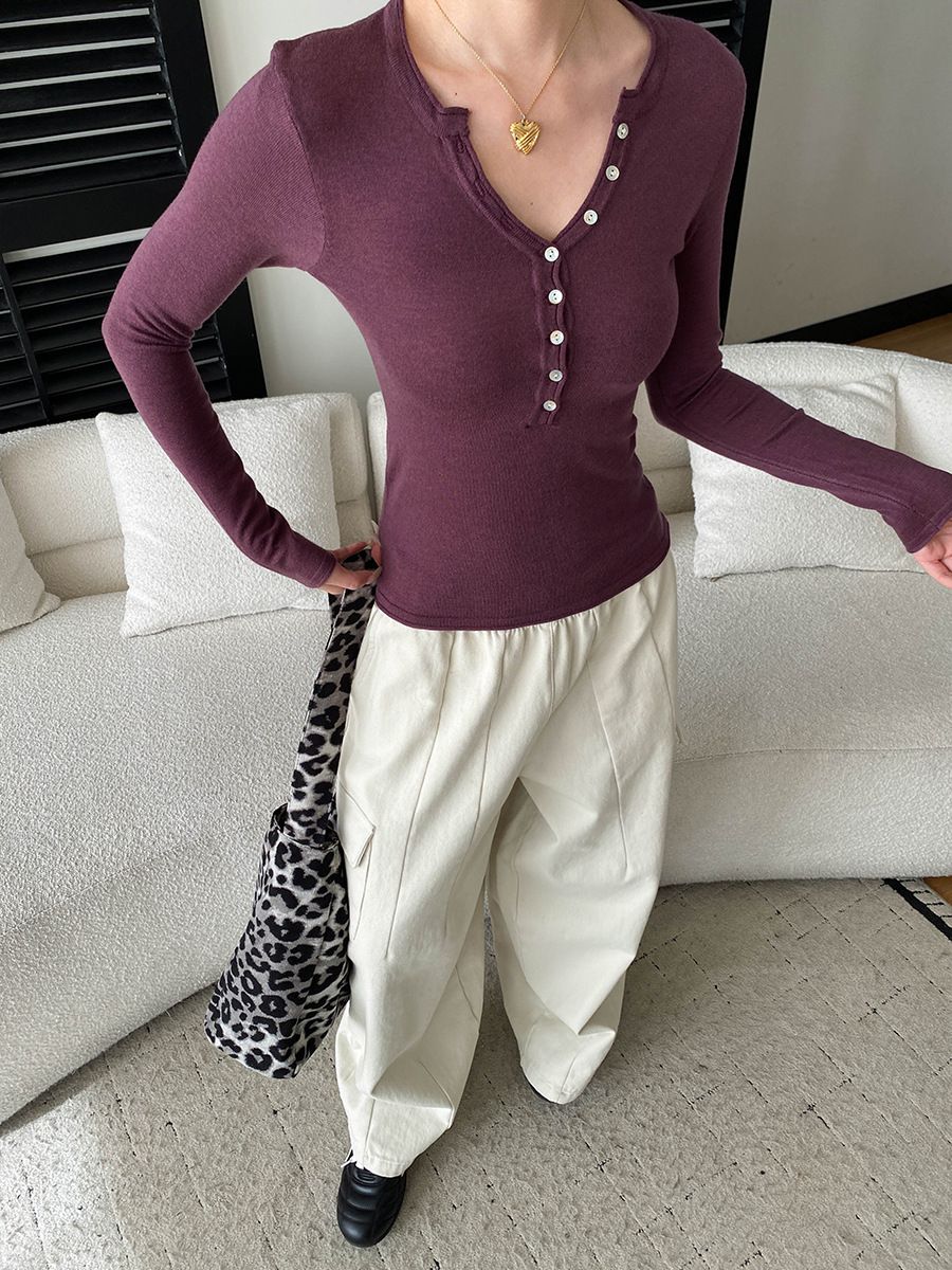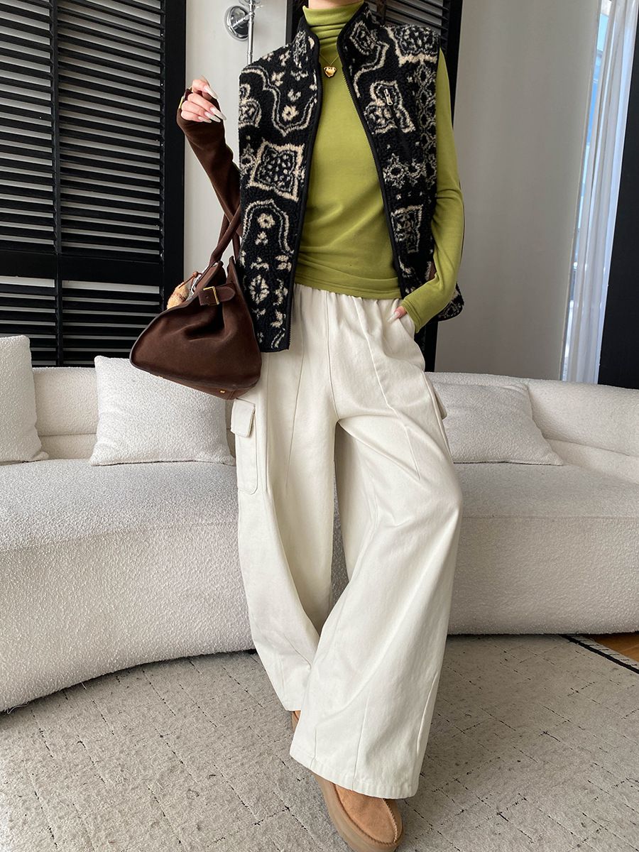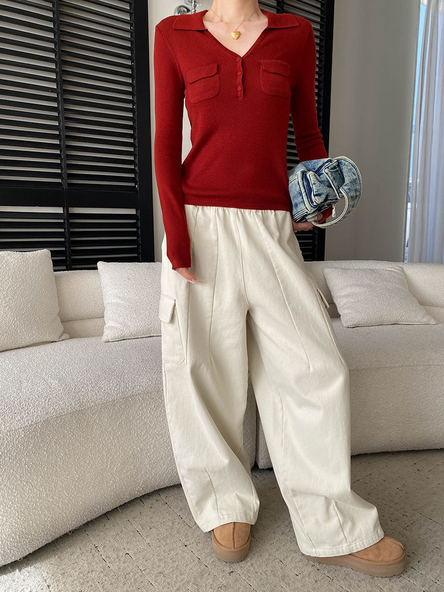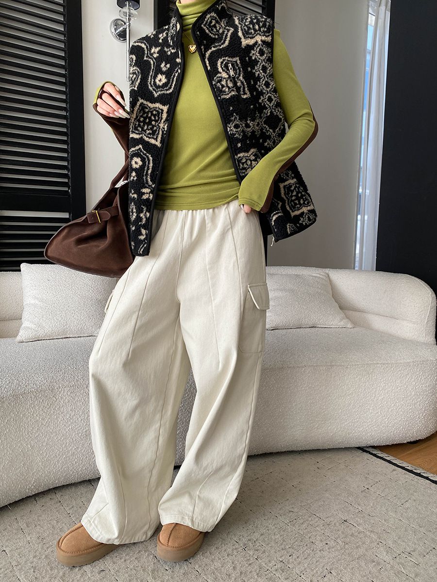 【C60134】品牌 大口袋工裝褲-素面全腰鬆緊立體車線寬褲管長褲★★