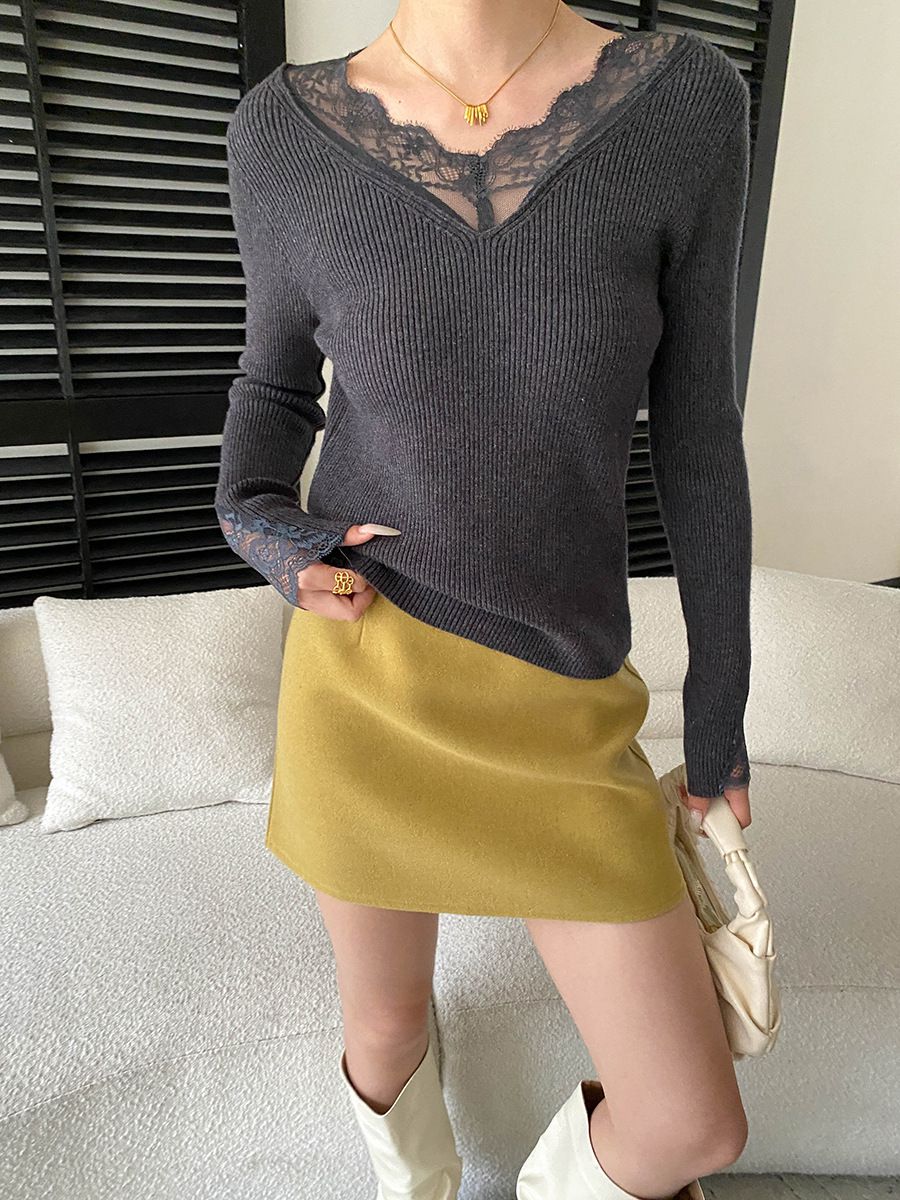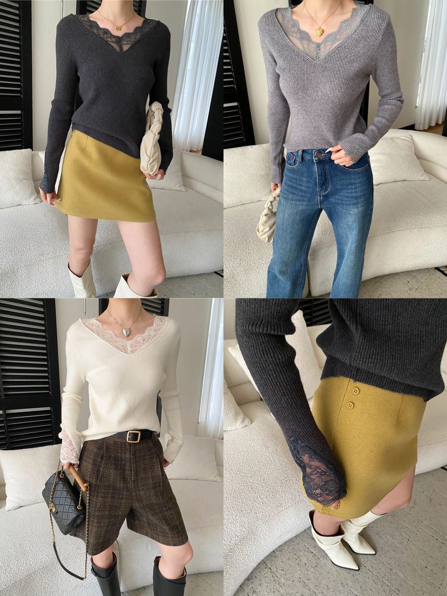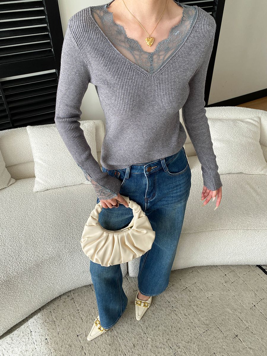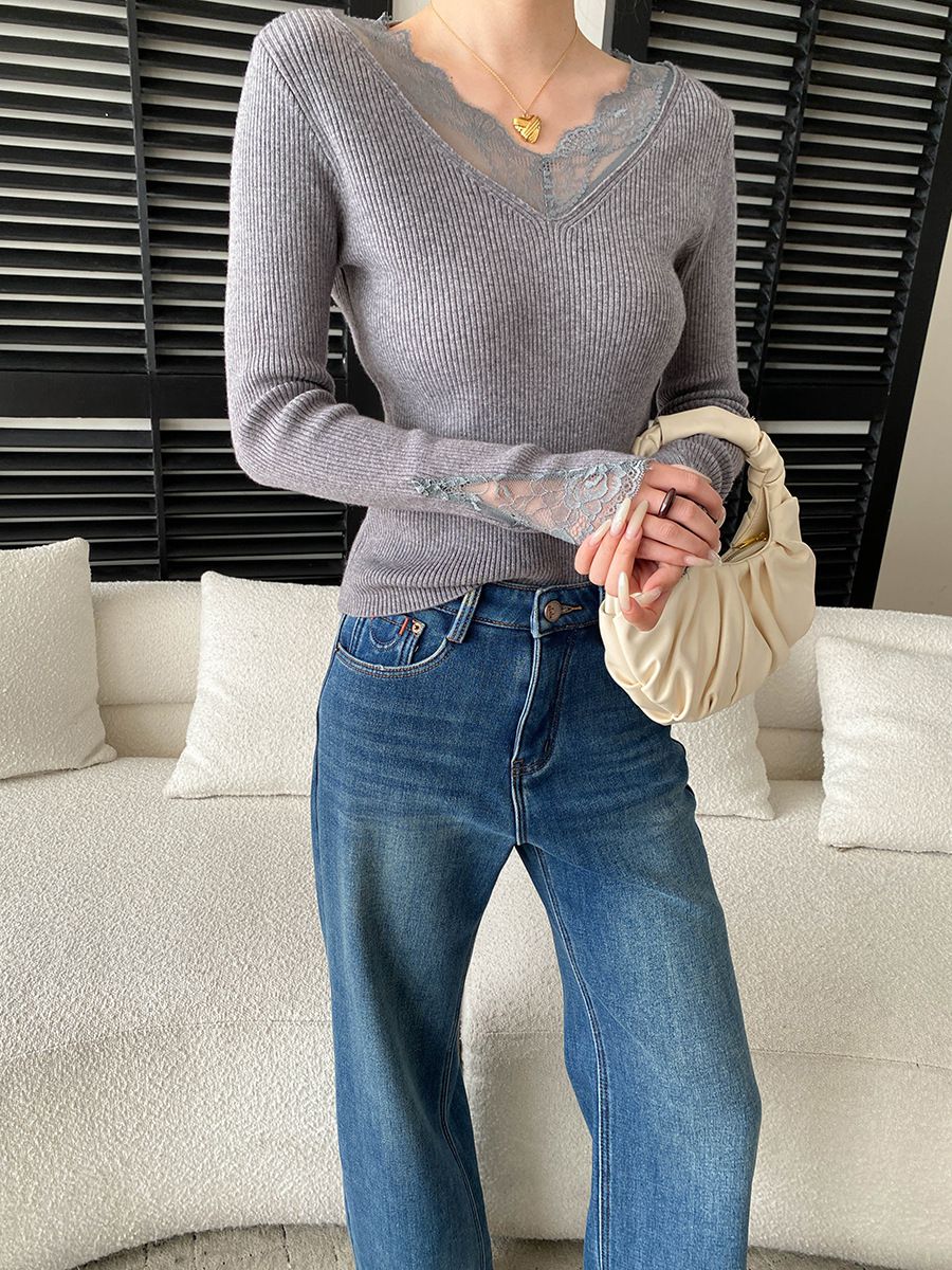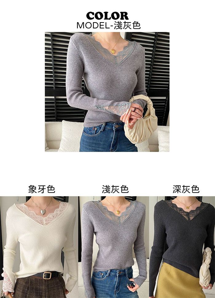 彈力坑條/合身內搭上衣/雕花蕾絲滾邊/透膚蕾絲/俐落短版/混羊毛針織衫 - 休閒居家婚禮簡約百搭素面蕾絲V領針織衫針織上衣長袖上衣象牙色淺灰色深灰色