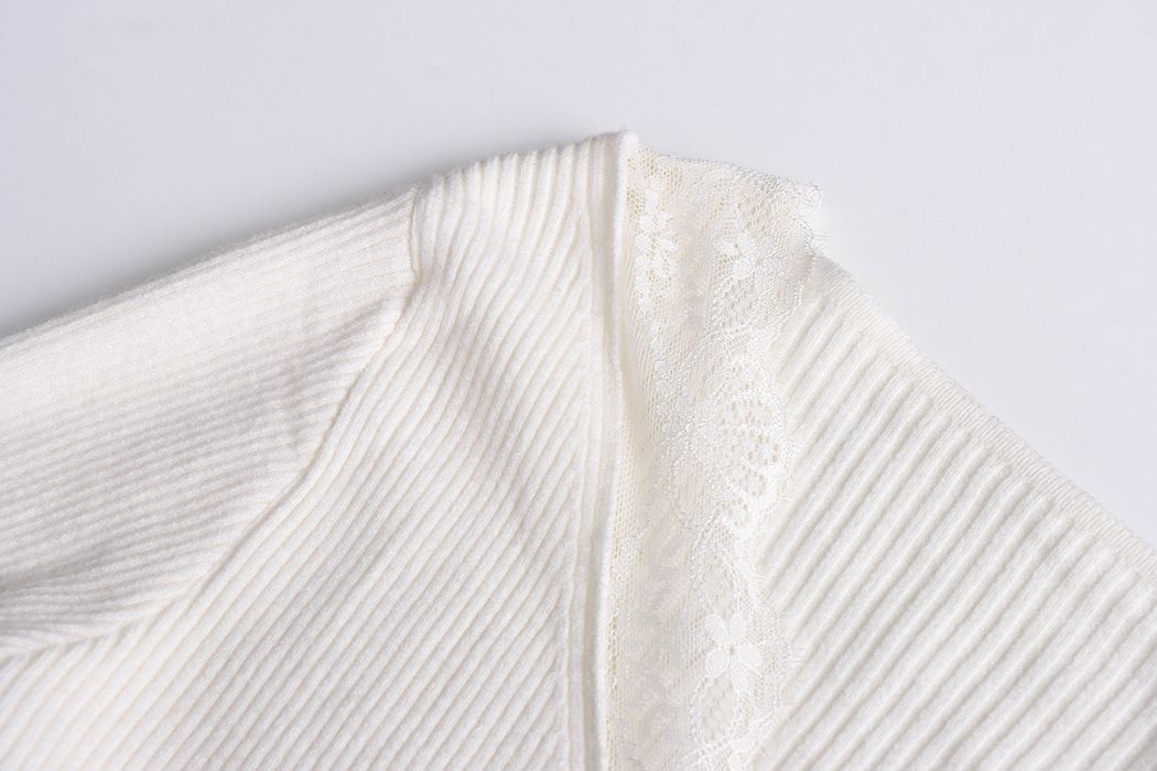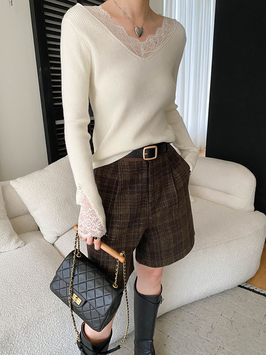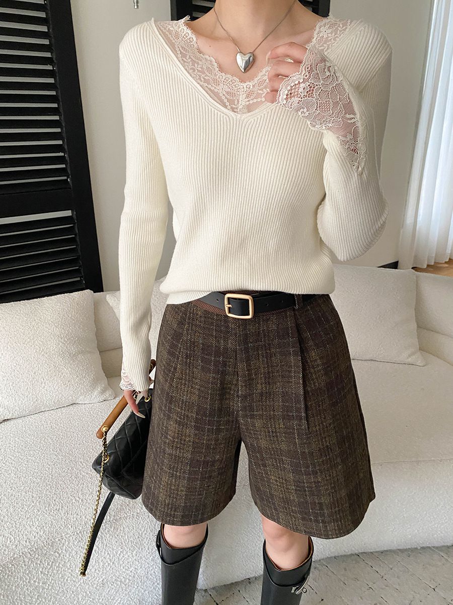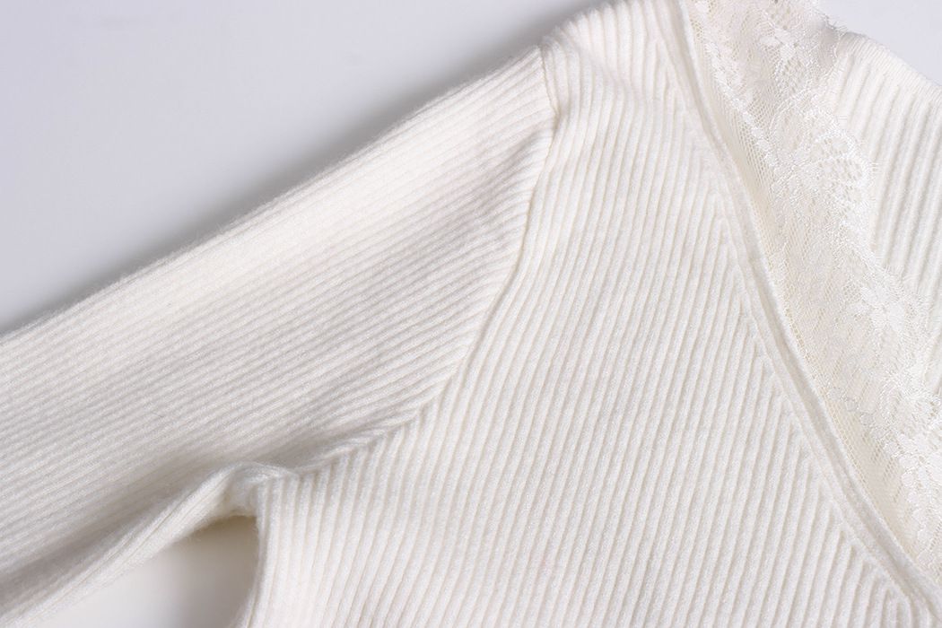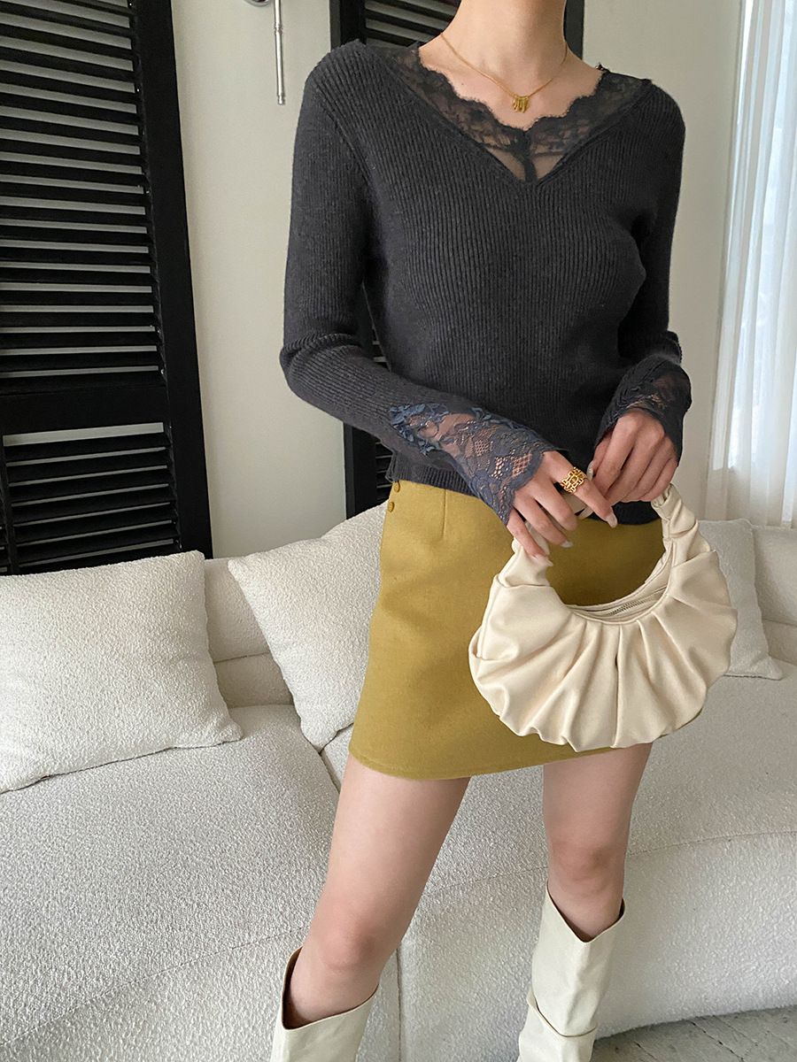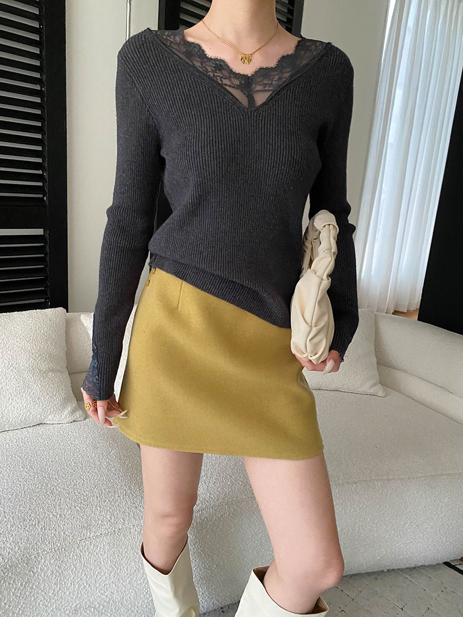 彈力坑條/合身內搭上衣/雕花蕾絲滾邊/透膚蕾絲/俐落短版/混羊毛針織衫 - 休閒居家婚禮簡約百搭素面蕾絲V領針織衫針織上衣長袖上衣象牙色淺灰色深灰色