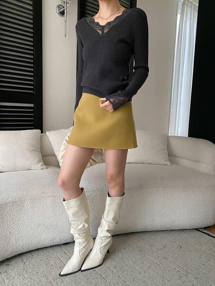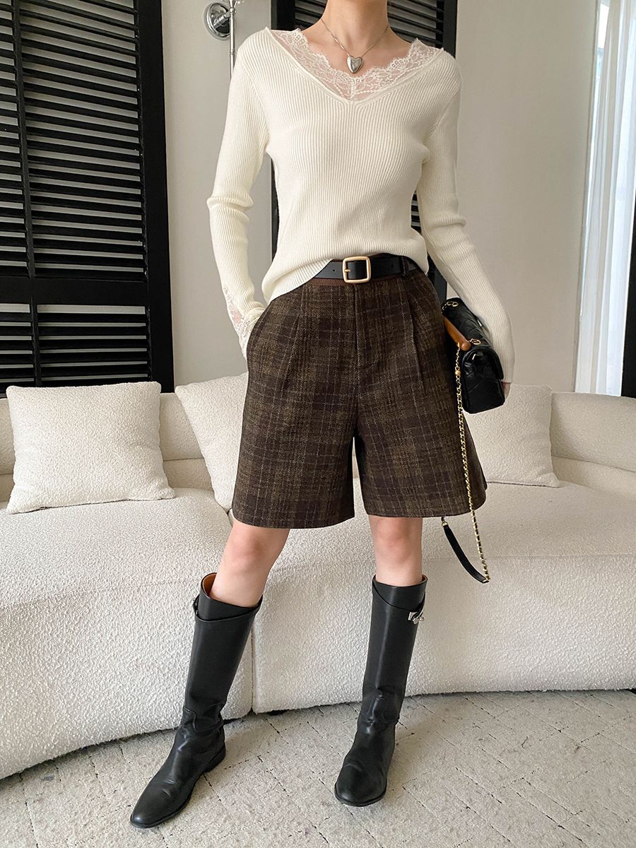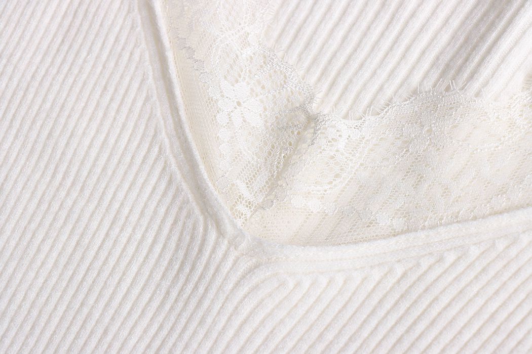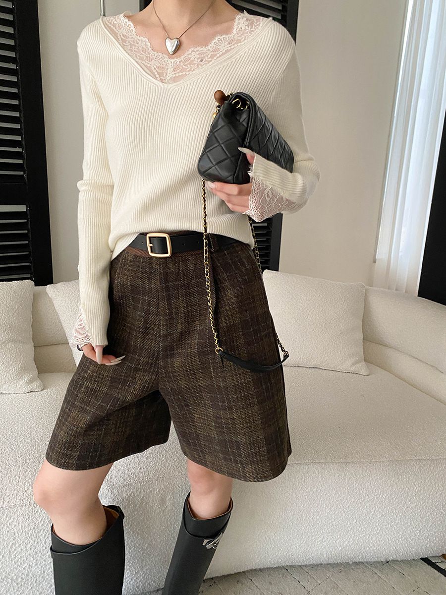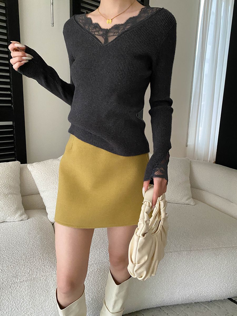 彈力坑條/合身內搭上衣/雕花蕾絲滾邊/透膚蕾絲/俐落短版/混羊毛針織衫 - 休閒居家婚禮簡約百搭素面蕾絲V領針織衫針織上衣長袖上衣象牙色淺灰色深灰色