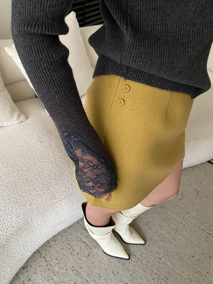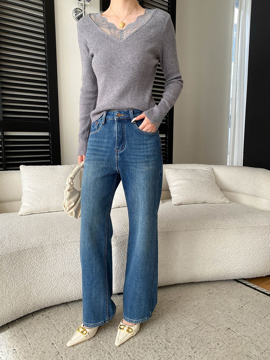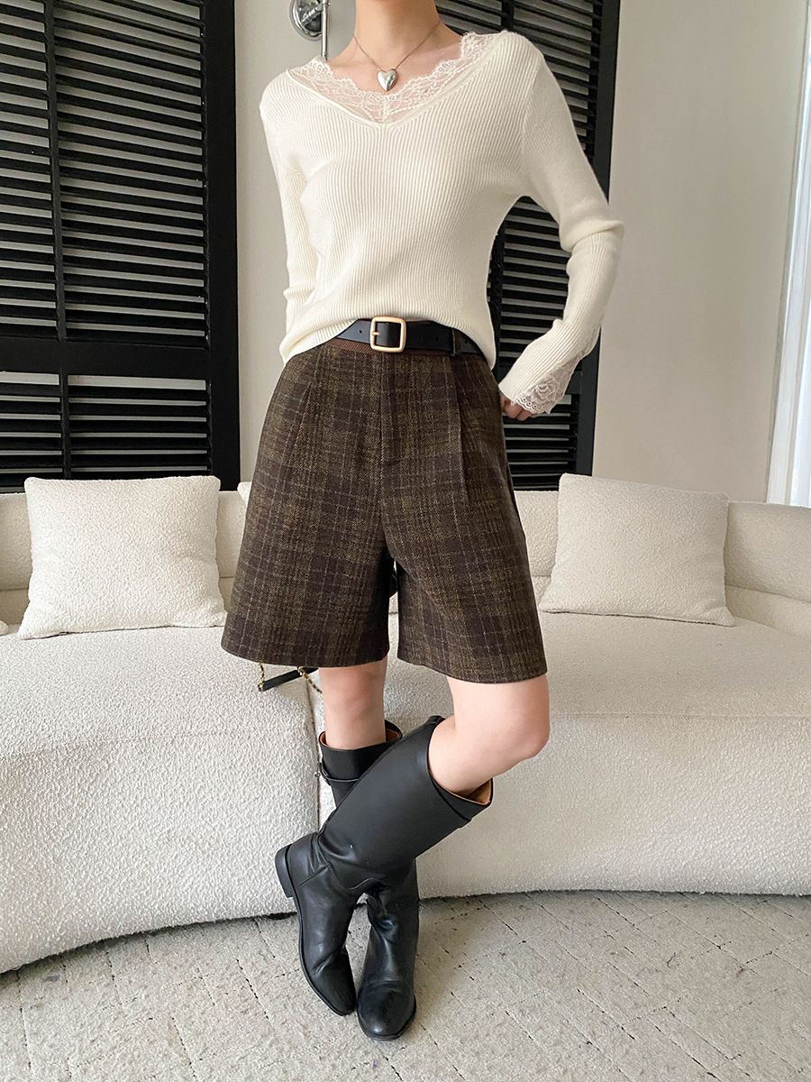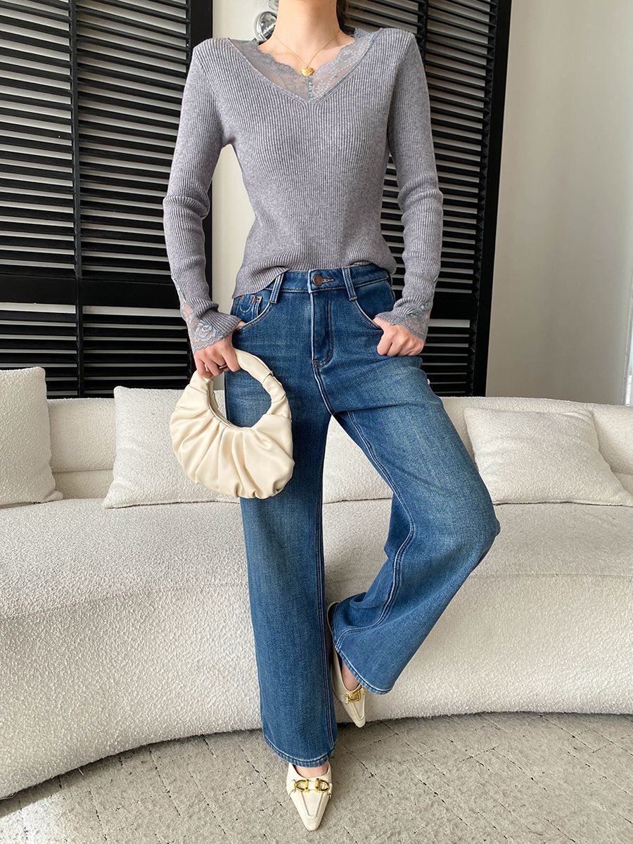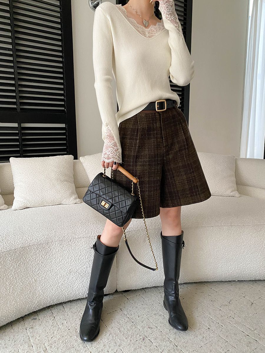 彈力坑條/合身內搭上衣/雕花蕾絲滾邊/透膚蕾絲/俐落短版/混羊毛針織衫 - 休閒居家婚禮簡約百搭素面蕾絲V領針織衫針織上衣長袖上衣象牙色淺灰色深灰色