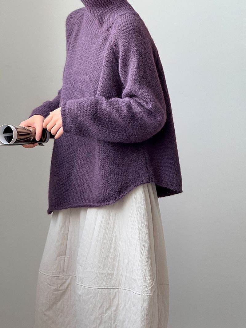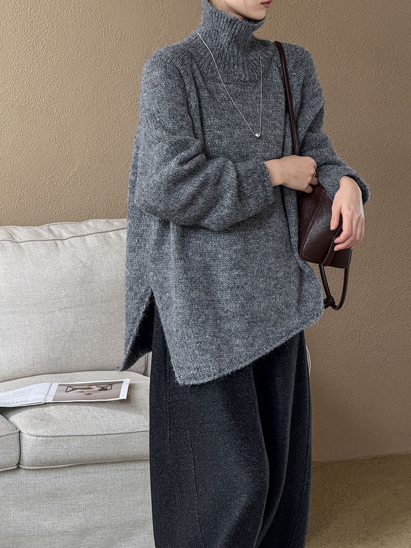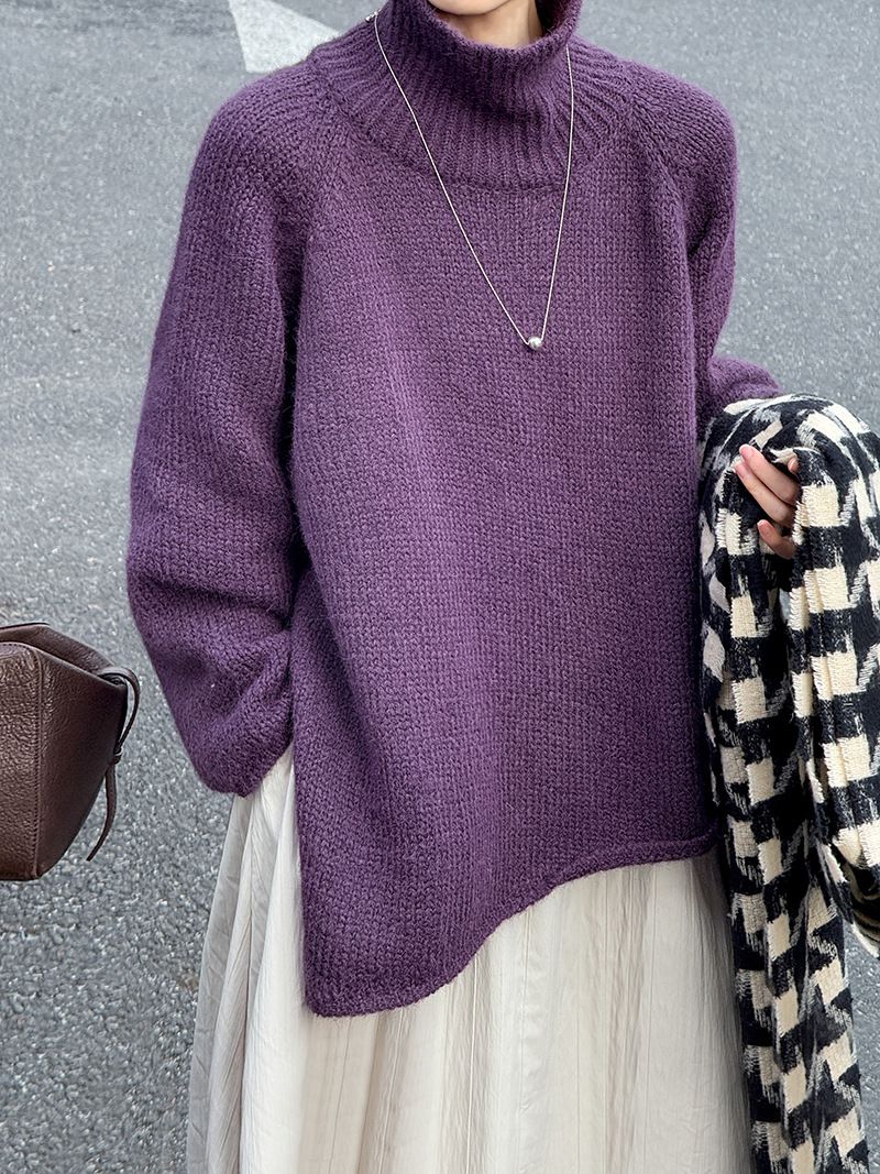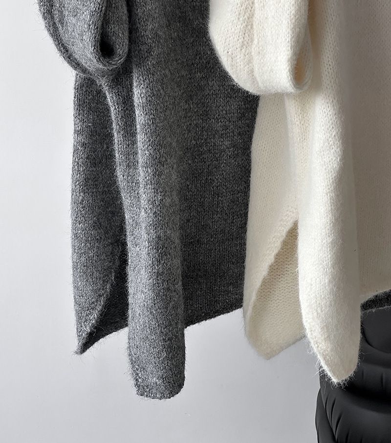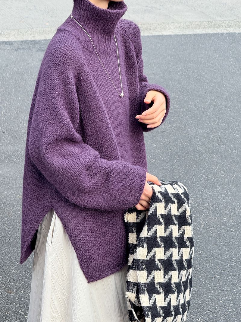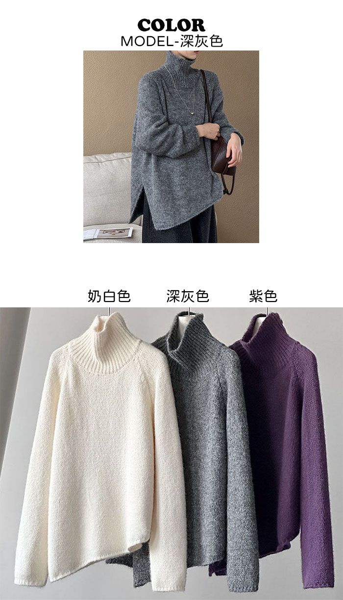 好氣色/斜邊不對稱/不規則側開衩/側高衩/立領/寬鬆長版/連肩袖 - 休閒居家簡約百搭素面斜邊針織衫長袖上衣寬鬆大尺碼上衣長版上衣奶白色深灰色紫色