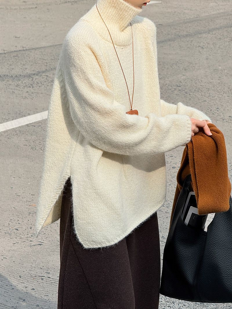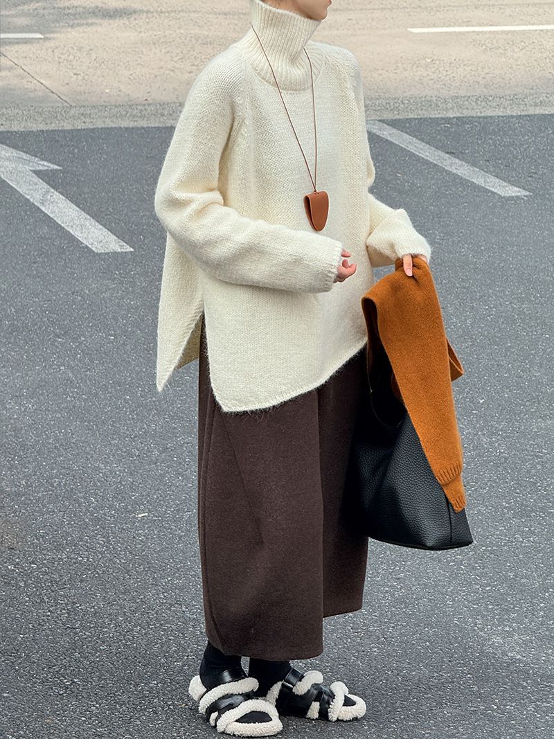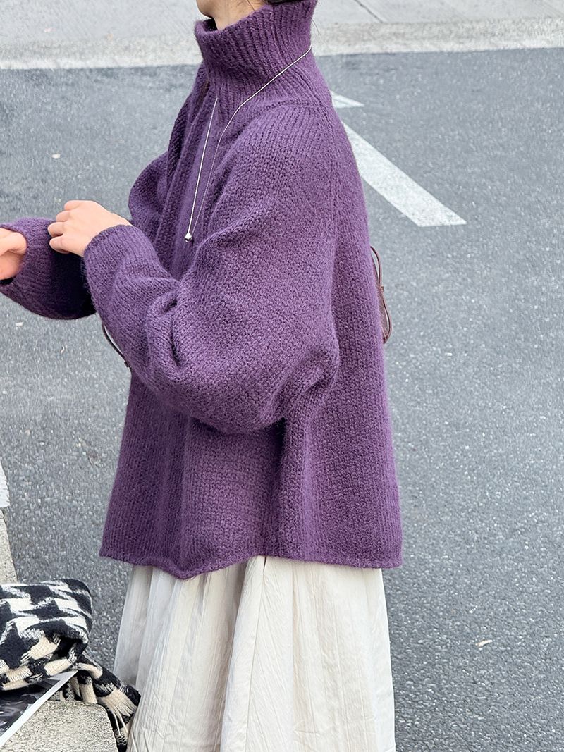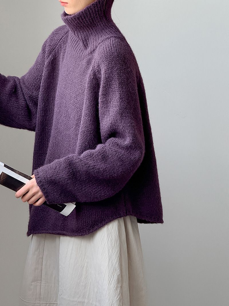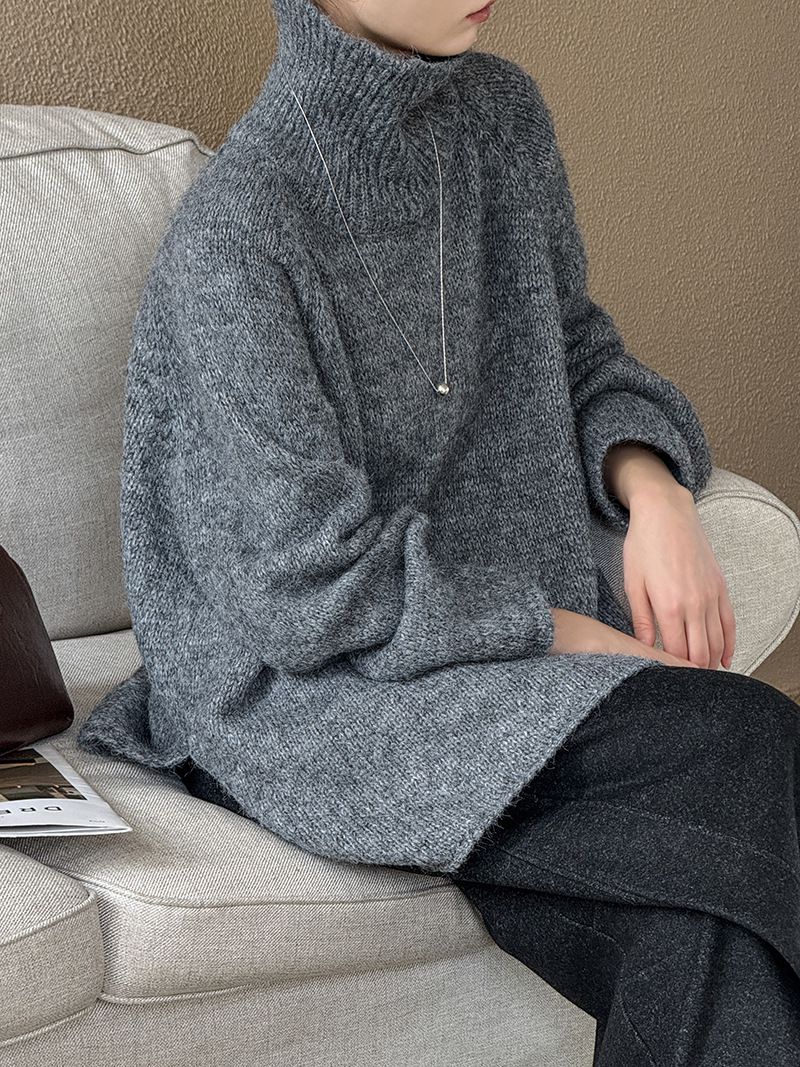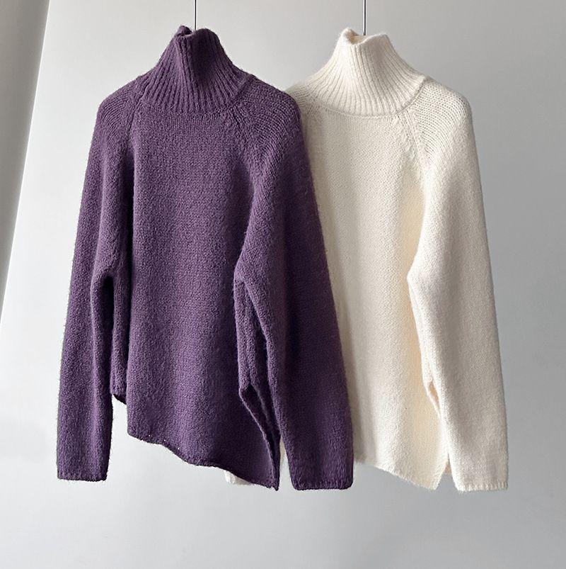 好氣色/斜邊不對稱/不規則側開衩/側高衩/立領/寬鬆長版/連肩袖 - 休閒居家簡約百搭素面斜邊針織衫長袖上衣寬鬆大尺碼上衣長版上衣奶白色深灰色紫色