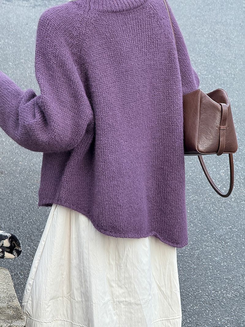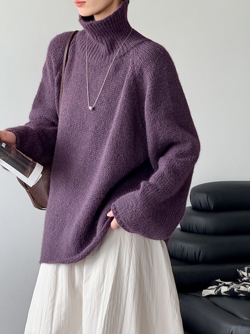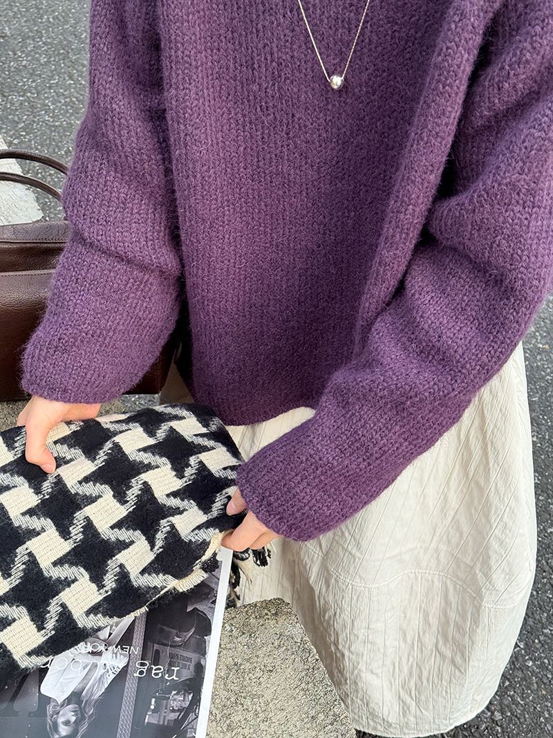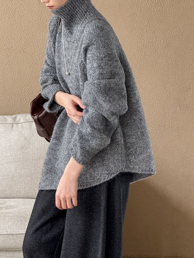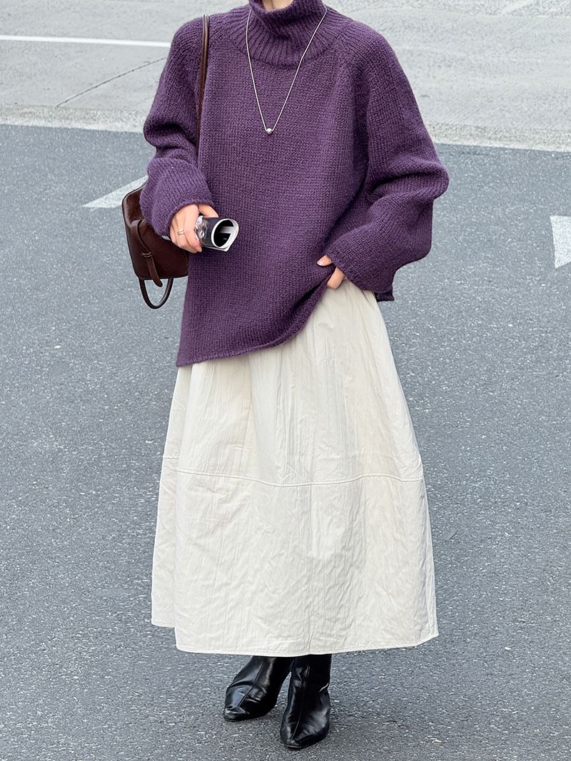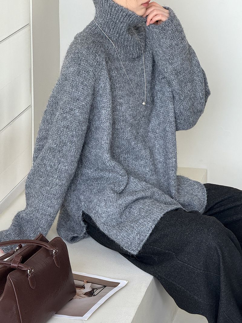 好氣色/斜邊不對稱/不規則側開衩/側高衩/立領/寬鬆長版/連肩袖 - 休閒居家簡約百搭素面斜邊針織衫長袖上衣寬鬆大尺碼上衣長版上衣奶白色深灰色紫色