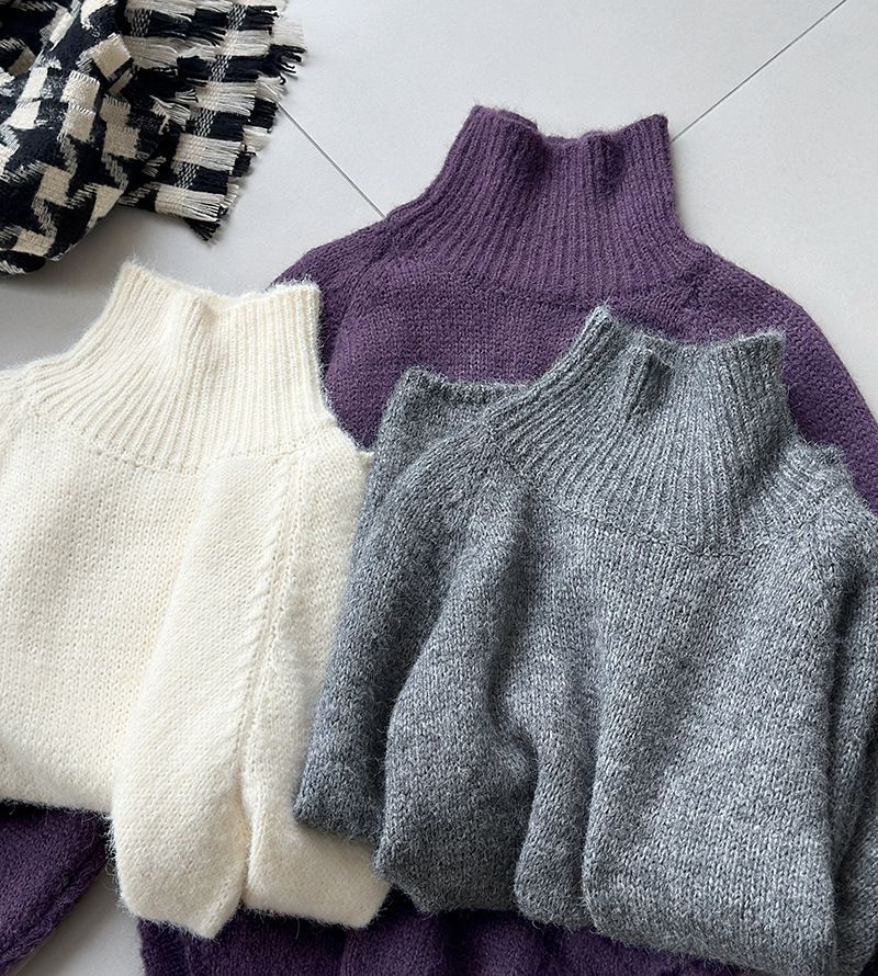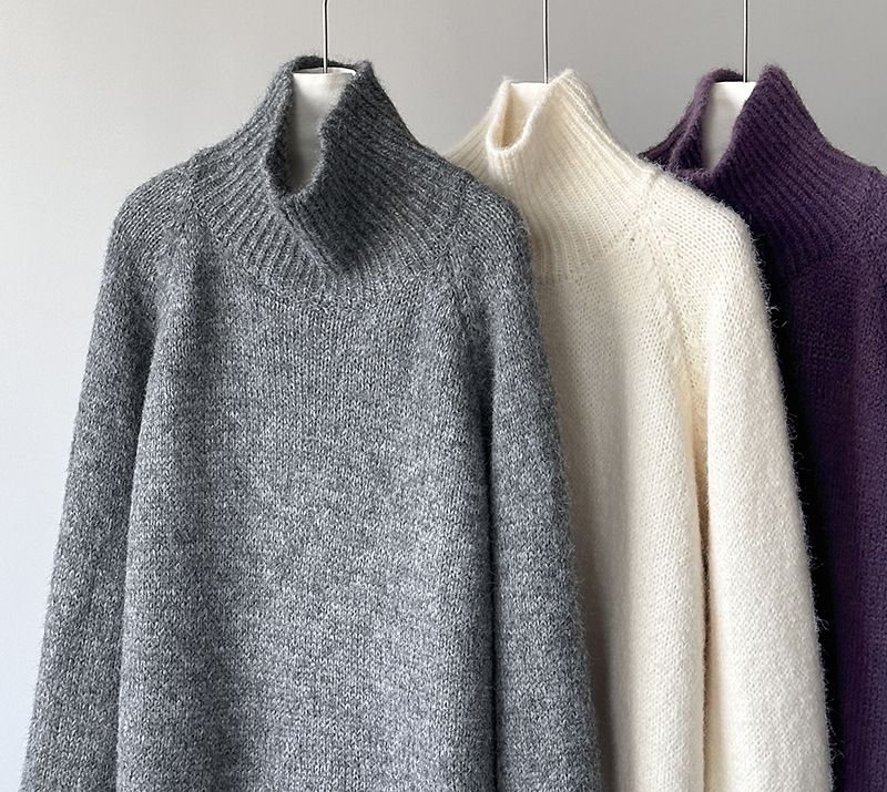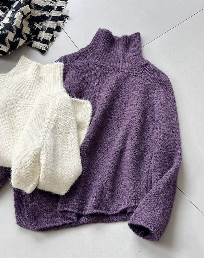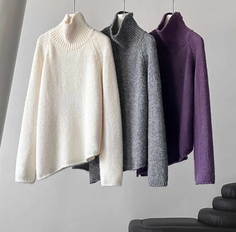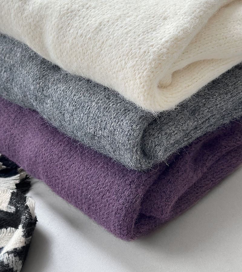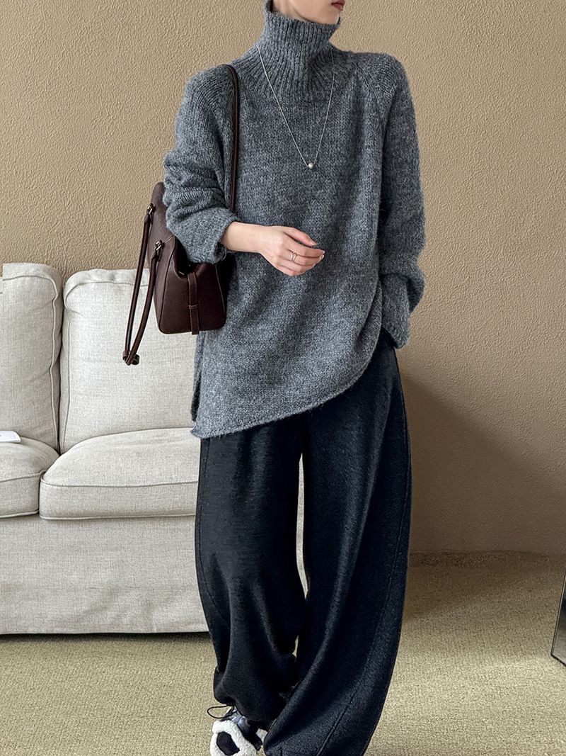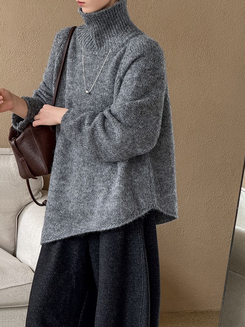 好氣色/斜邊不對稱/不規則側開衩/側高衩/立領/寬鬆長版/連肩袖 - 休閒居家簡約百搭素面斜邊針織衫長袖上衣寬鬆大尺碼上衣長版上衣奶白色深灰色紫色
