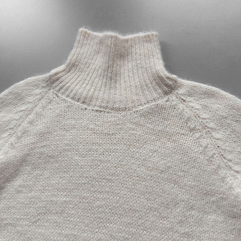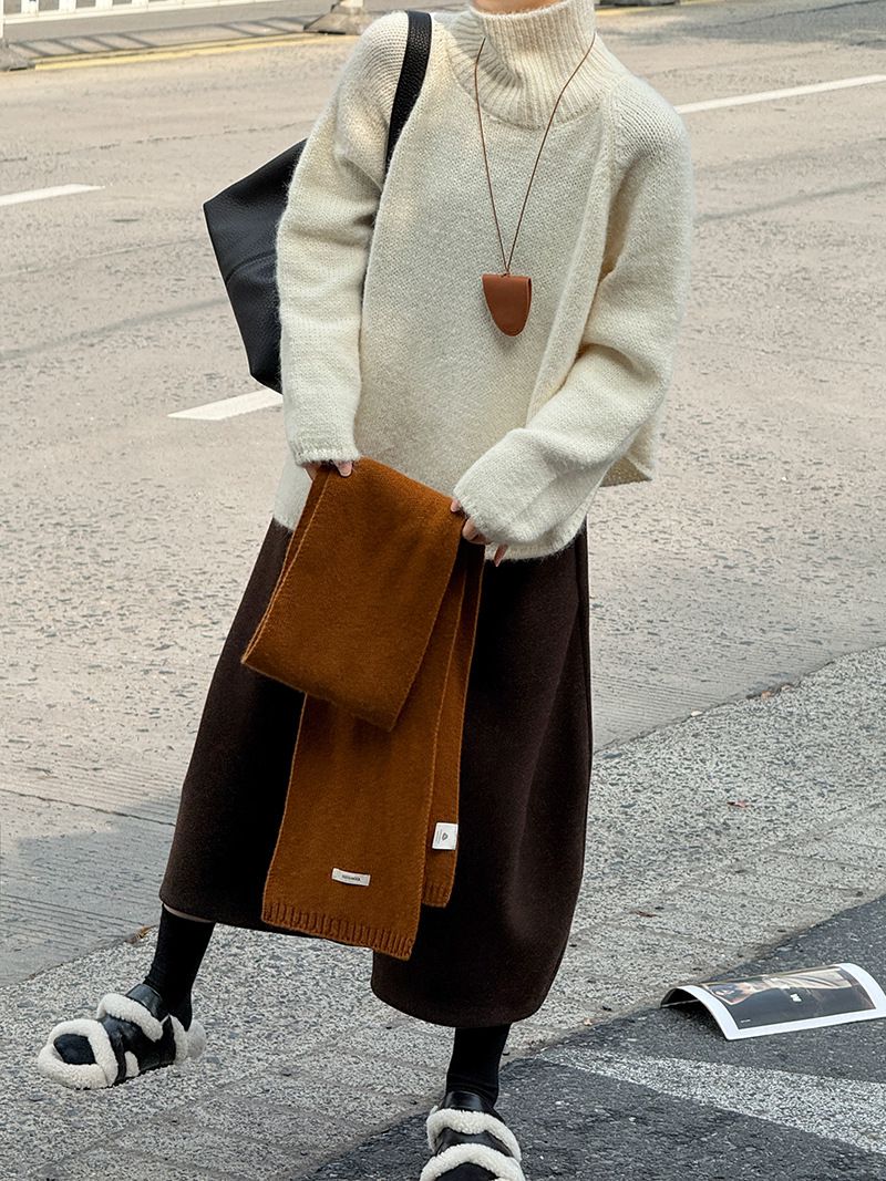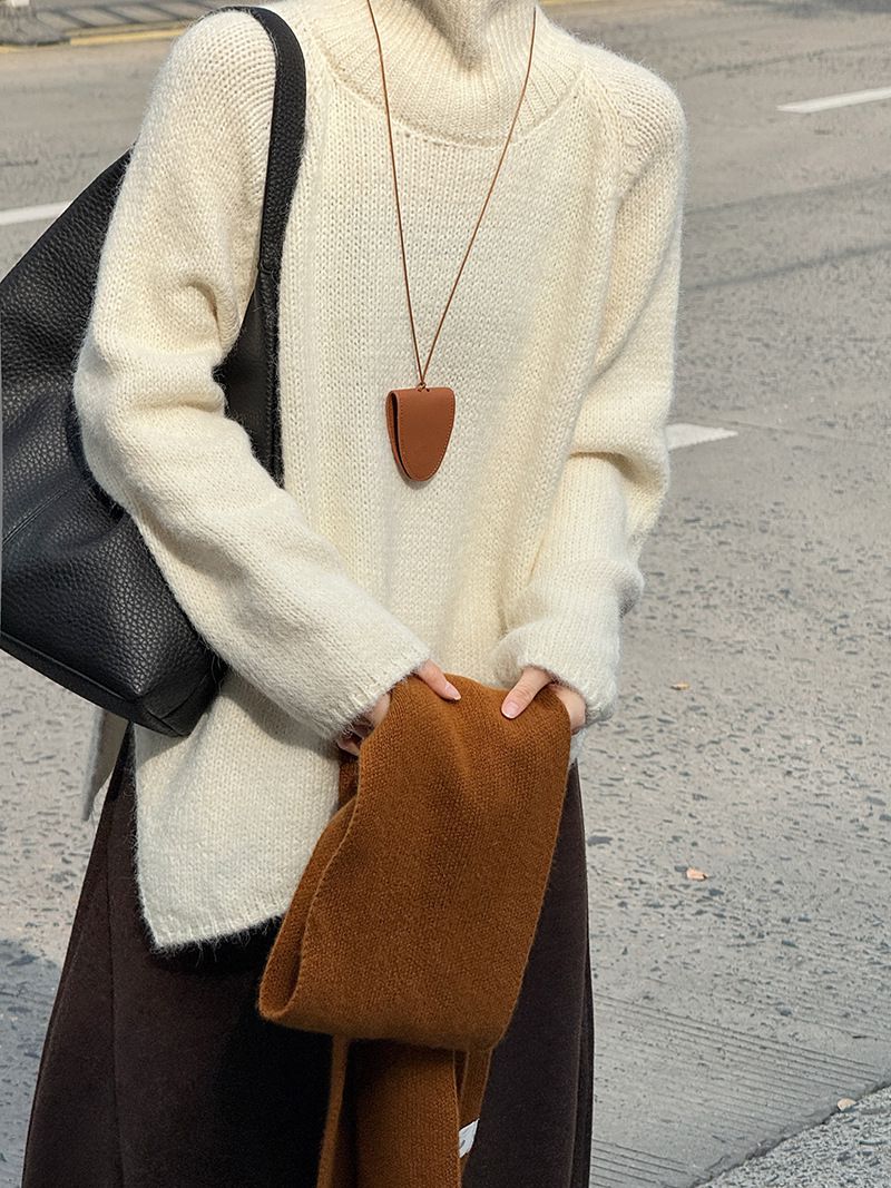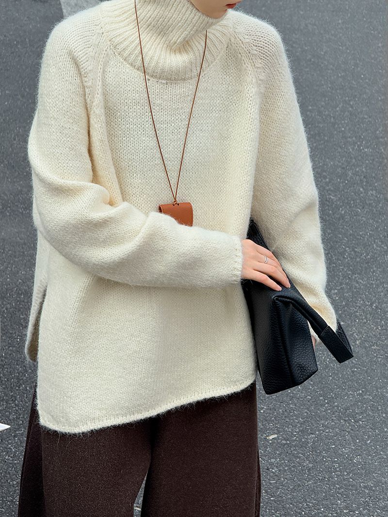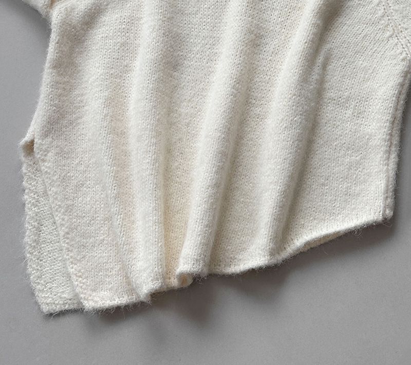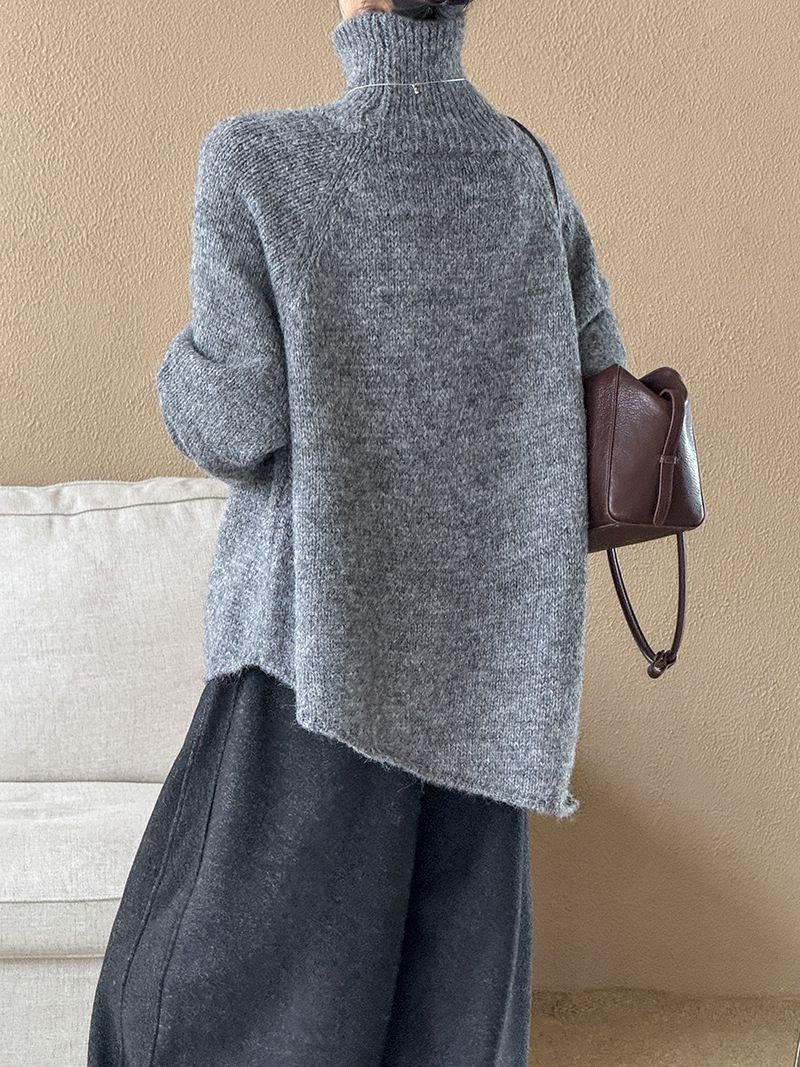 好氣色/斜邊不對稱/不規則側開衩/側高衩/立領/寬鬆長版/連肩袖 - 休閒居家簡約百搭素面斜邊針織衫長袖上衣寬鬆大尺碼上衣長版上衣奶白色深灰色紫色