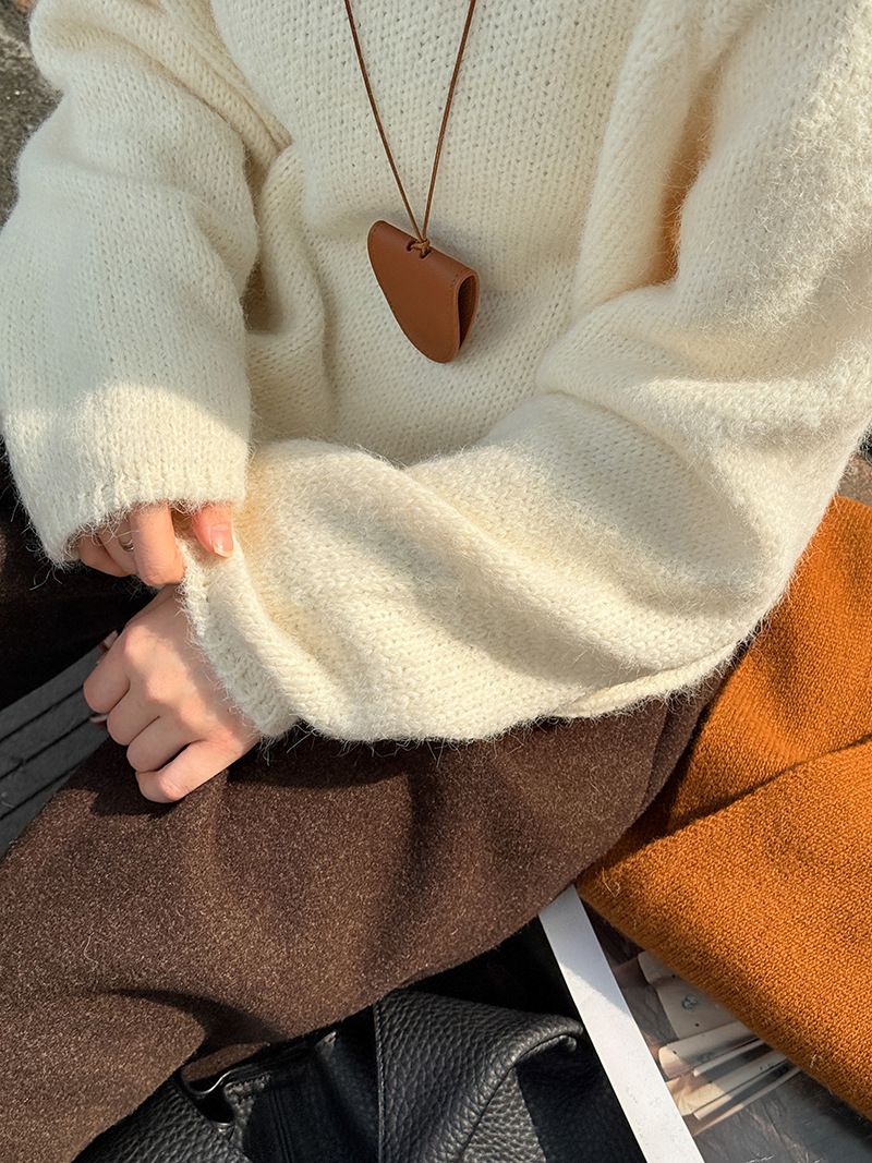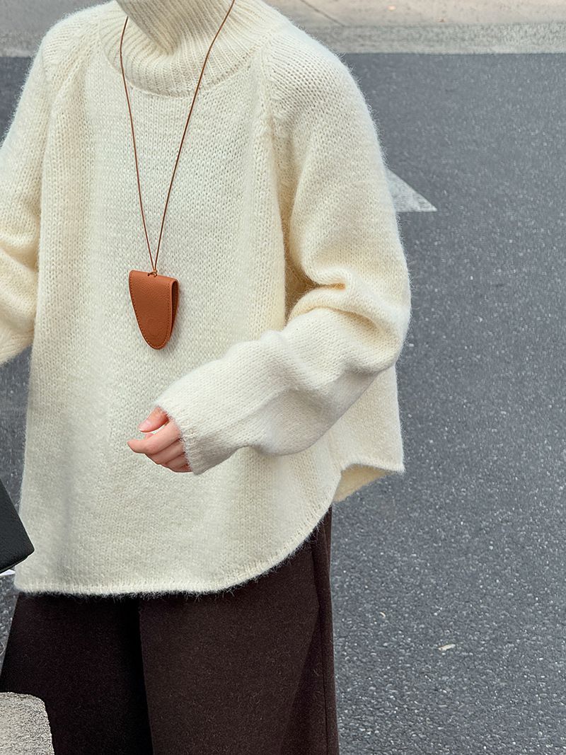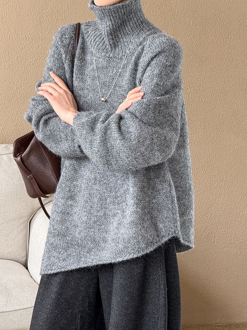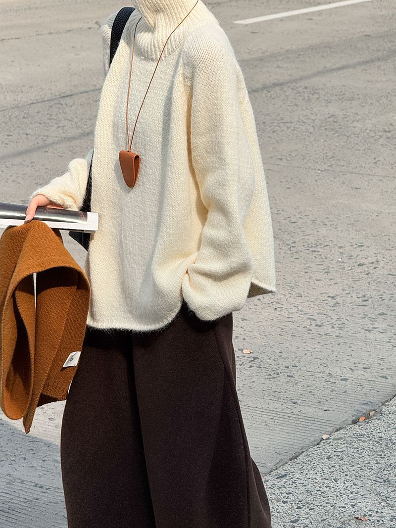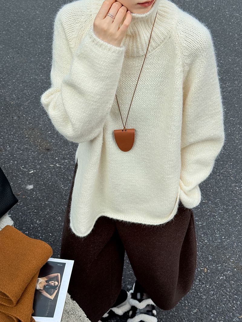 【C60144】品牌 斜邊針織衫-不對稱好氣色素面立領長袖寬鬆上衣