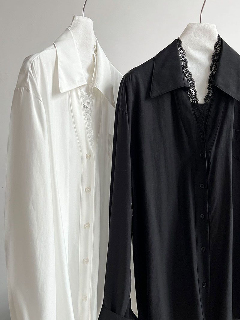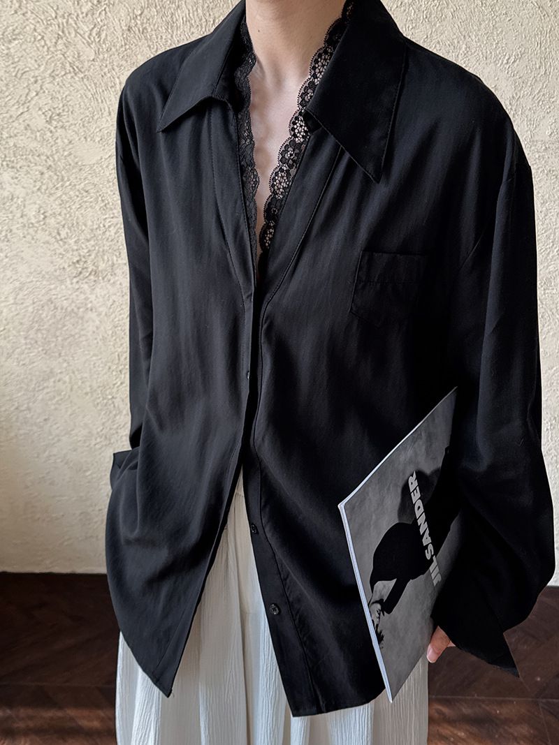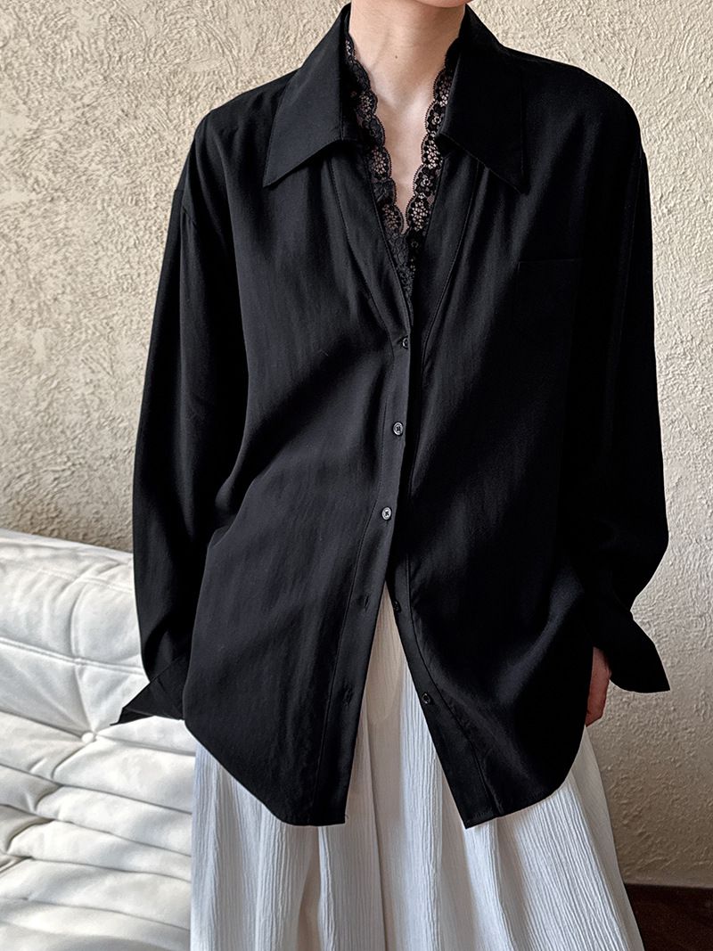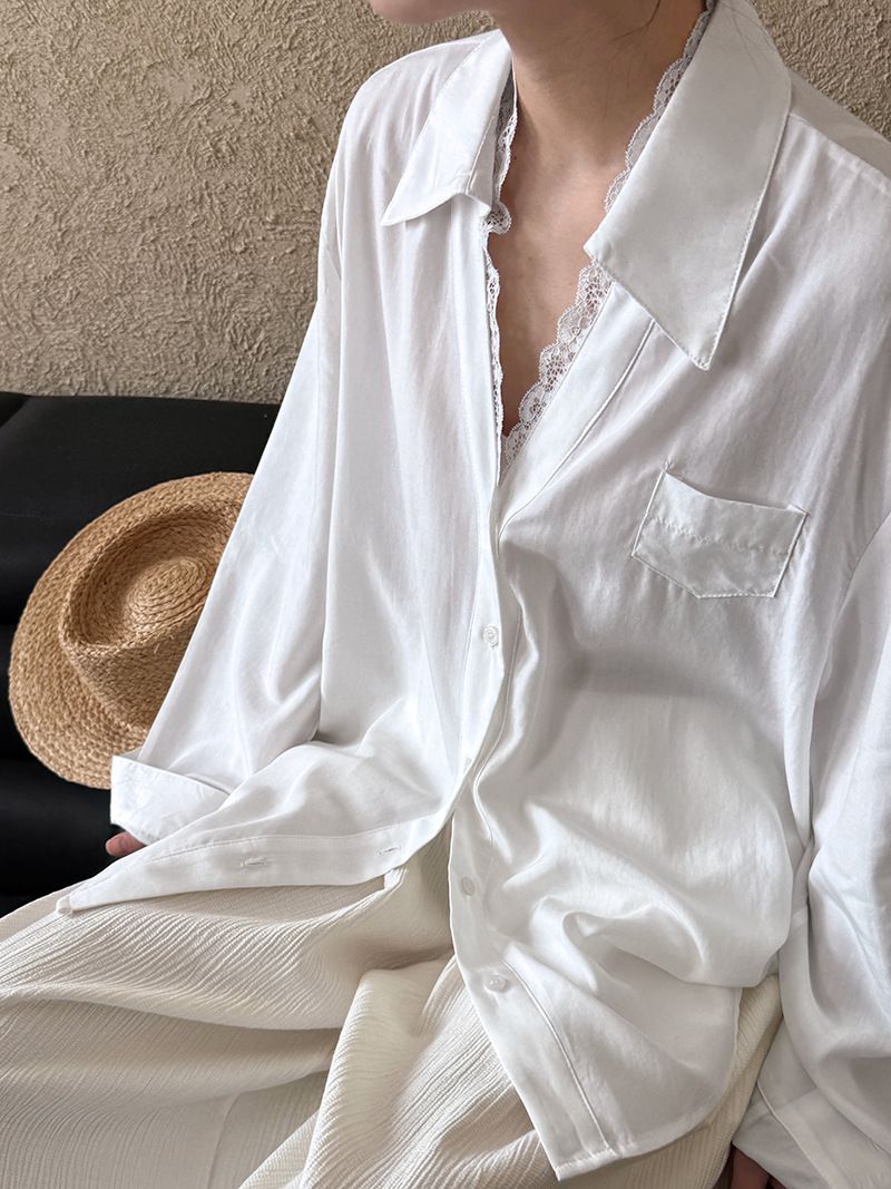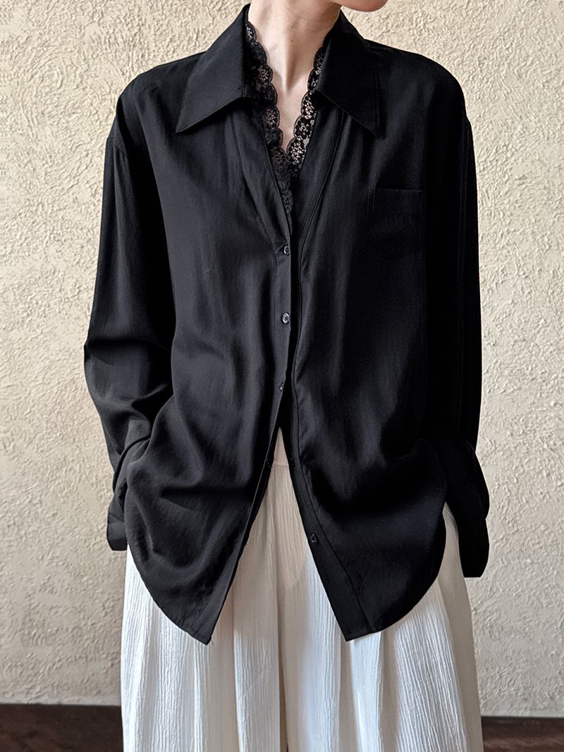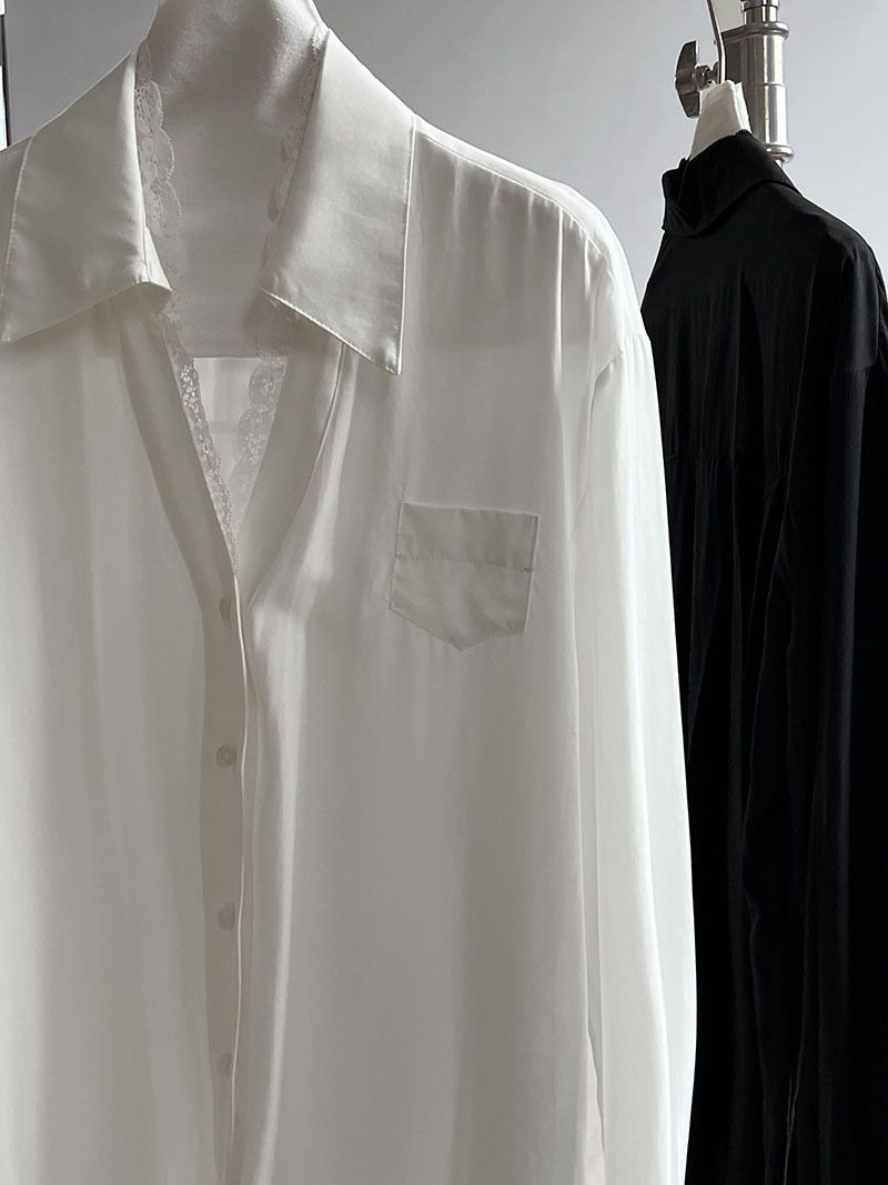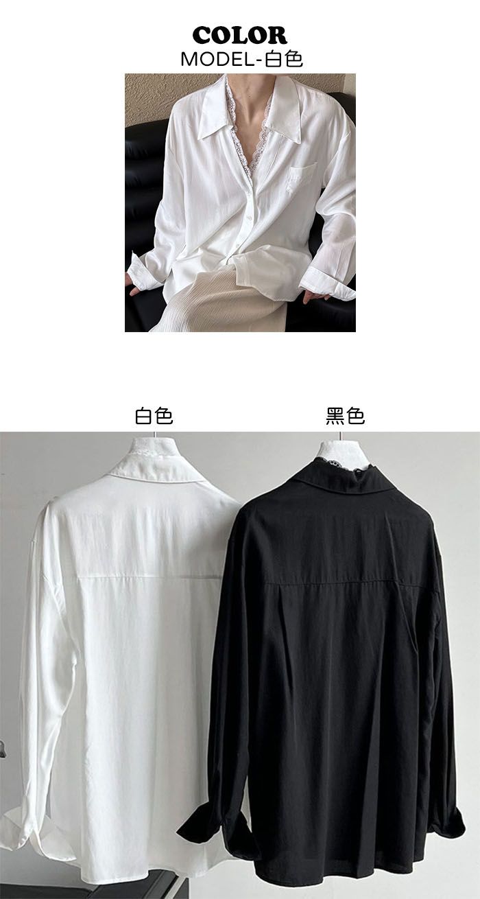 兩種尺寸/胸前口袋/絲滑天絲/寬鬆長版/蕾絲滾邊V領/開襟排釦 - 休閒居家婚禮OL上班族簡約百搭素面蕾絲V領襯衫上衣長袖上衣寬鬆大尺碼上衣長版上衣多尺寸ML黑色白色