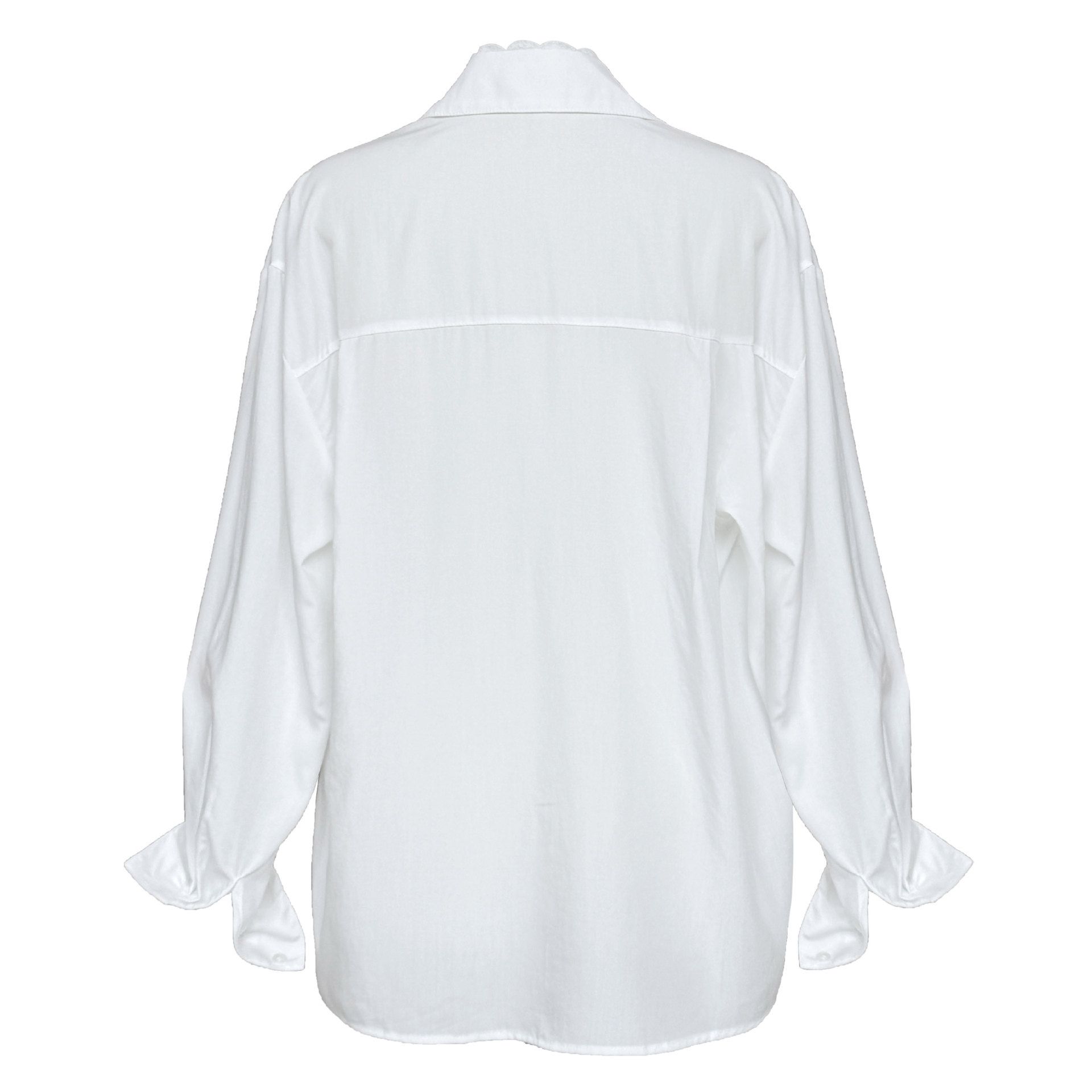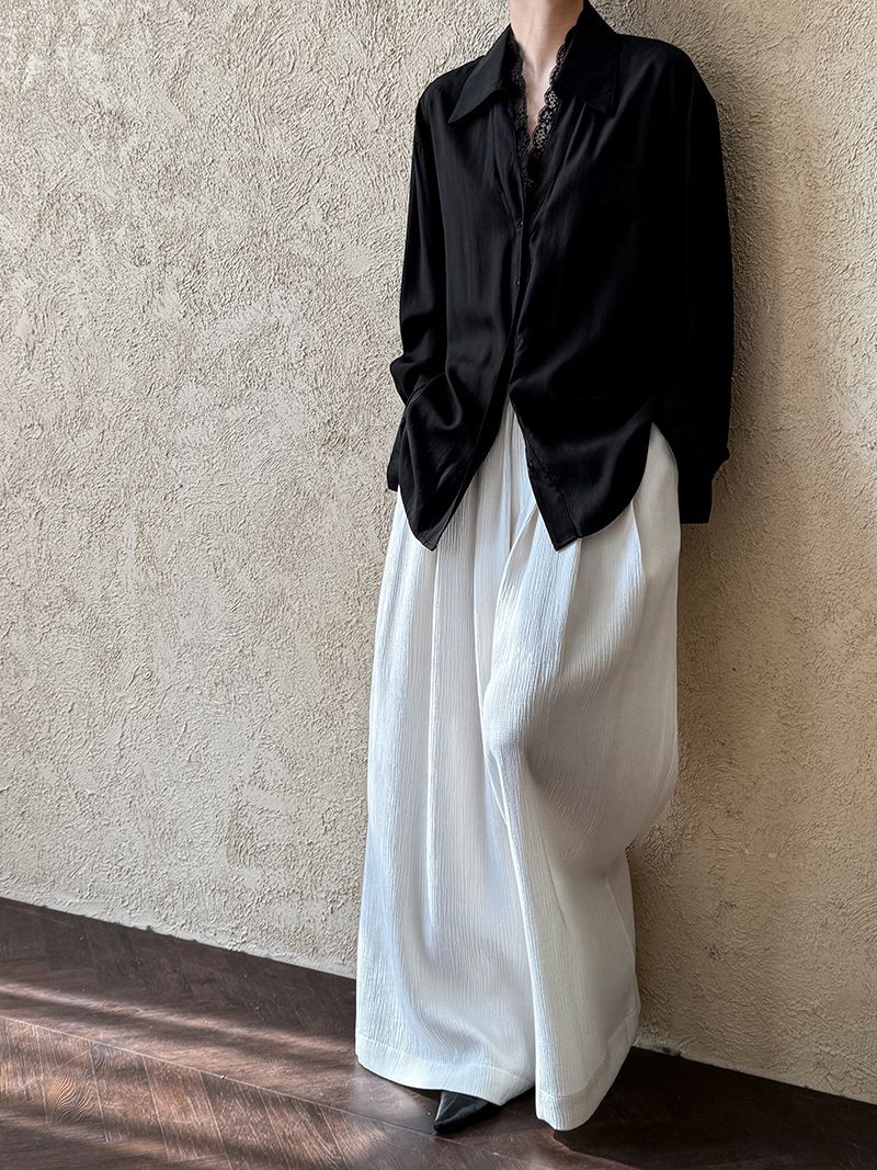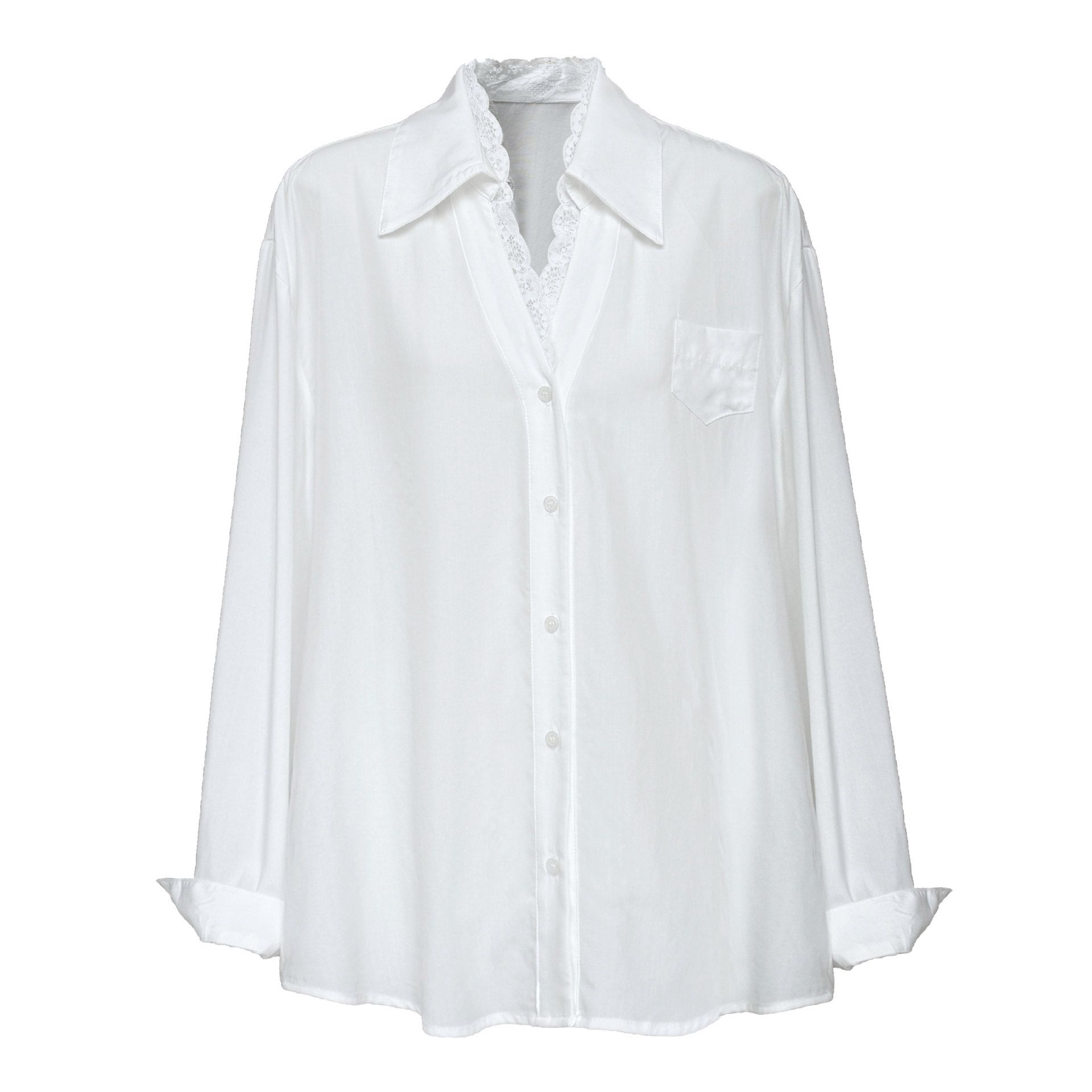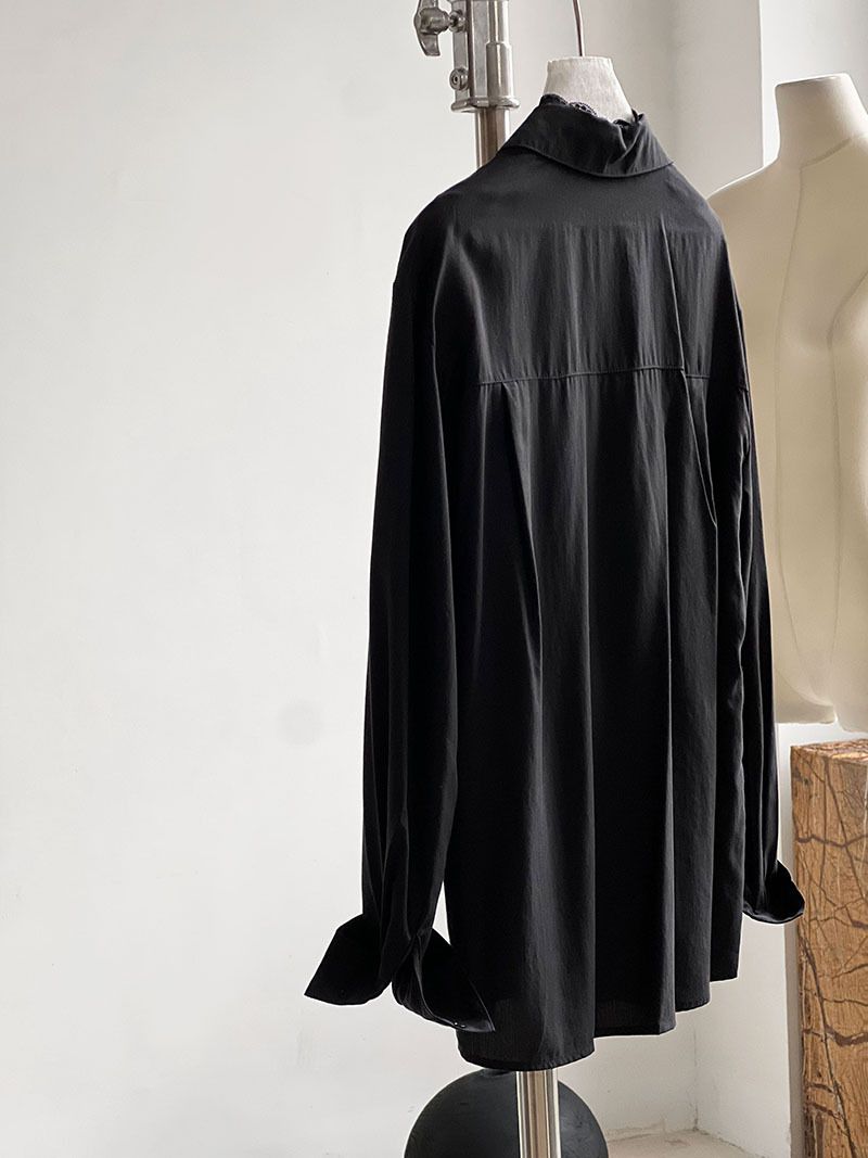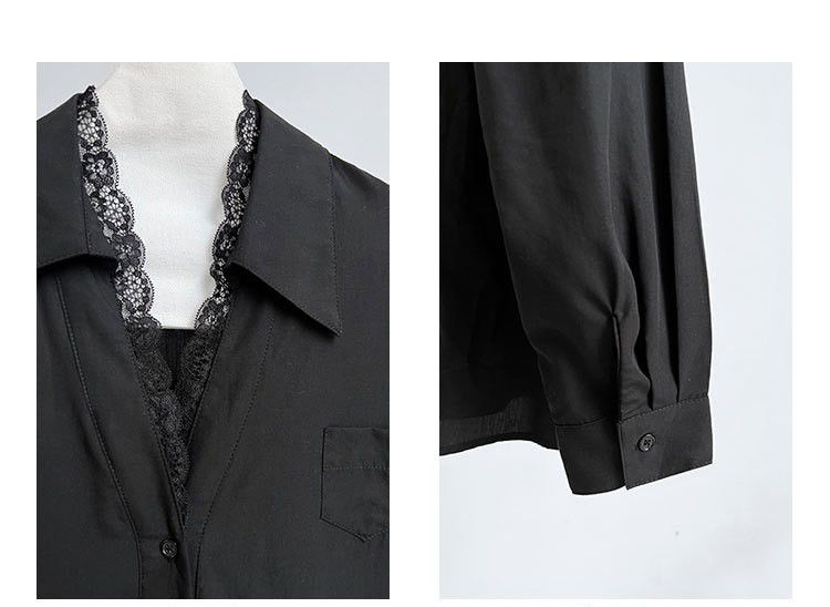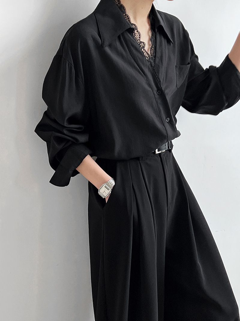 兩種尺寸/胸前口袋/絲滑天絲/寬鬆長版/蕾絲滾邊V領/開襟排釦 - 休閒居家婚禮OL上班族簡約百搭素面蕾絲V領襯衫上衣長袖上衣寬鬆大尺碼上衣長版上衣多尺寸ML黑色白色