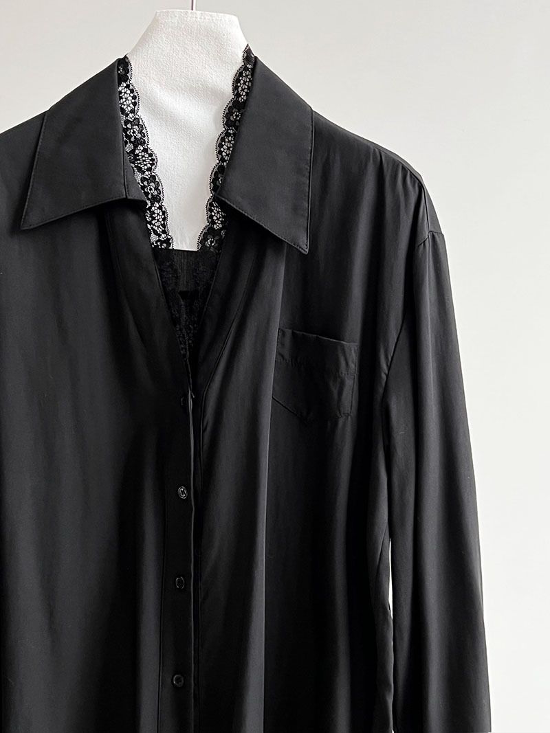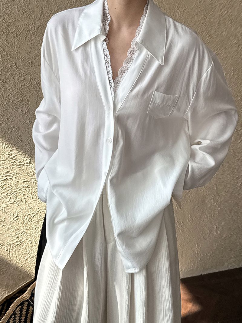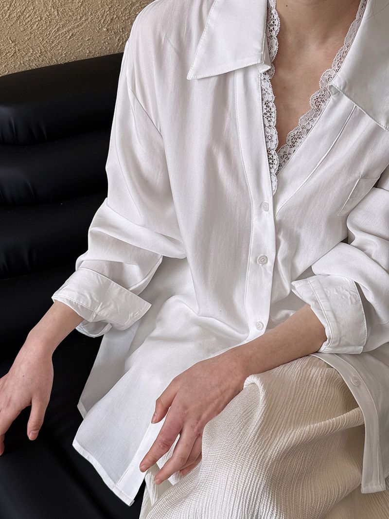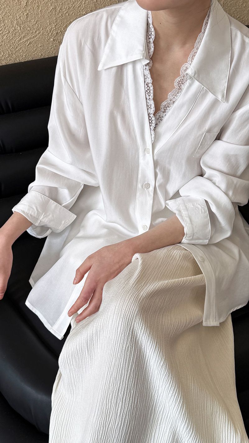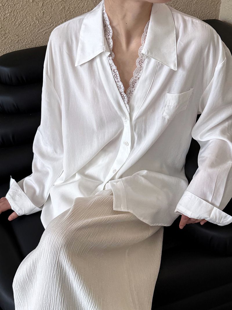 【C60146】品牌 蕾絲V領襯衫-素面絲滑天絲寬鬆長版口袋長袖上衣