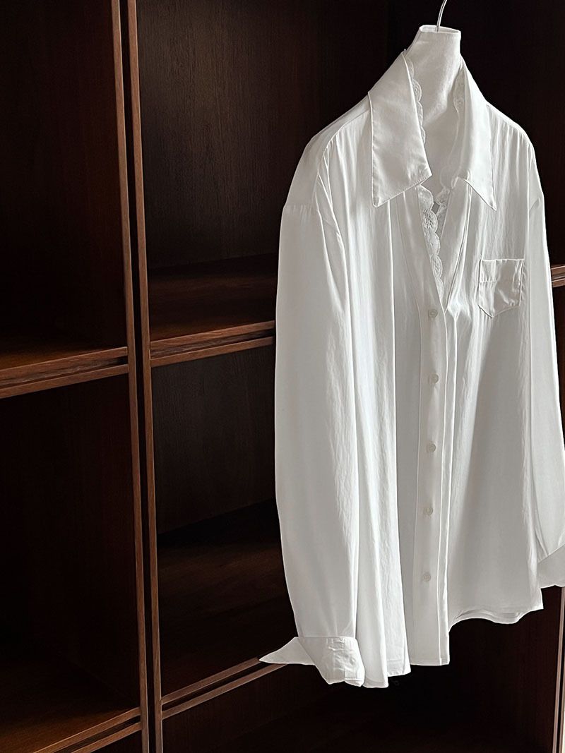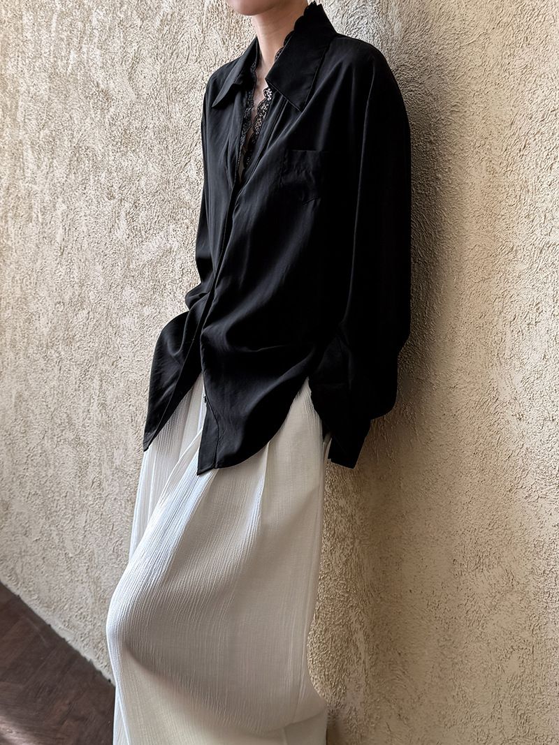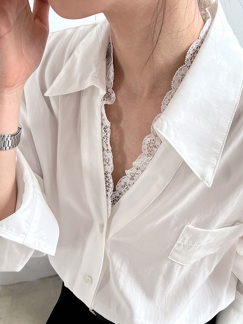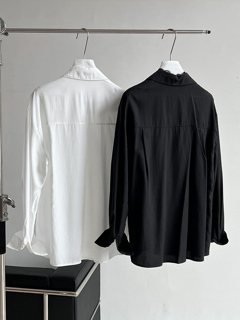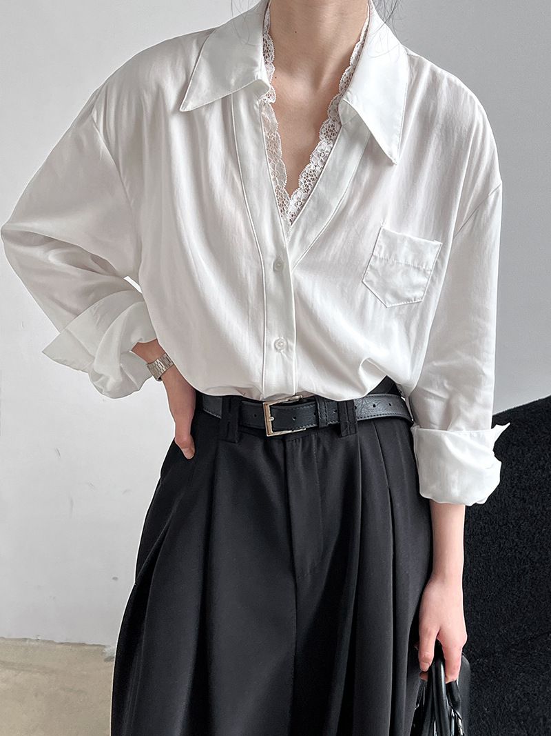 【C60146】品牌 蕾絲V領襯衫-素面絲滑天絲寬鬆長版口袋長袖上衣