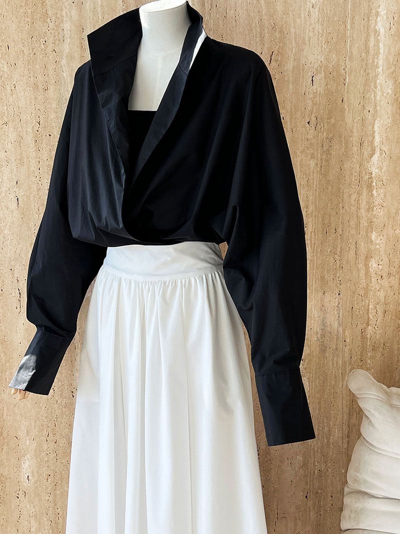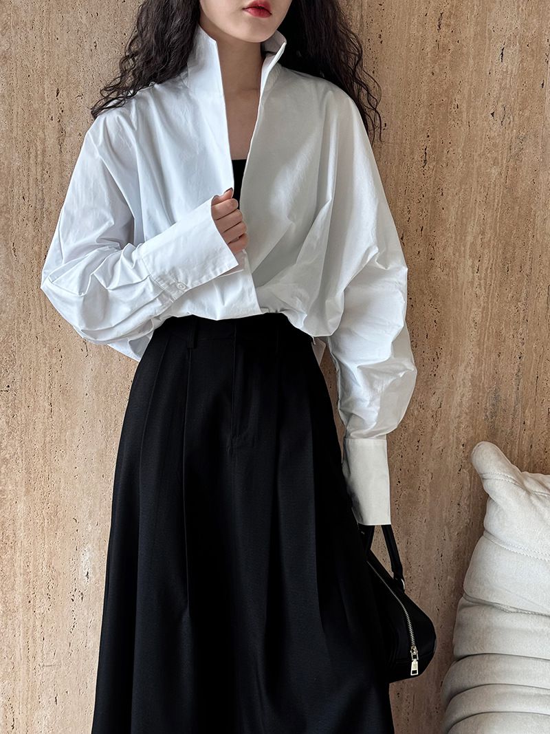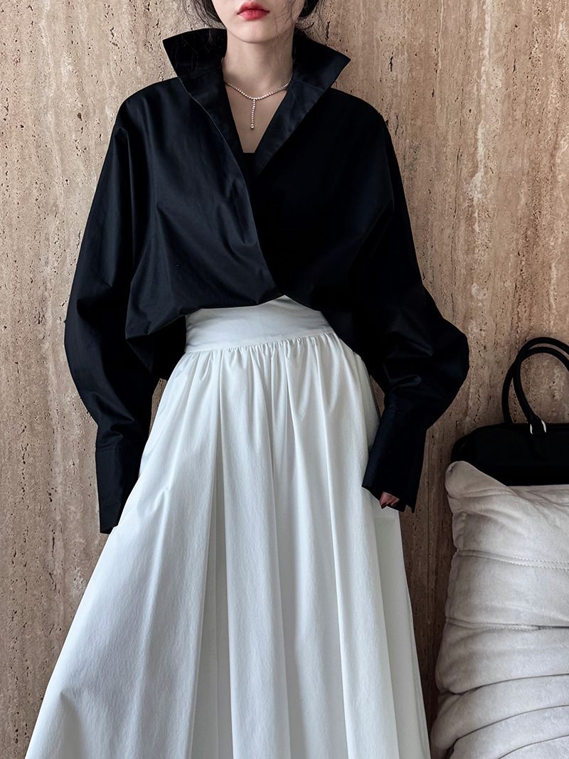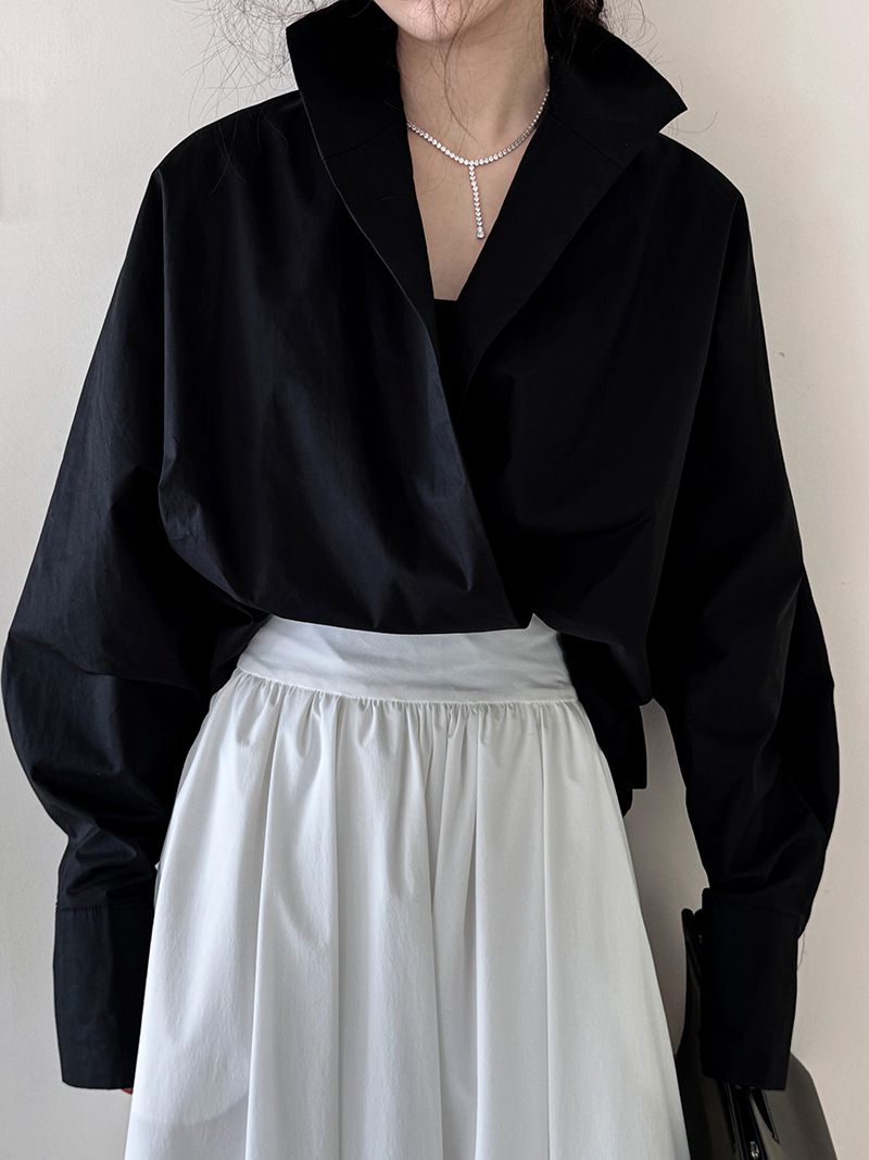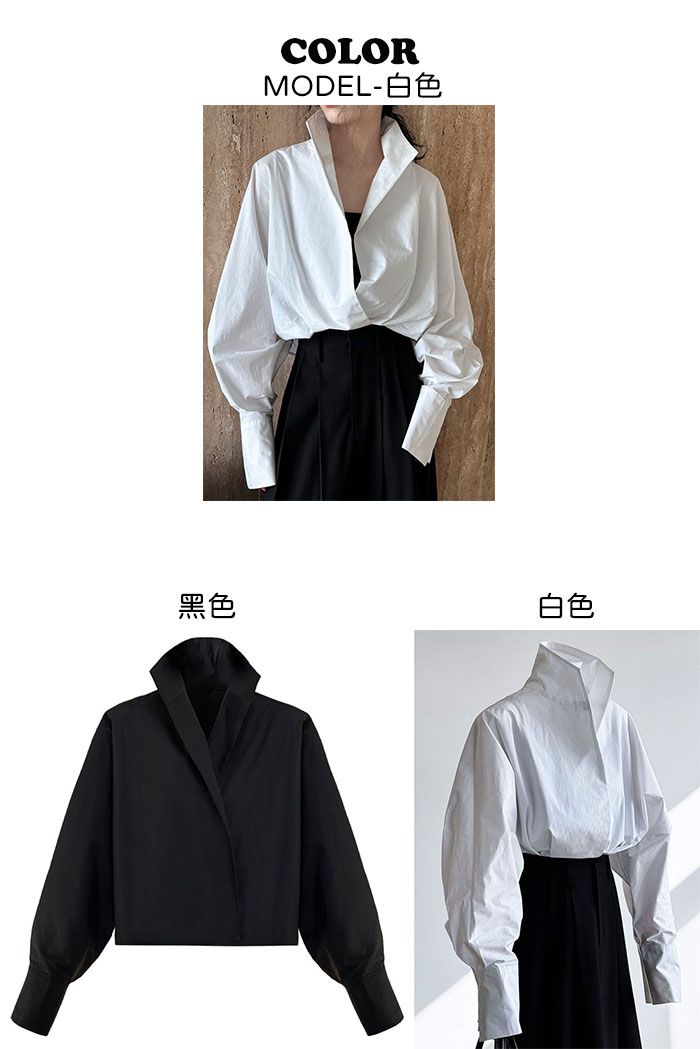 兩種尺寸/交叉衣襟/開衩衣襟/立領.高領/寬鬆短版 - 婚禮OL上班族交疊衣襟襯衫上衣長袖襯衫寬鬆大尺碼上衣短版上衣長袖上衣多尺寸ML黑色白色