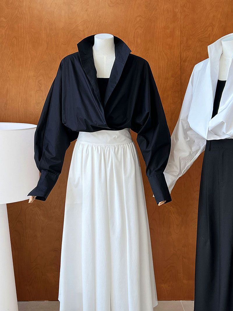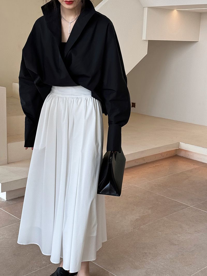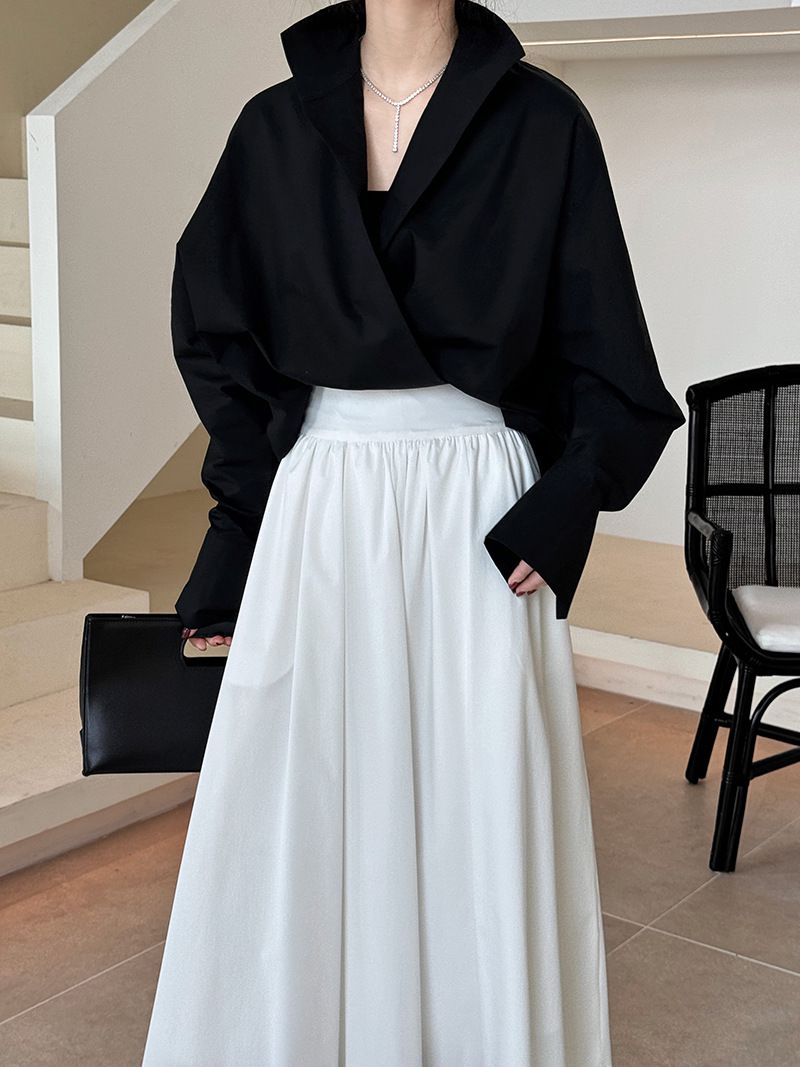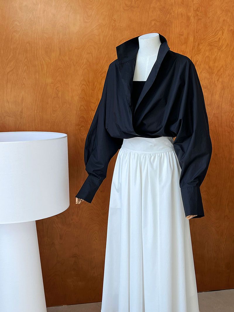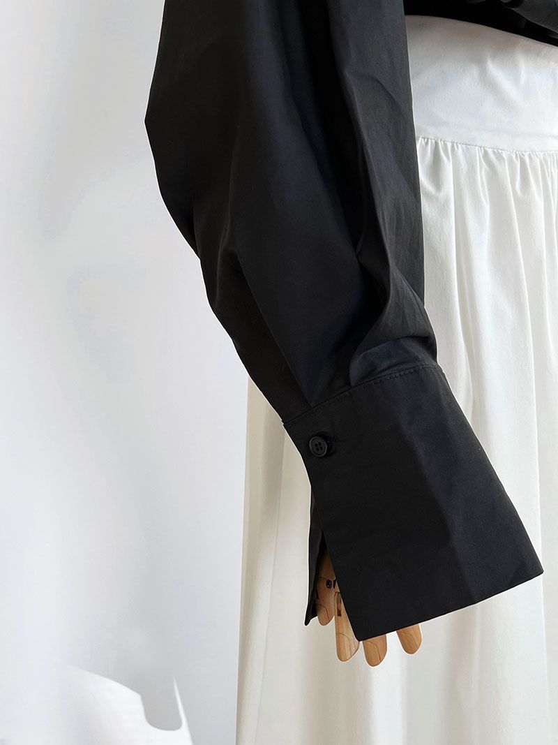 兩種尺寸/交叉衣襟/開衩衣襟/立領.高領/寬鬆短版 - 婚禮OL上班族交疊衣襟襯衫上衣長袖襯衫寬鬆大尺碼上衣短版上衣長袖上衣多尺寸ML黑色白色