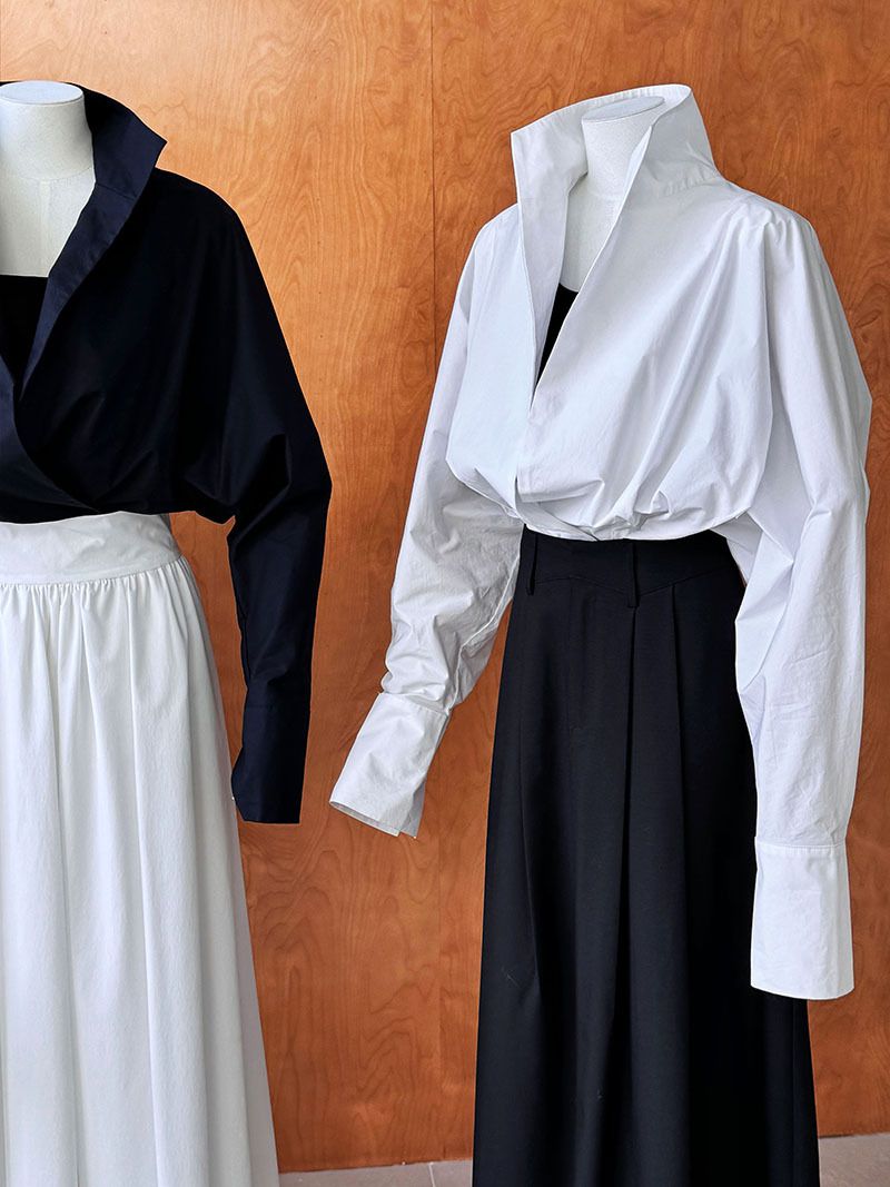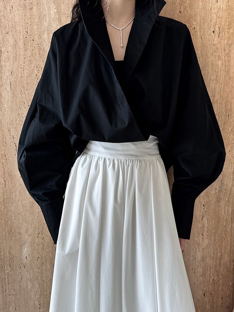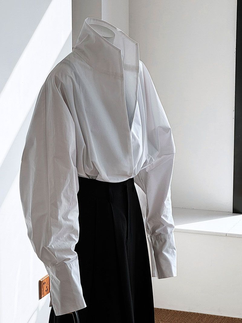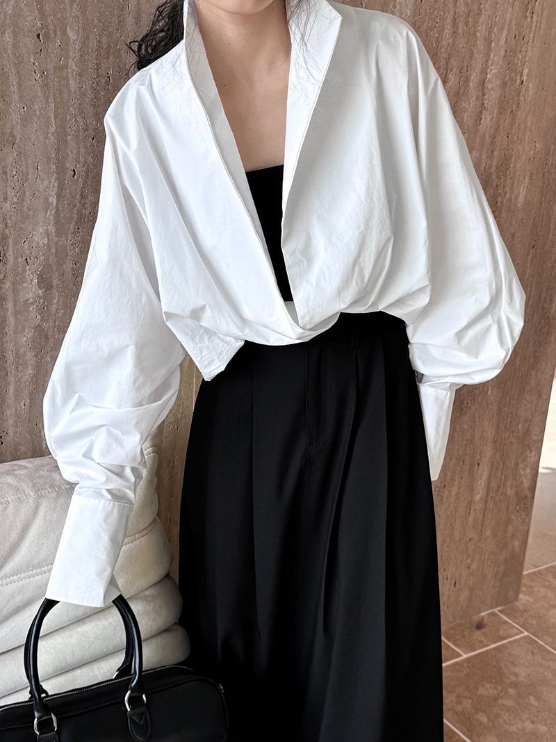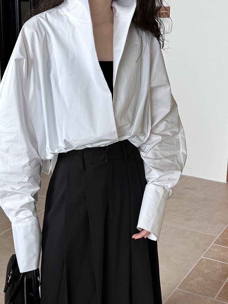 【C60147】品牌 交疊衣襟襯衫-素面交叉立領寬鬆短版長袖上衣