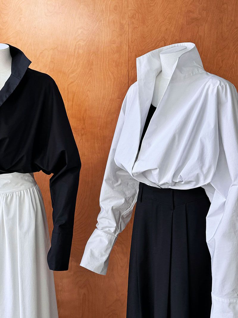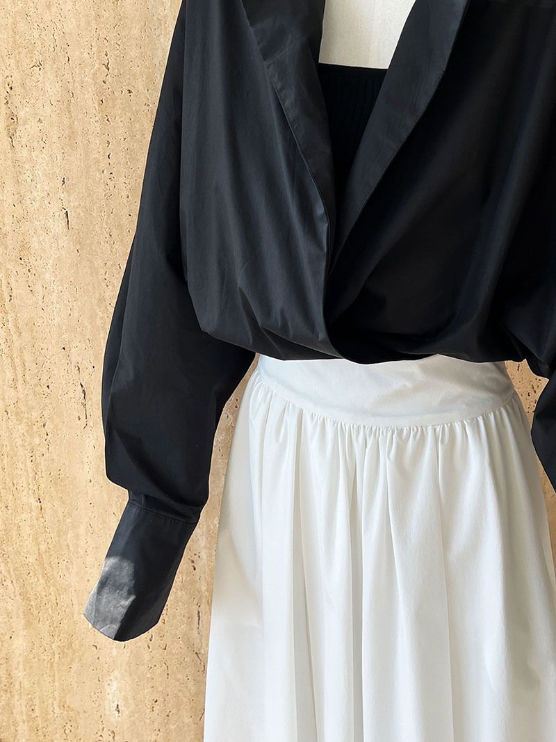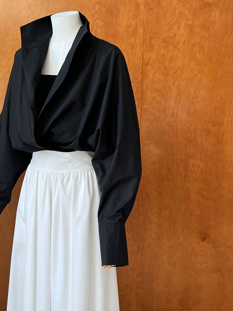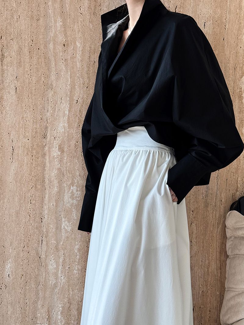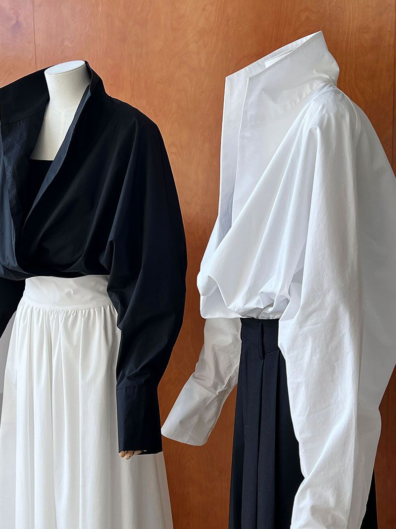 【C60147】品牌 交疊衣襟襯衫-素面交叉立領寬鬆短版長袖上衣