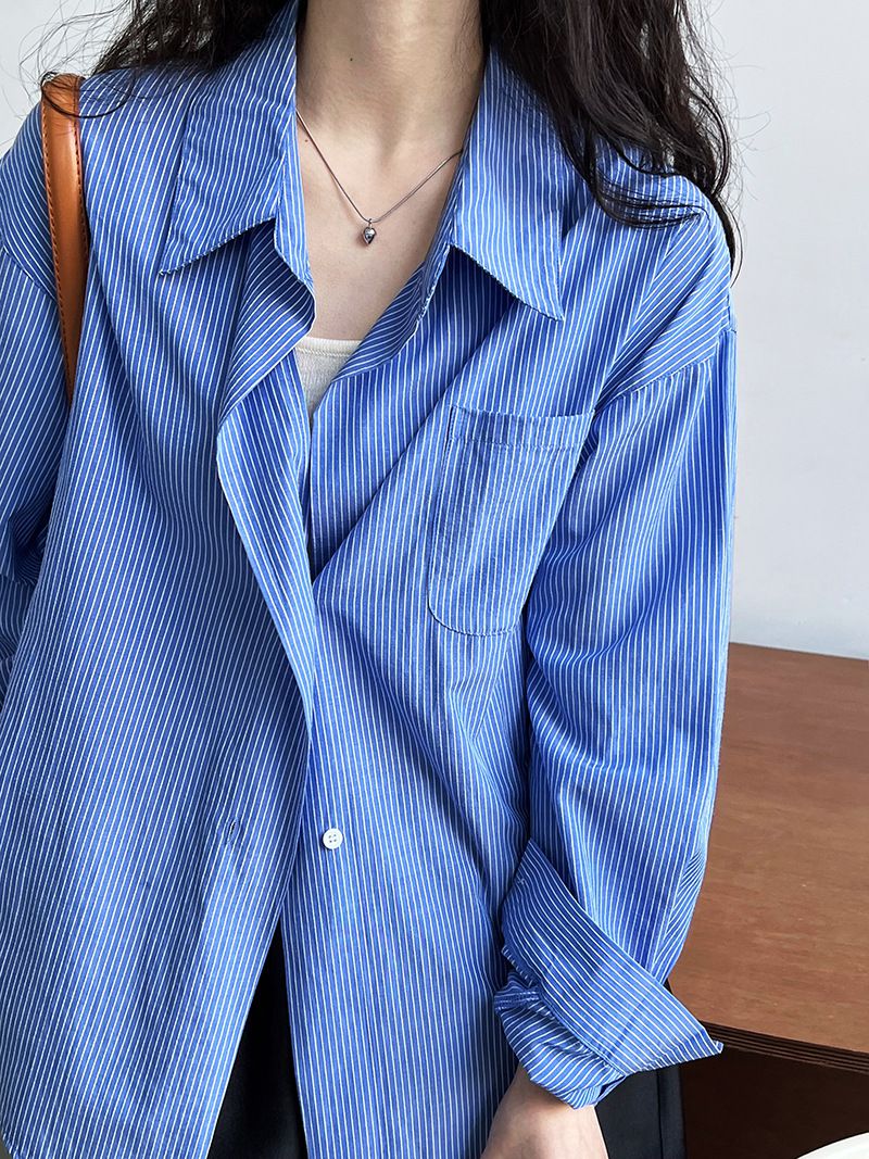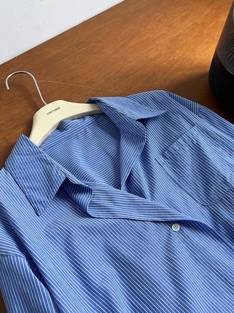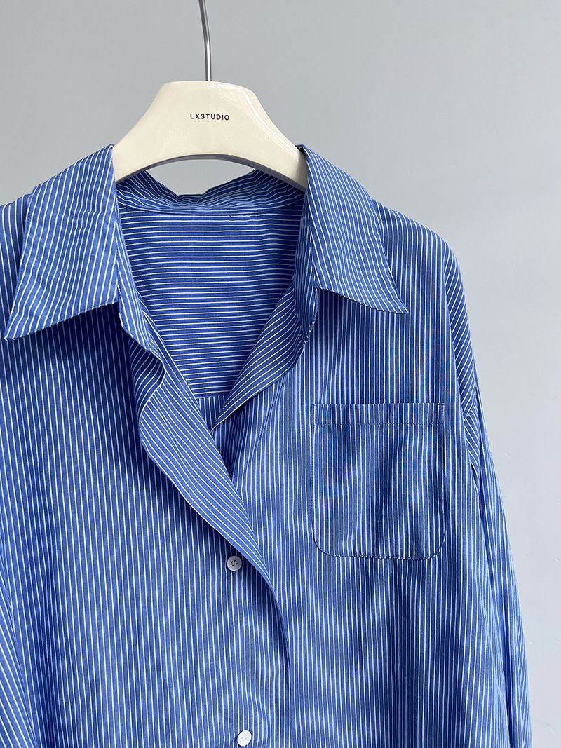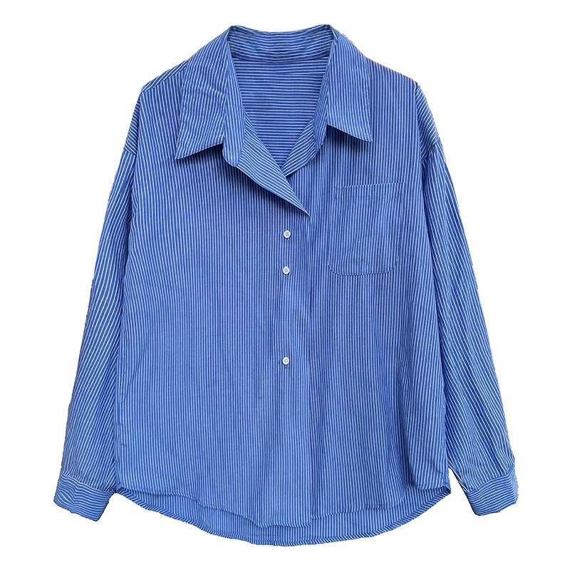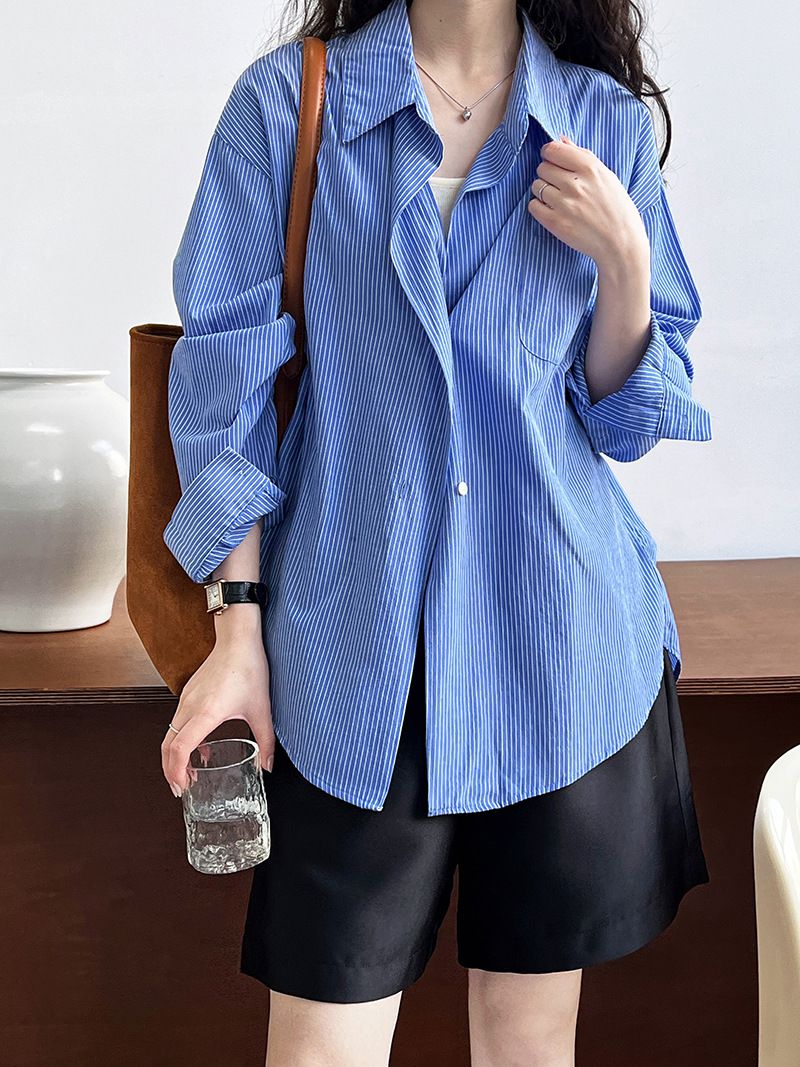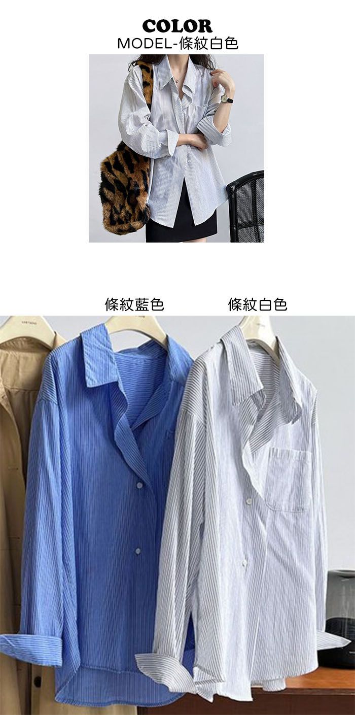兩種尺寸/細直條紋/寬鬆長版/弧形下襬/胸前口袋/開襟排釦 - 休閒OL上班族細直條紋襯衫上衣長袖上衣寬鬆大尺碼上衣長版上衣多尺寸ML條紋藍色條紋白色