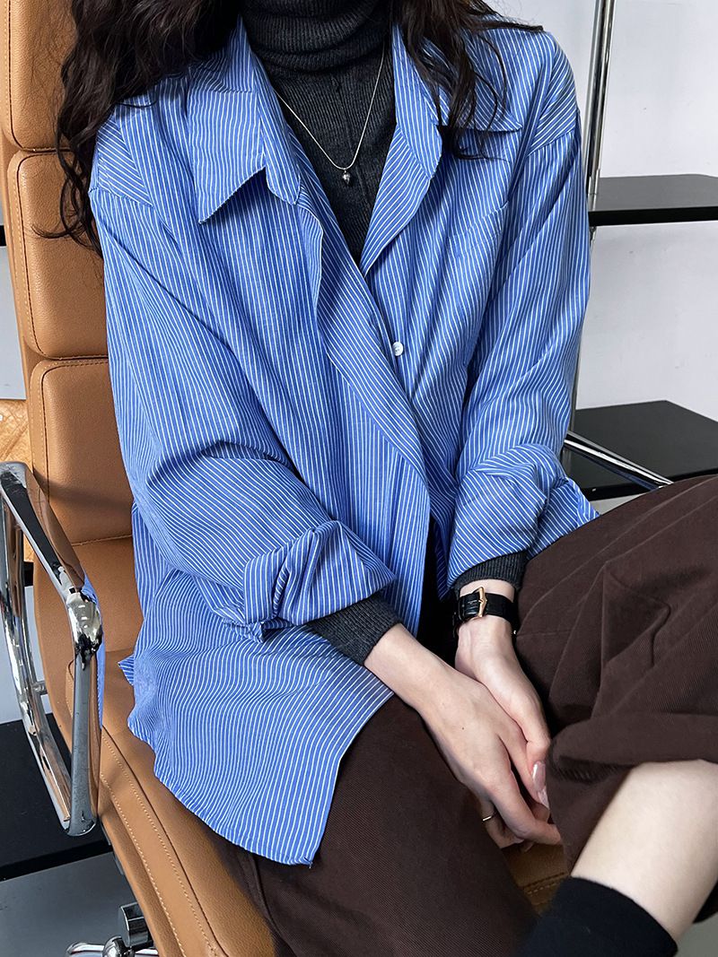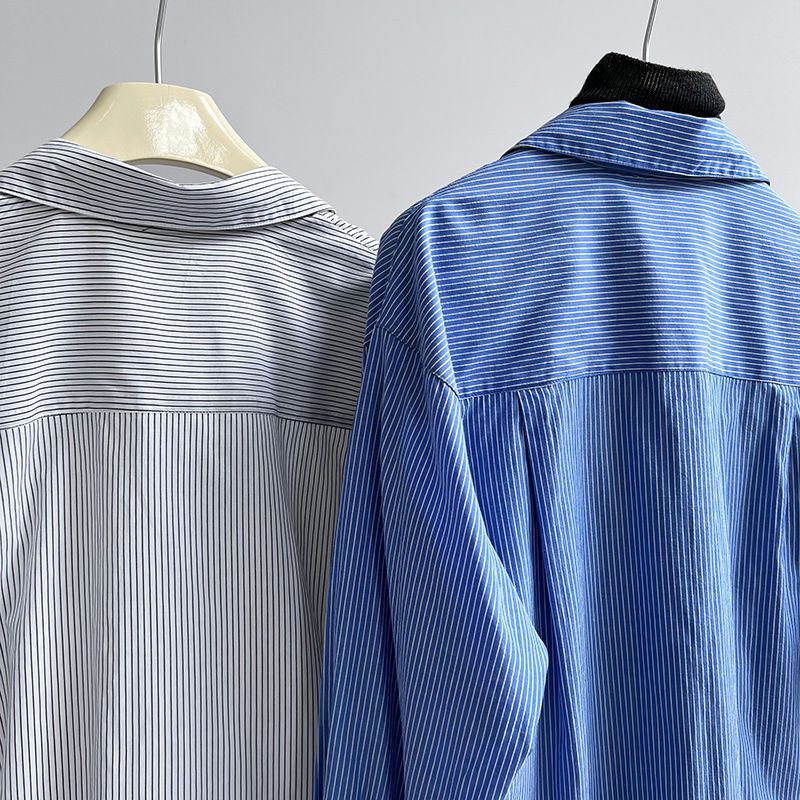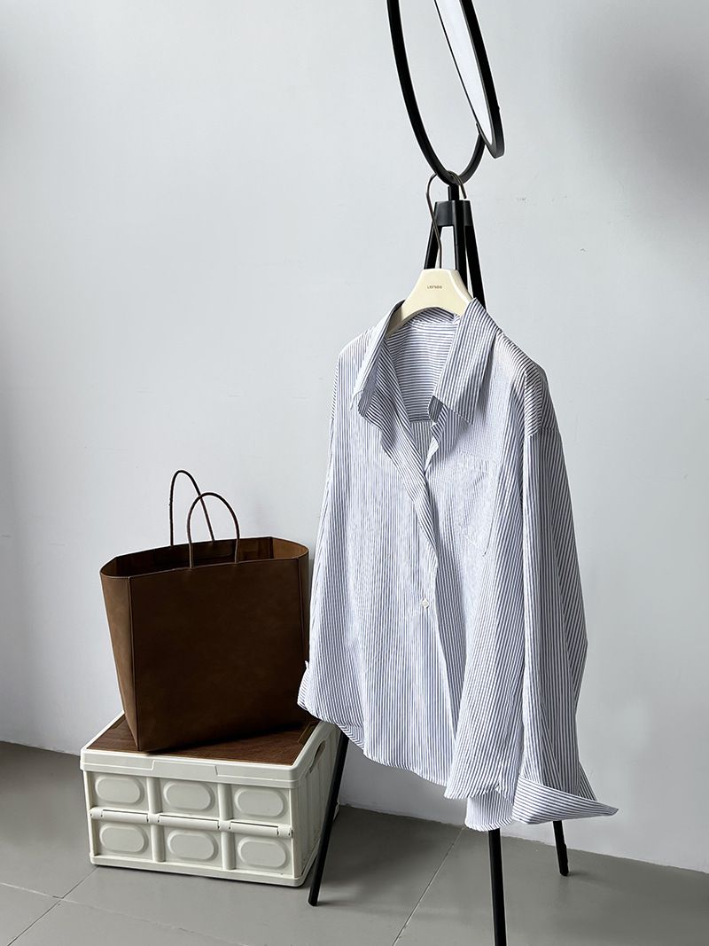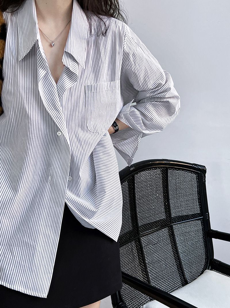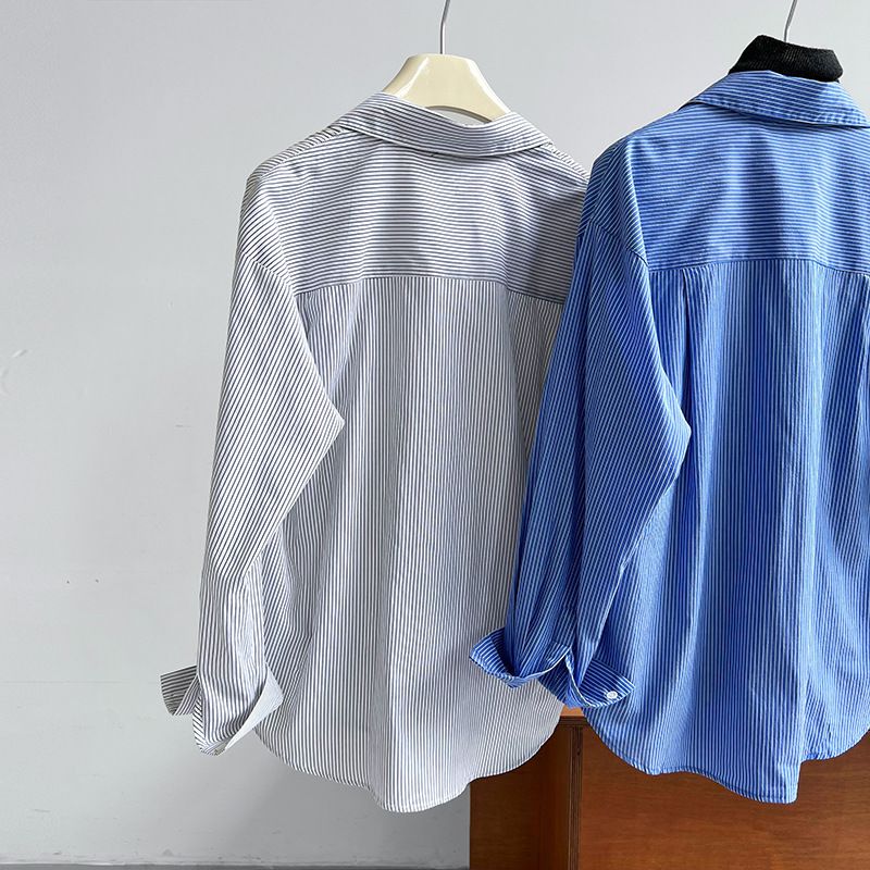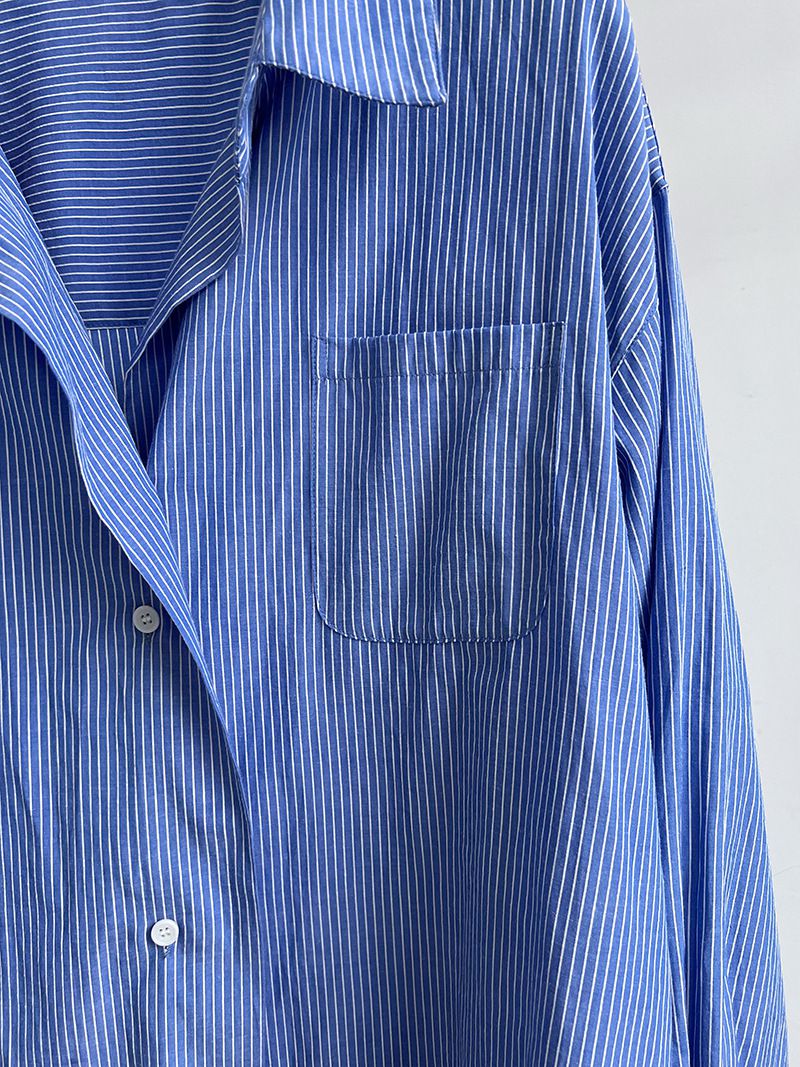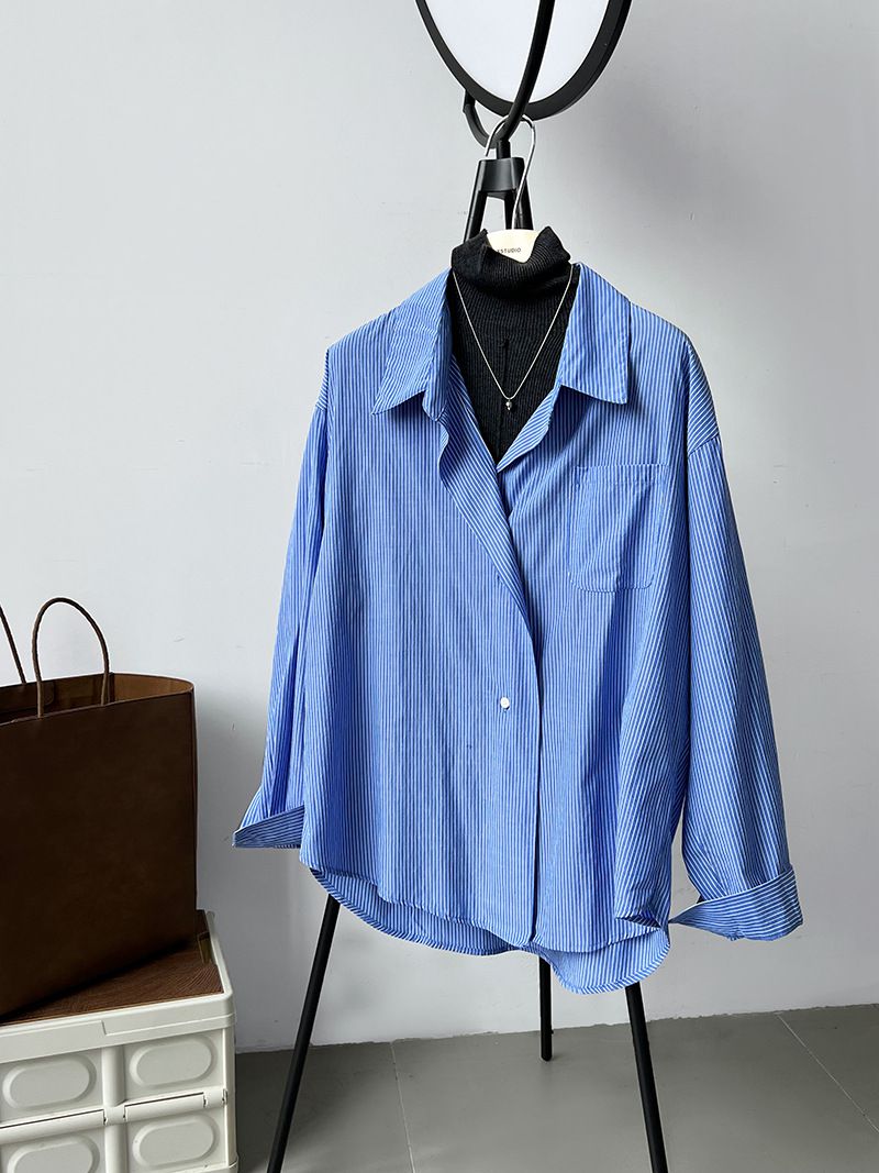 兩種尺寸/細直條紋/寬鬆長版/弧形下襬/胸前口袋/開襟排釦 - 休閒OL上班族細直條紋襯衫上衣長袖上衣寬鬆大尺碼上衣長版上衣多尺寸ML條紋藍色條紋白色
