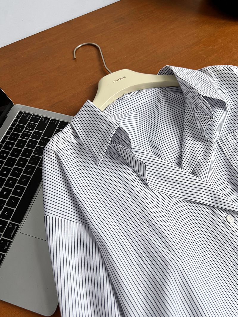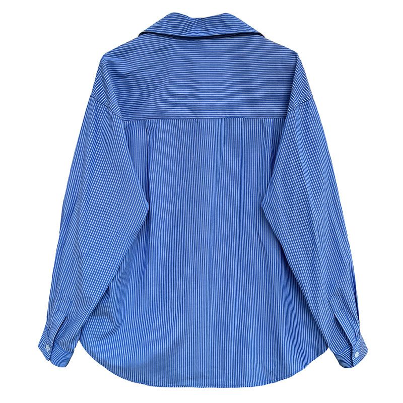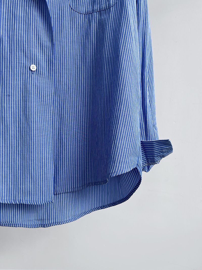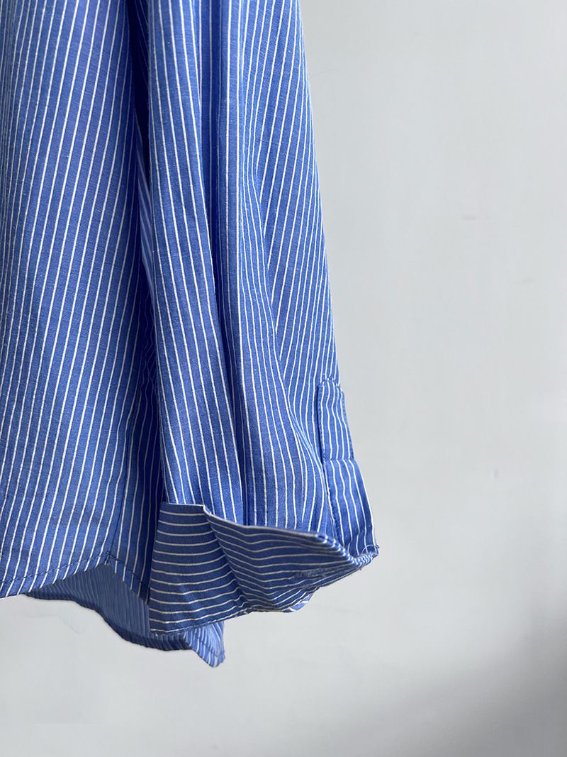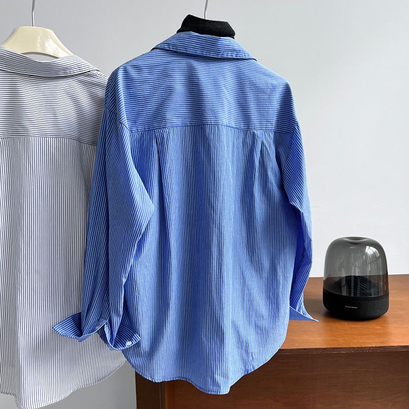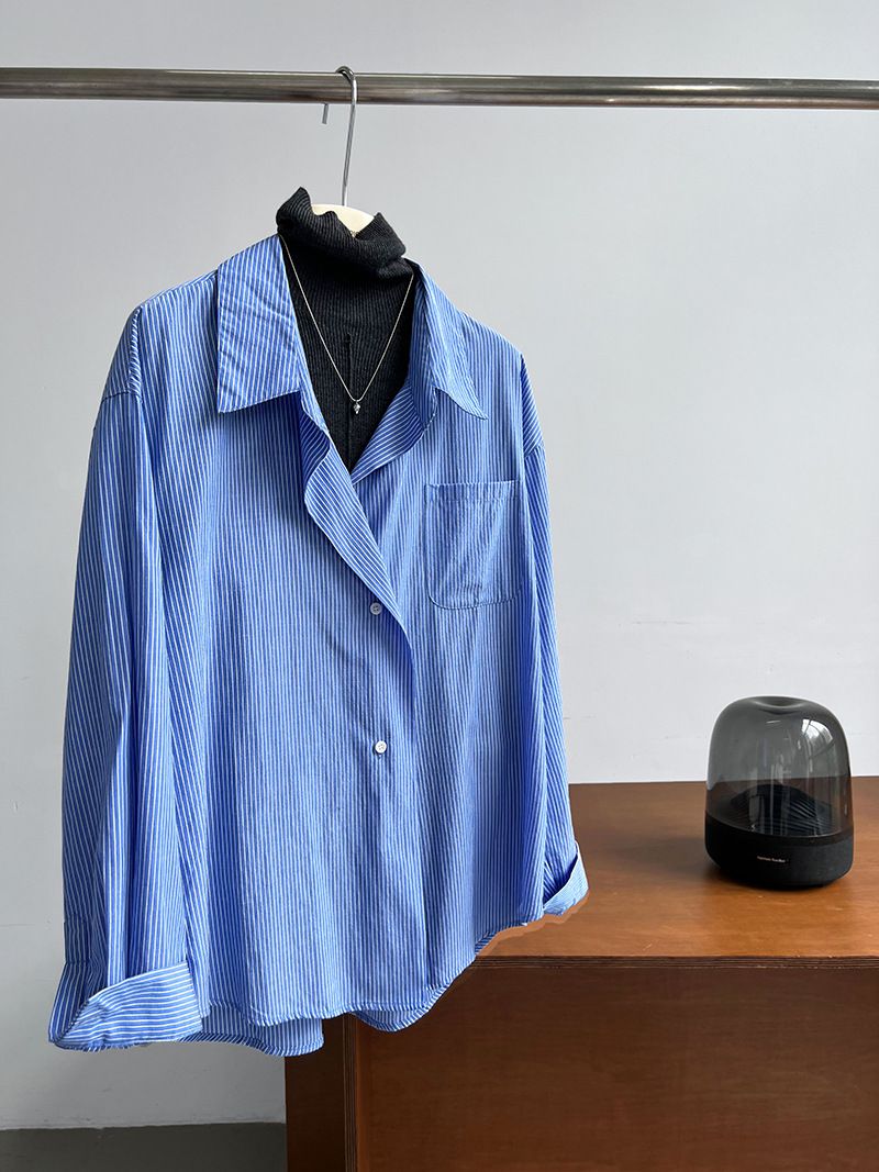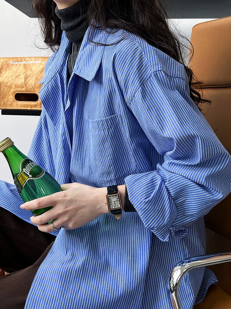 兩種尺寸/細直條紋/寬鬆長版/弧形下襬/胸前口袋/開襟排釦 - 休閒OL上班族細直條紋襯衫上衣長袖上衣寬鬆大尺碼上衣長版上衣多尺寸ML條紋藍色條紋白色