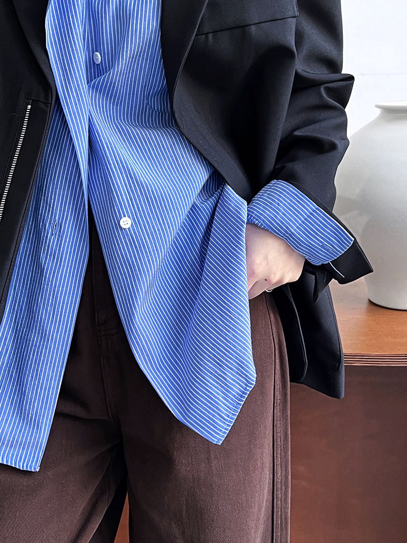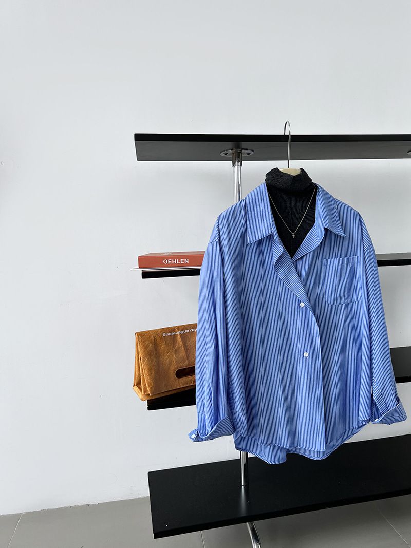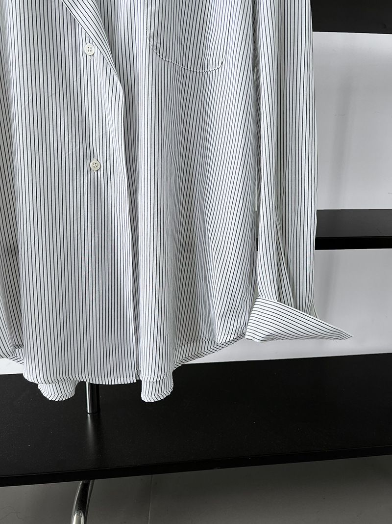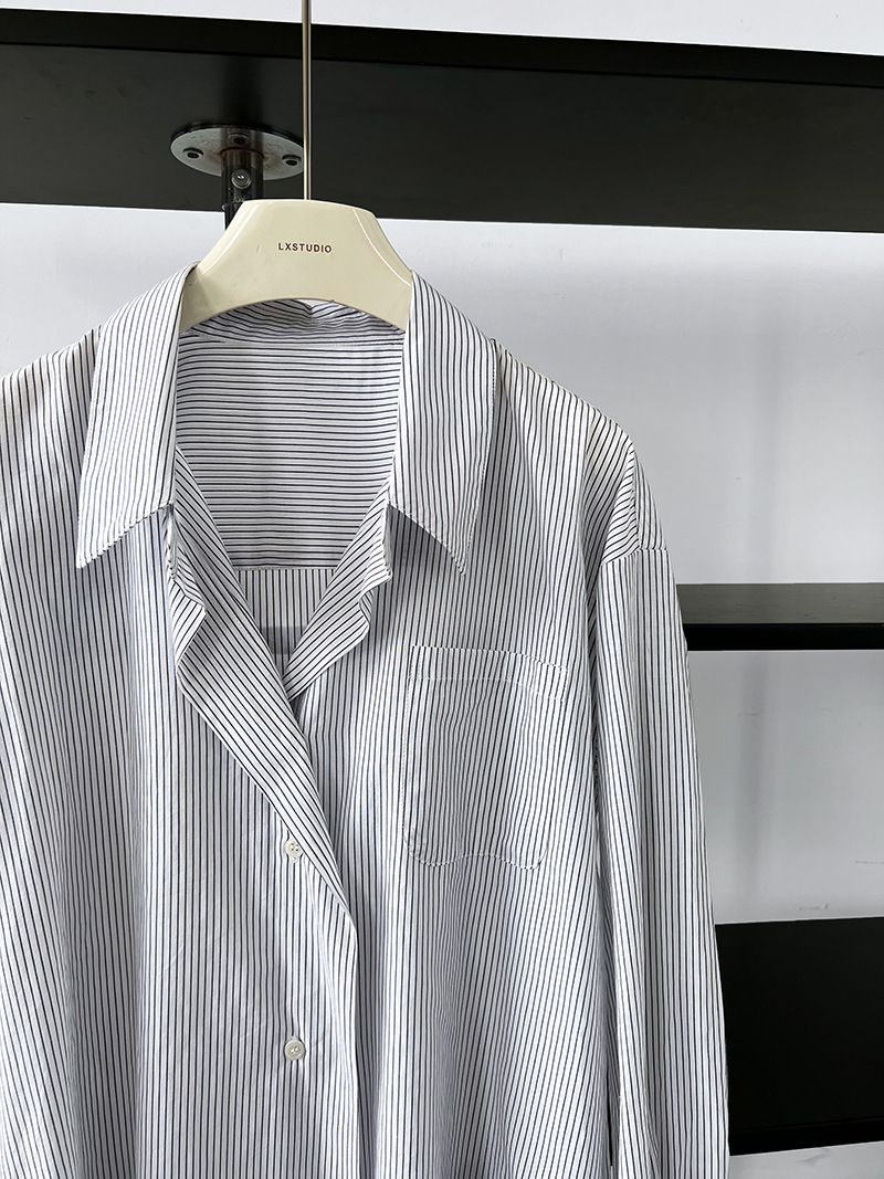 【C60149】品牌 細直條紋襯衫-寬鬆長版弧形下襬口袋長袖上衣★★