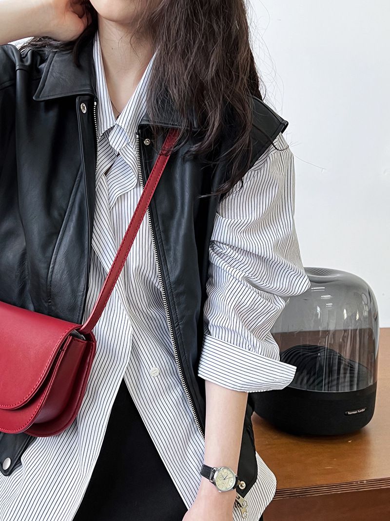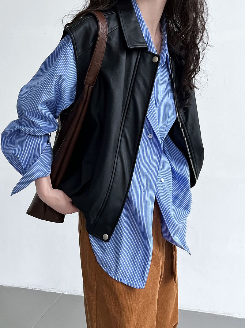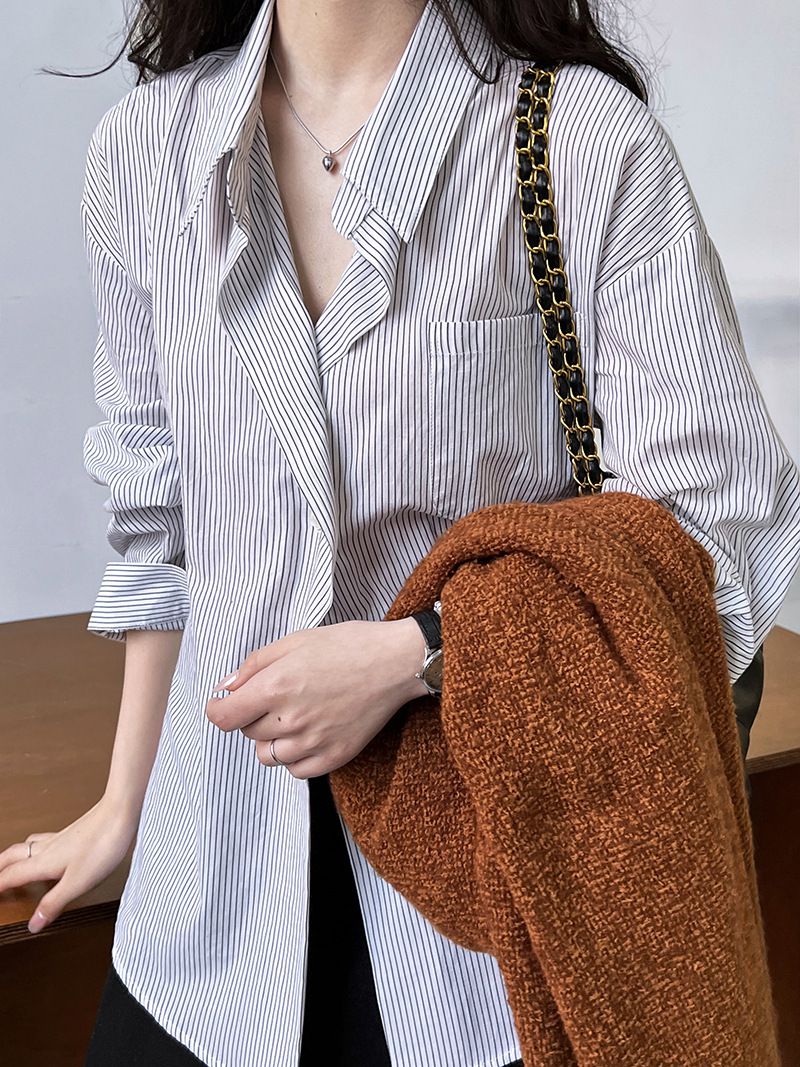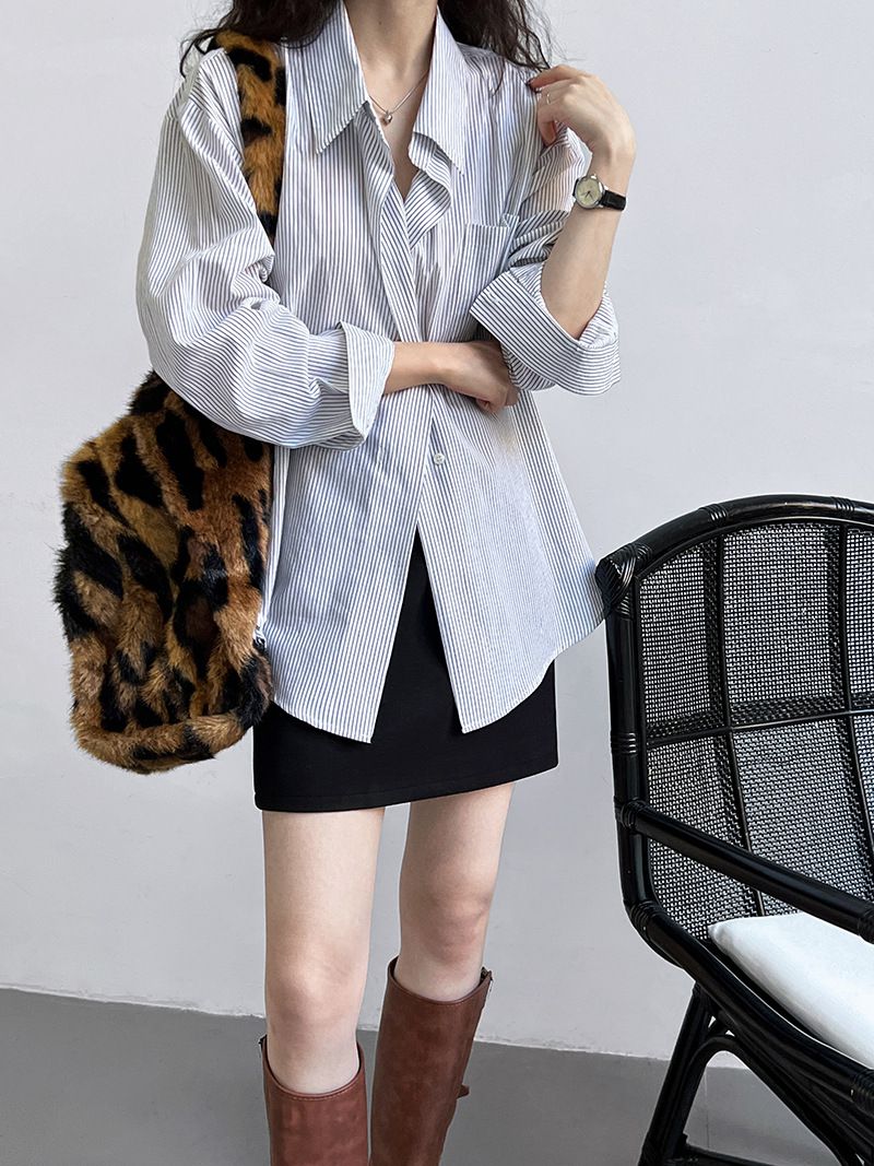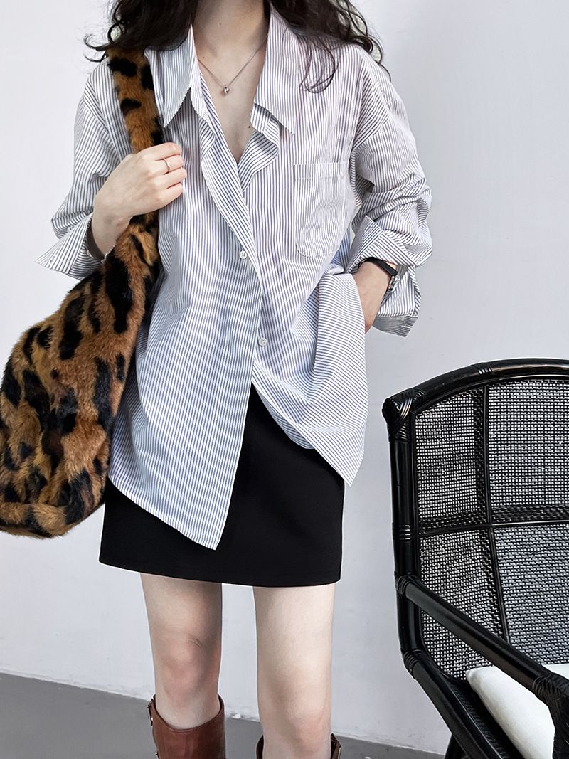 【C60149】品牌 細直條紋襯衫-寬鬆長版弧形下襬口袋長袖上衣★★