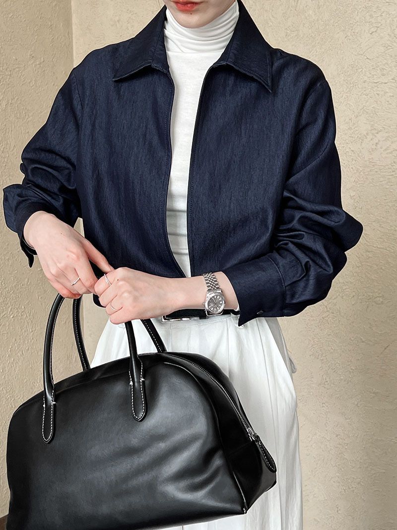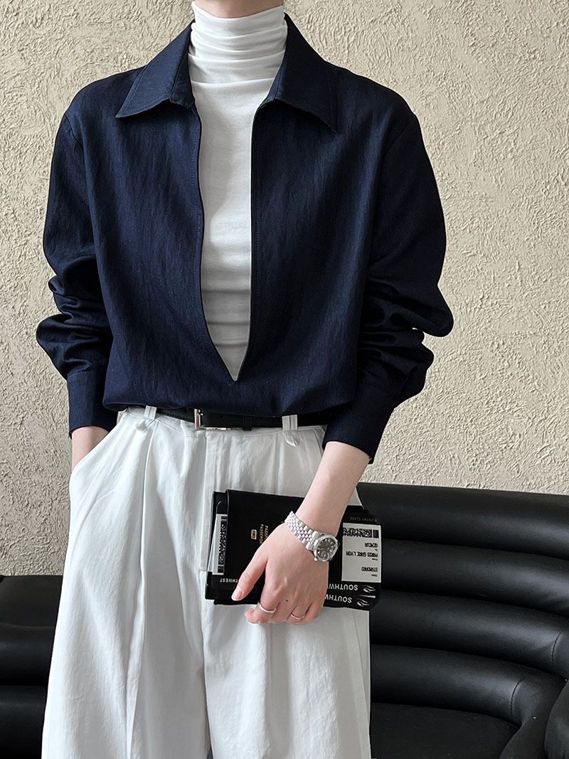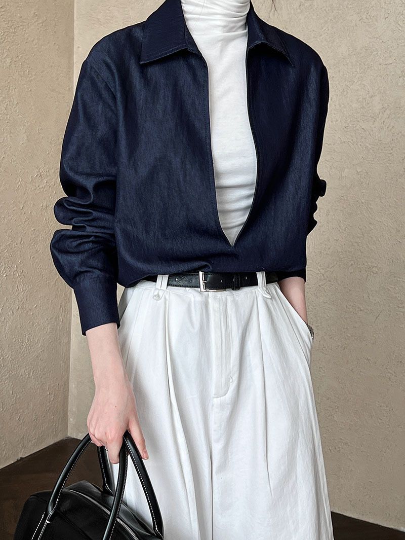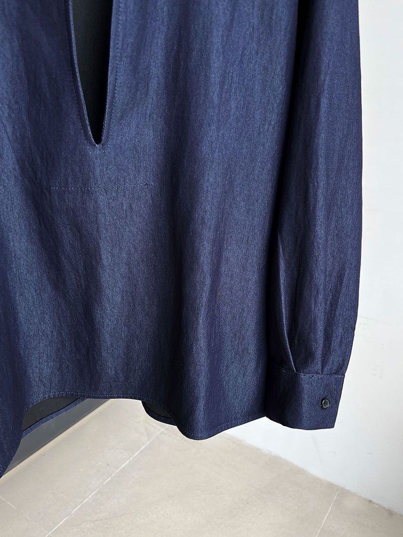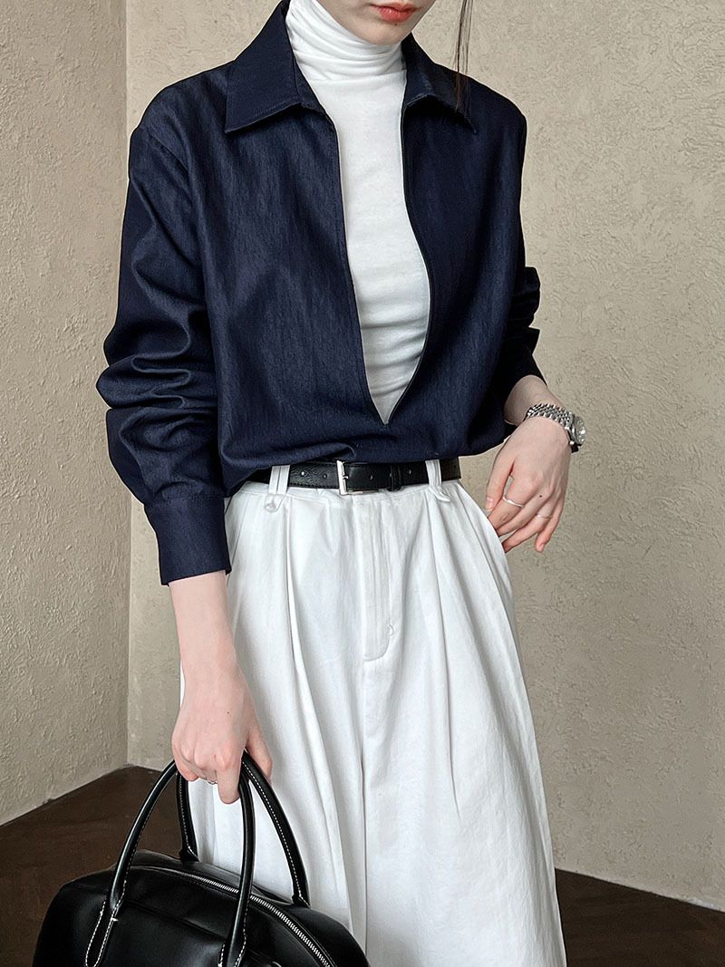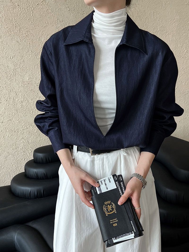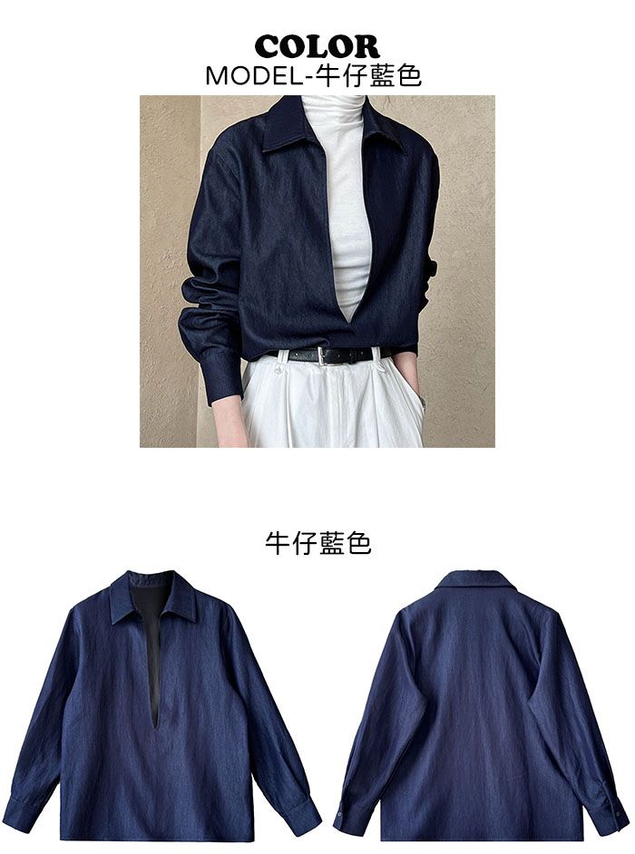 【C60152】品牌 開衩深V領襯衫-素面寬鬆長版長袖牛仔上衣
