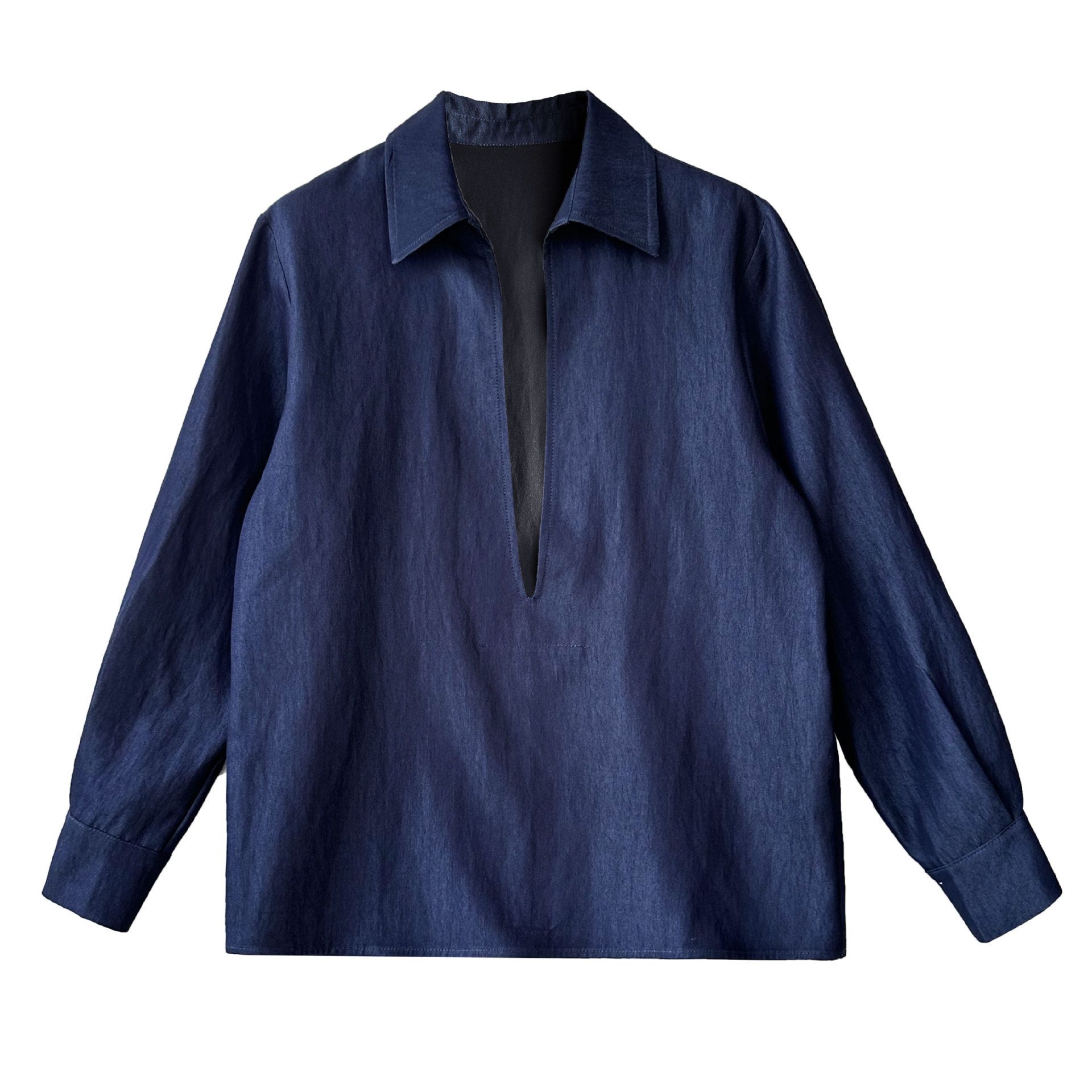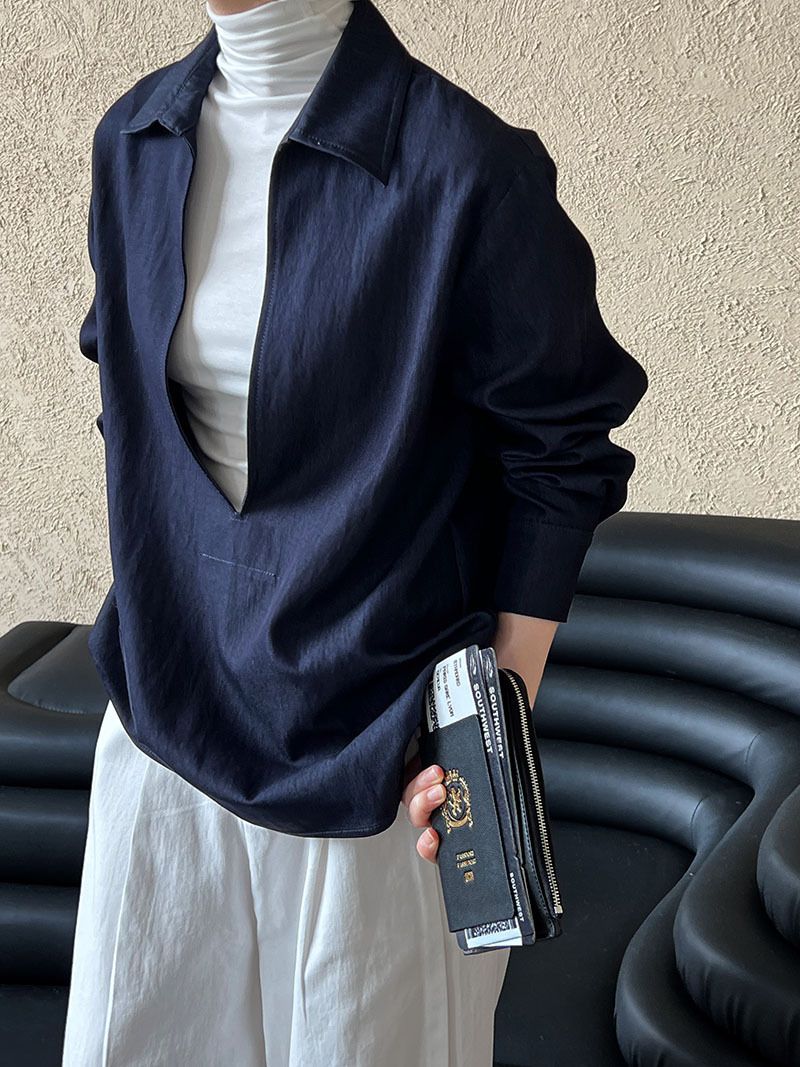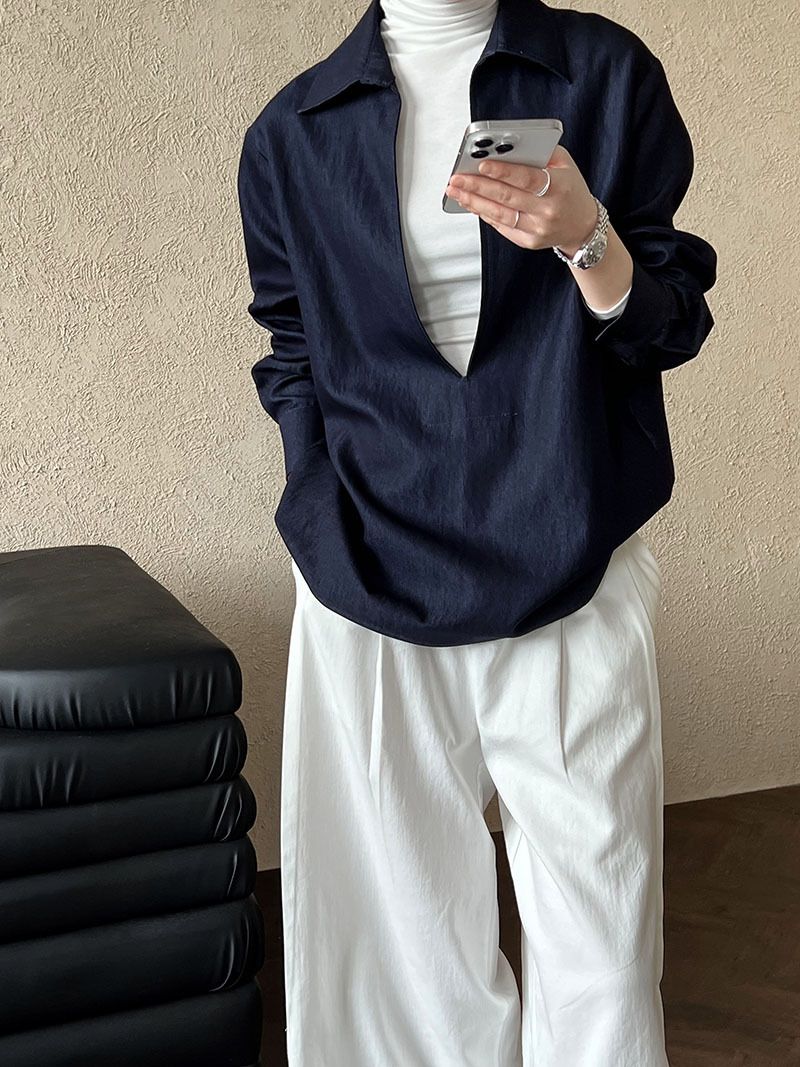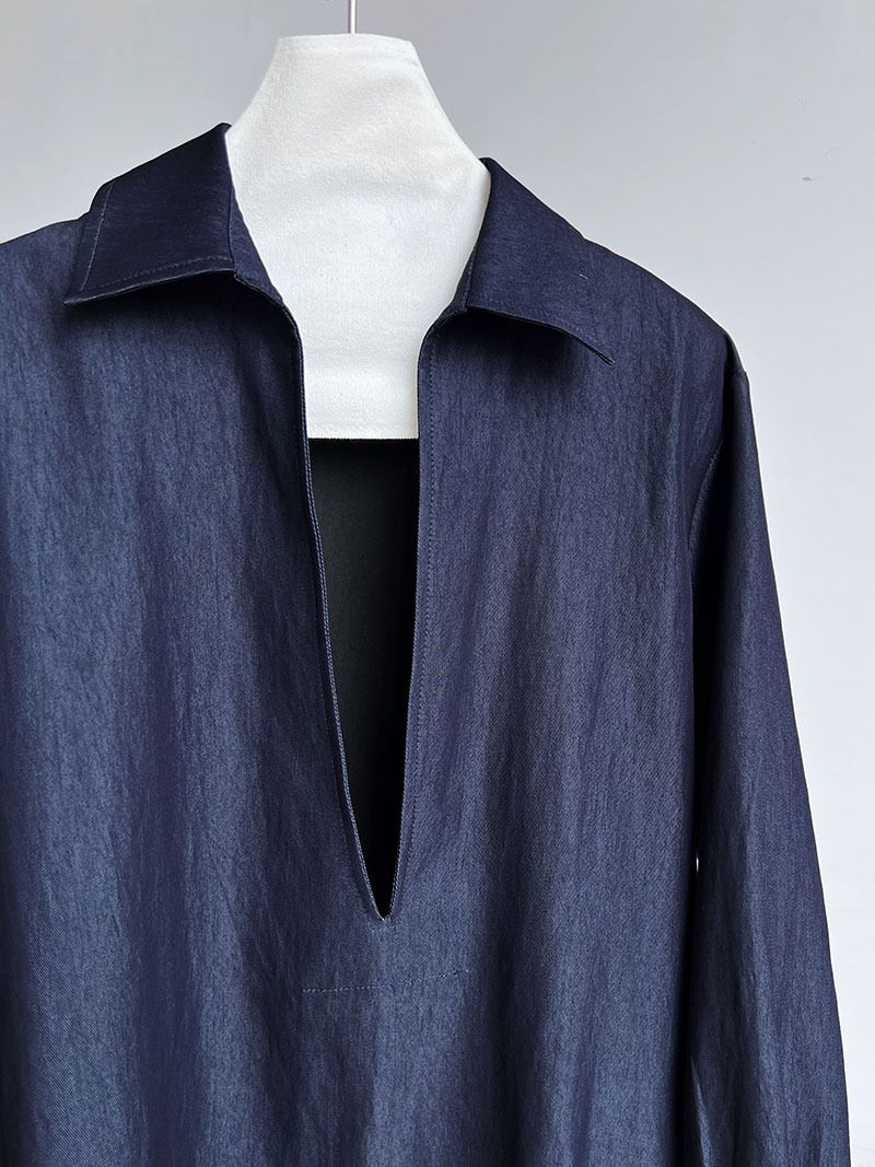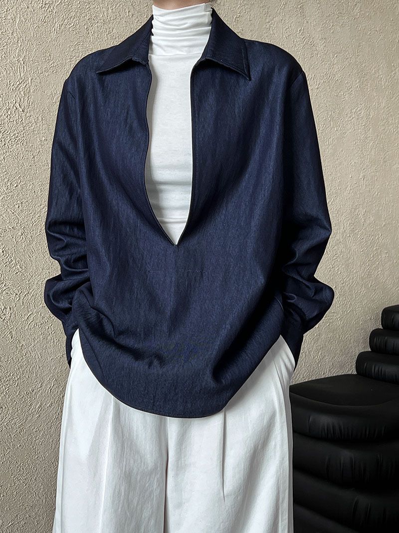 三種尺寸/開衩深V領/寬鬆長版 - 休閒居家簡約百搭素面開衩深V領襯衫上衣牛仔襯衫長袖上衣牛仔上衣寬鬆大尺碼上衣長版上衣多尺寸SML牛仔藍色