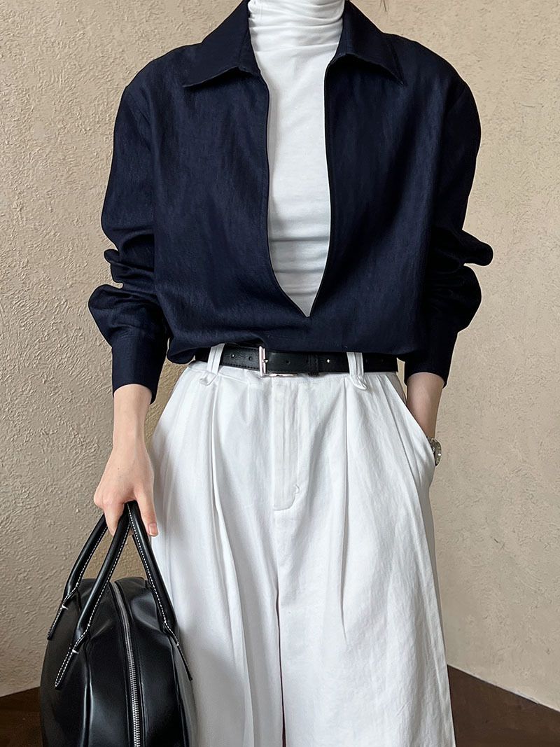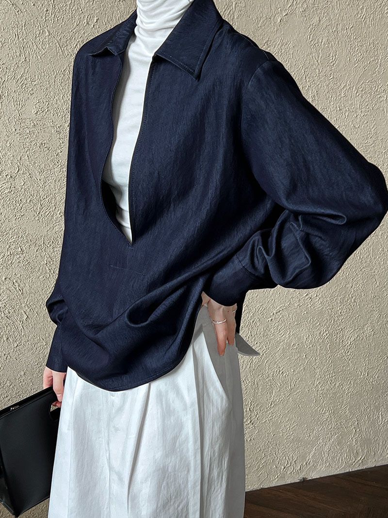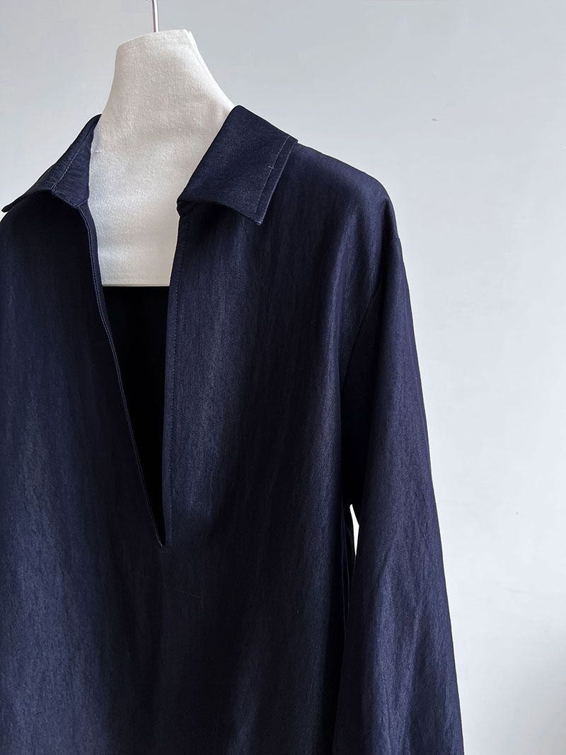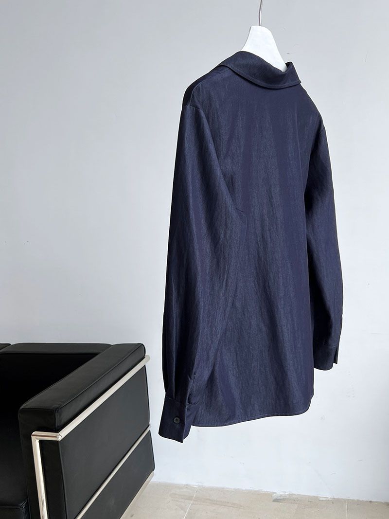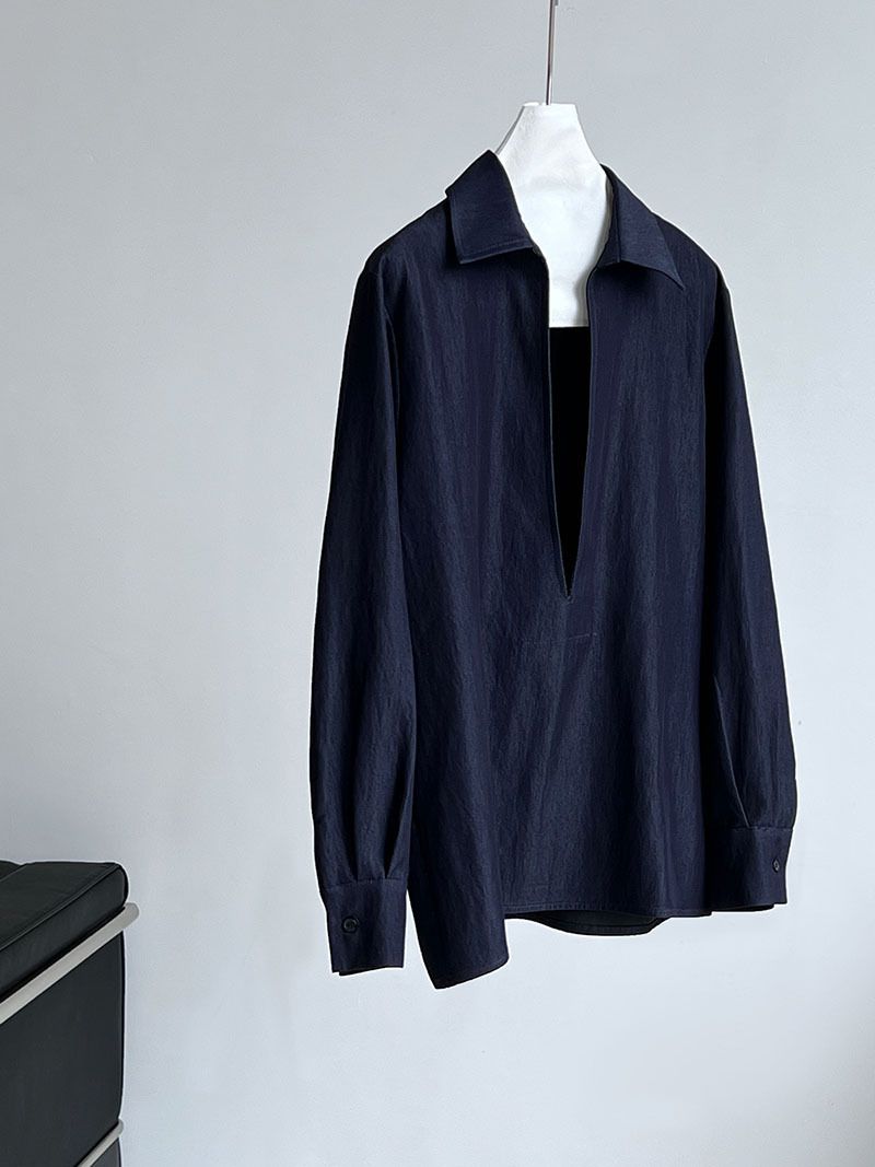 三種尺寸/開衩深V領/寬鬆長版 - 休閒居家簡約百搭素面開衩深V領襯衫上衣牛仔襯衫長袖上衣牛仔上衣寬鬆大尺碼上衣長版上衣多尺寸SML牛仔藍色