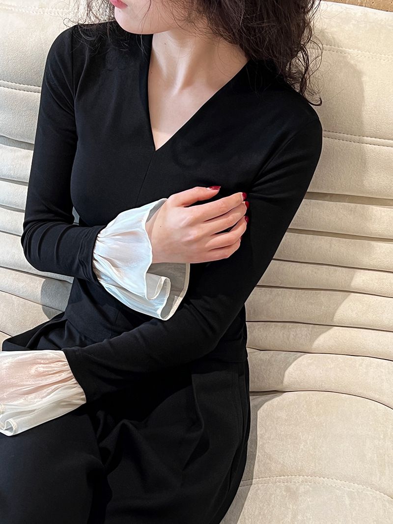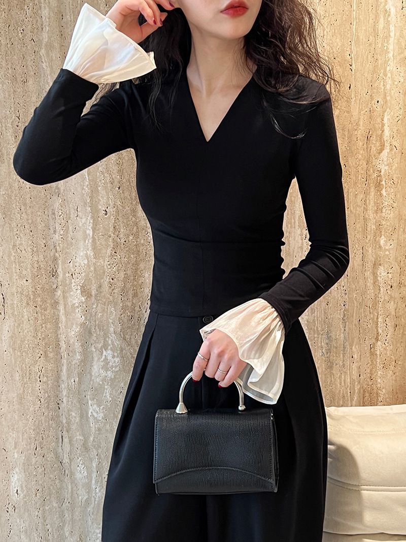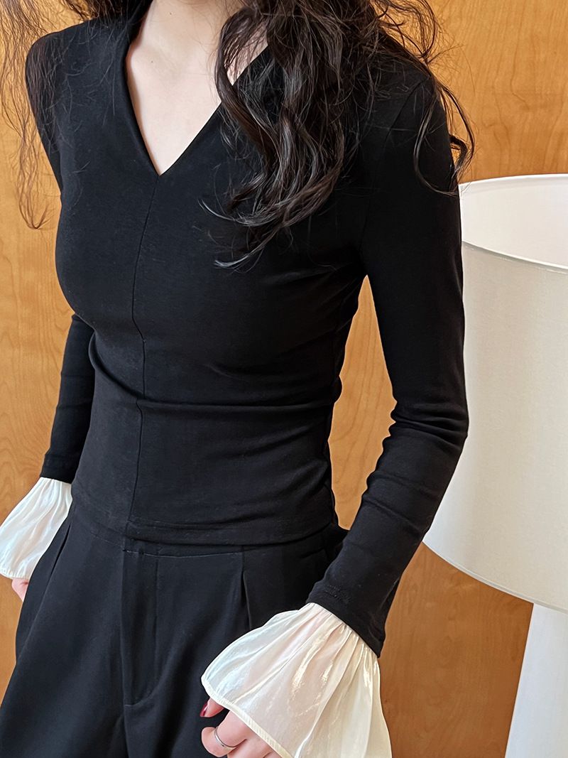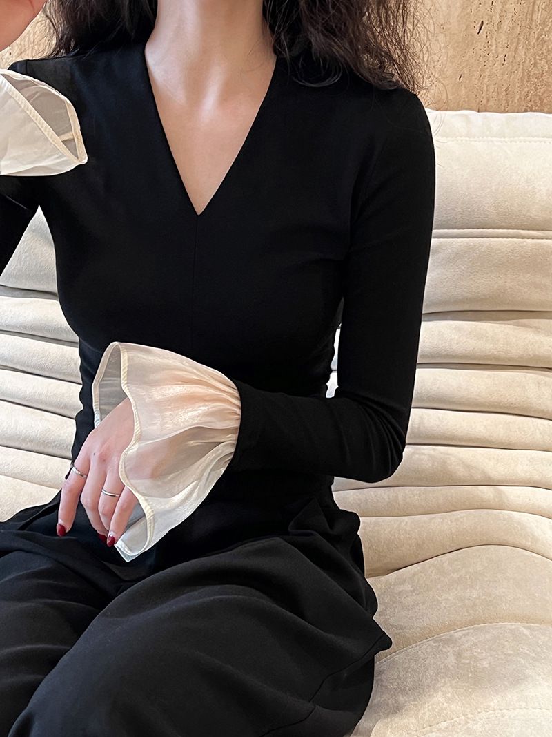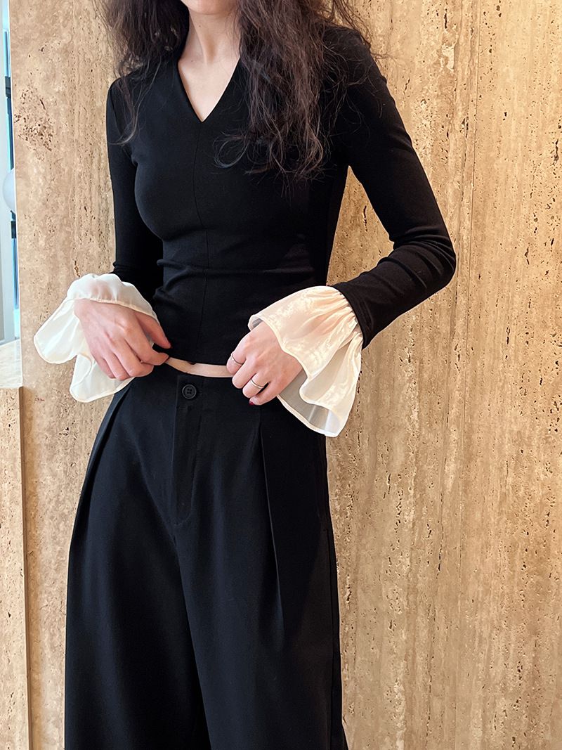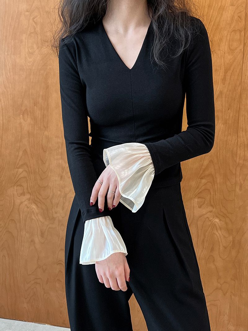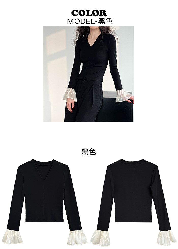 三種尺寸/透紗花邊袖/假兩件拼接袖口/紗袖/深V領/合身內搭上衣 - 休閒婚禮OL上班族假兩件拼接喇叭袖上衣長袖上衣多尺寸SML黑色