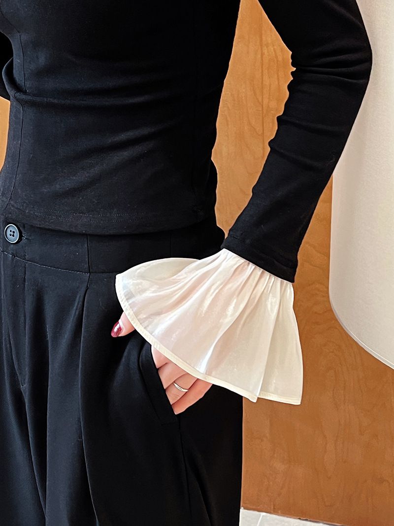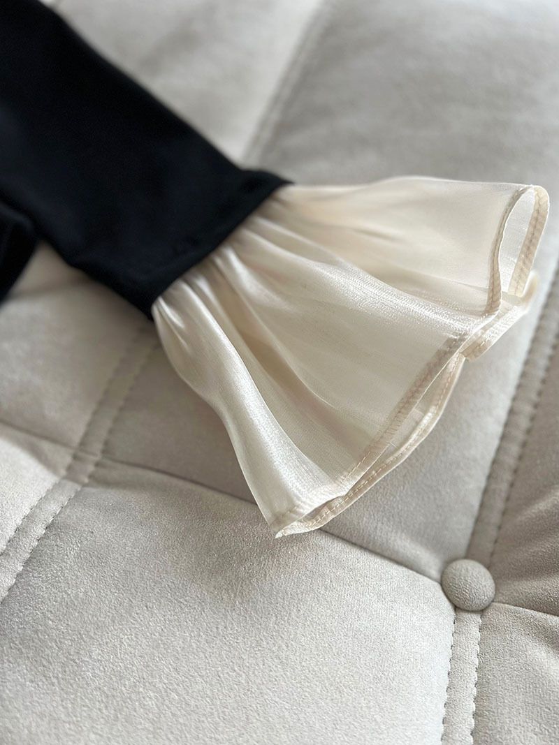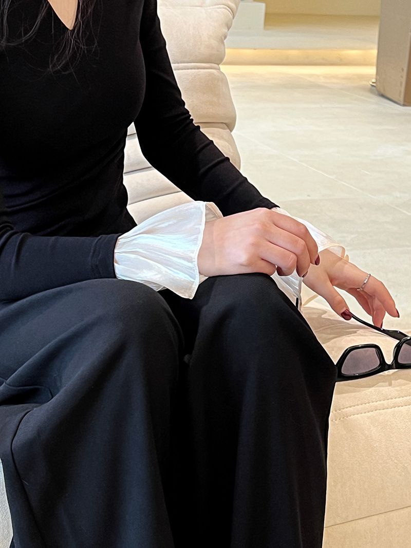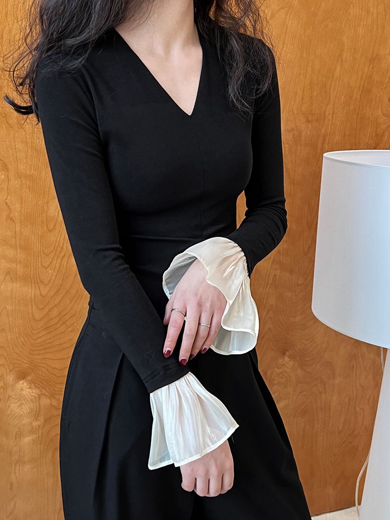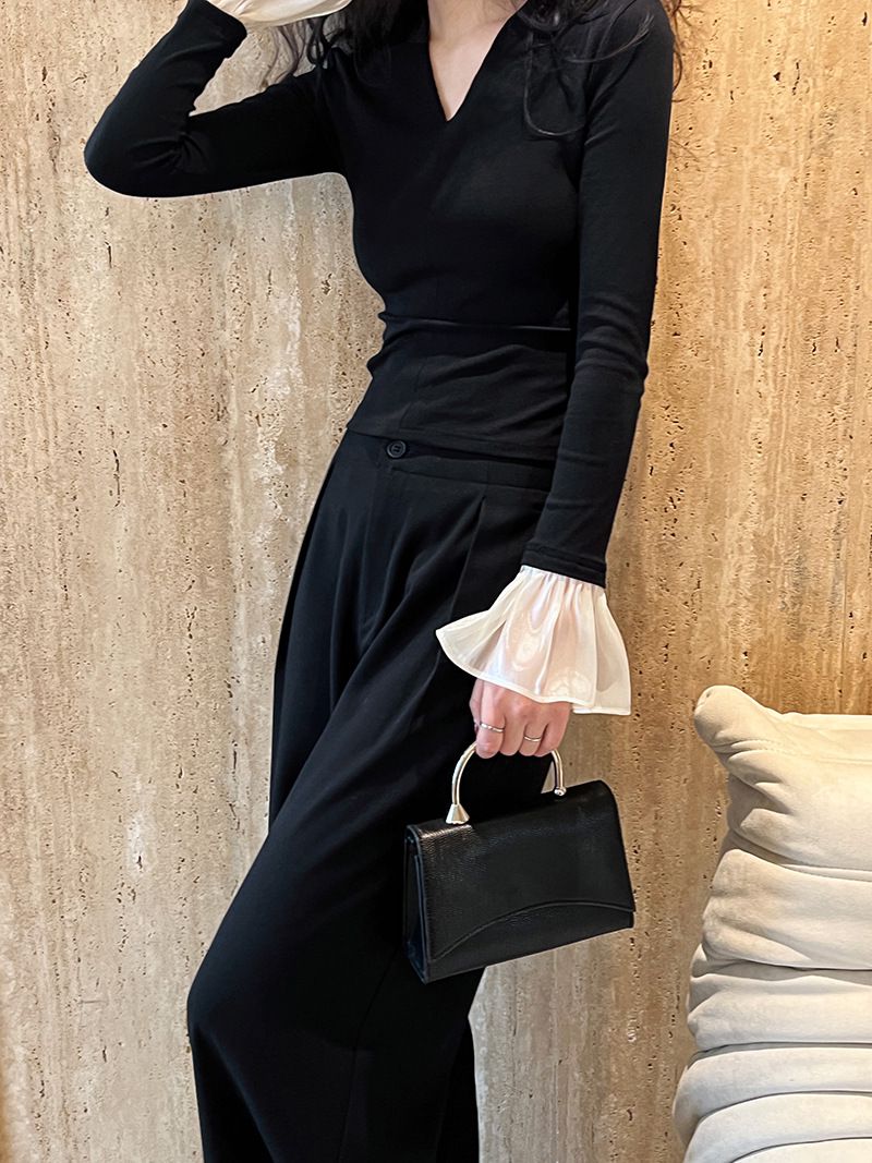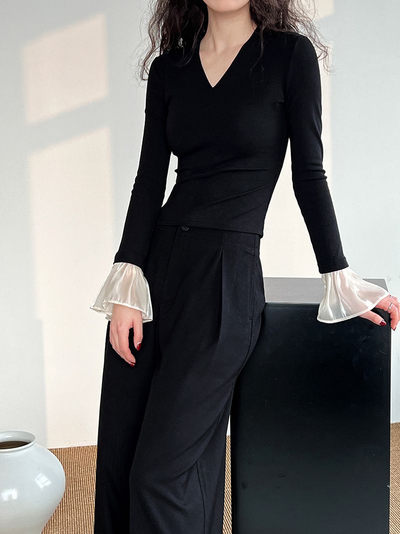 三種尺寸/透紗花邊袖/假兩件拼接袖口/紗袖/深V領/合身內搭上衣 - 休閒婚禮OL上班族假兩件拼接喇叭袖上衣長袖上衣多尺寸SML黑色