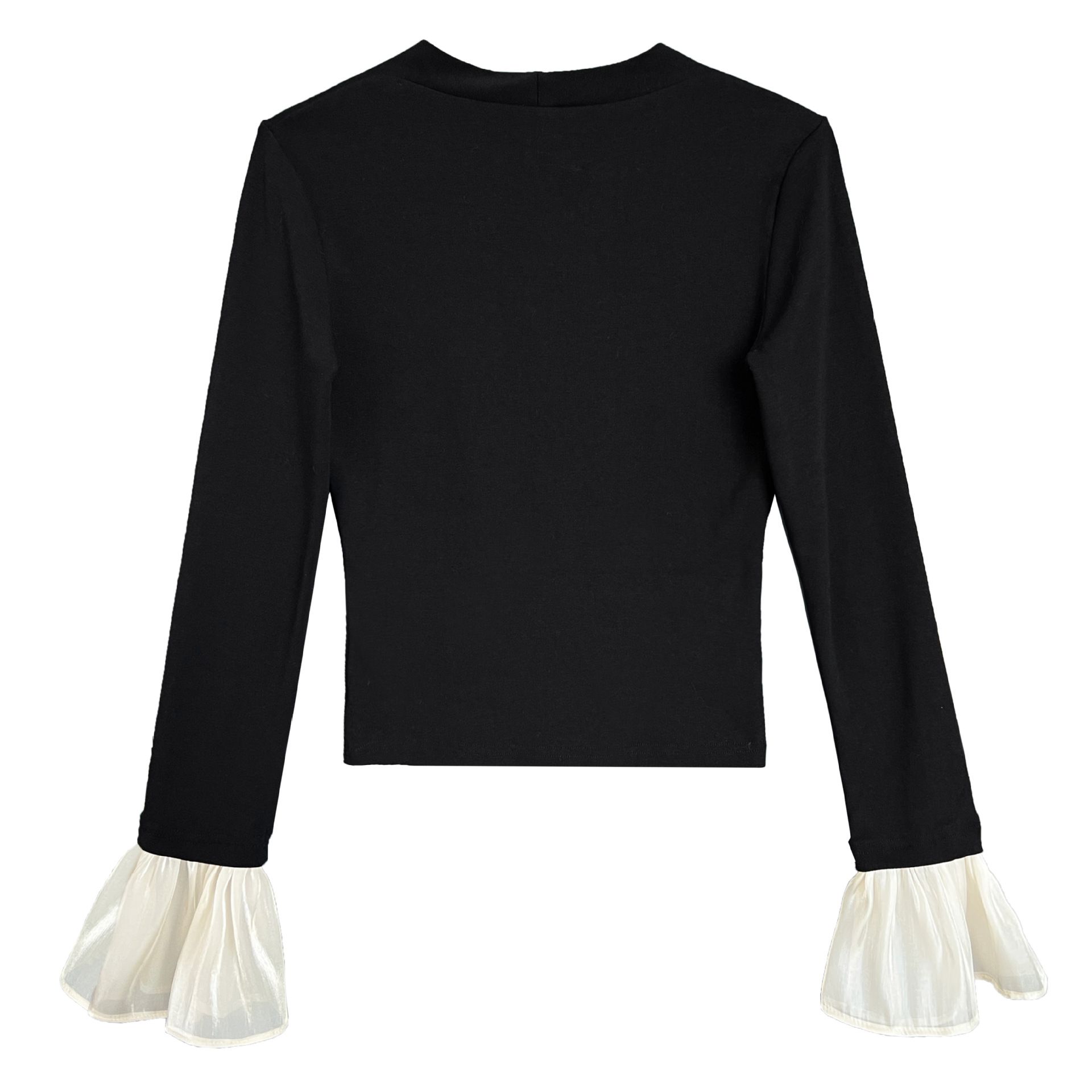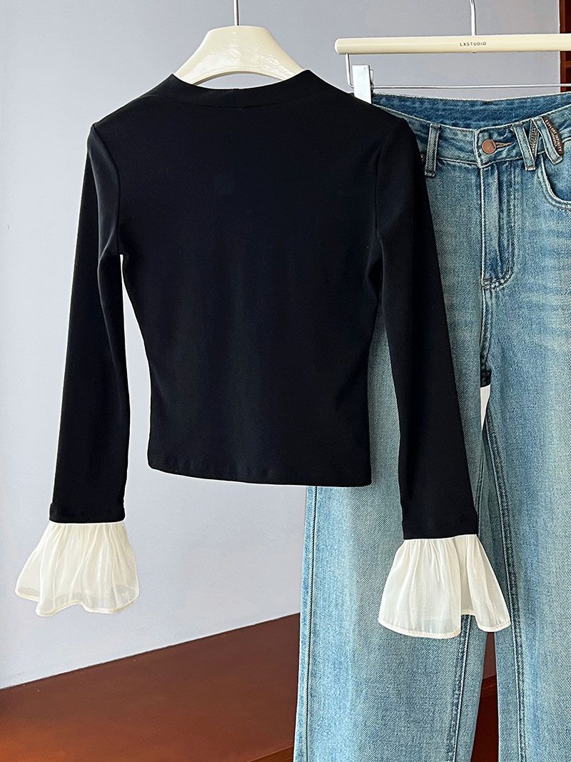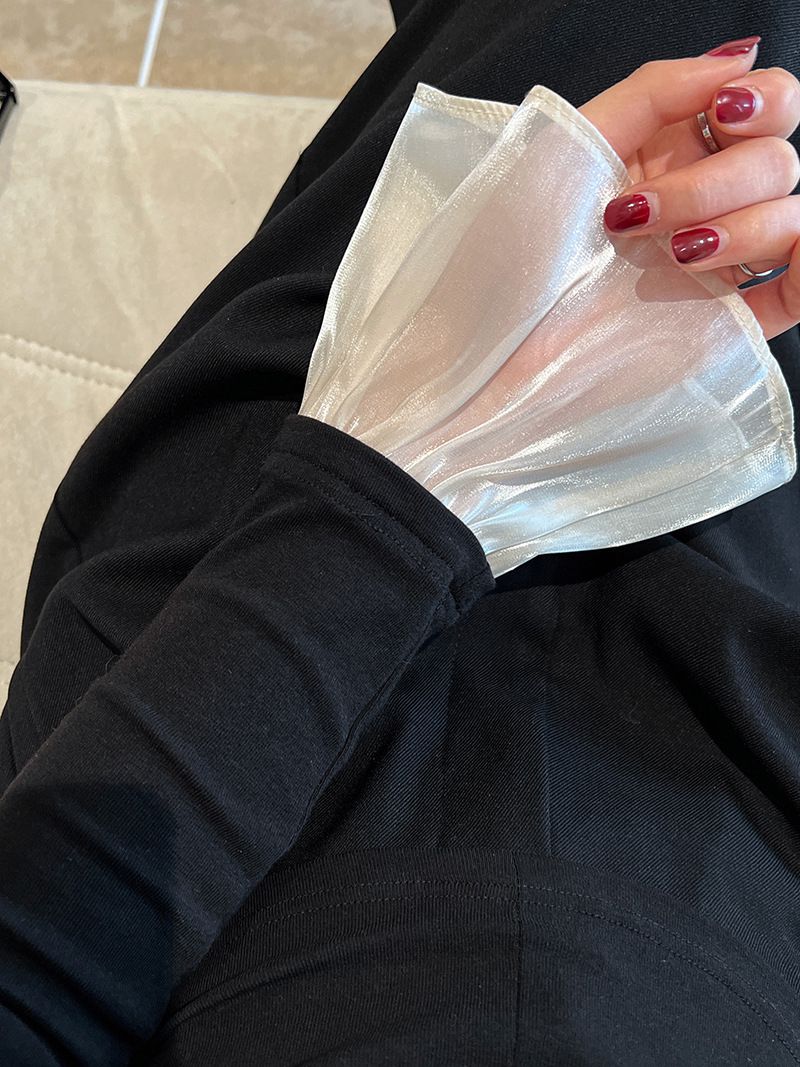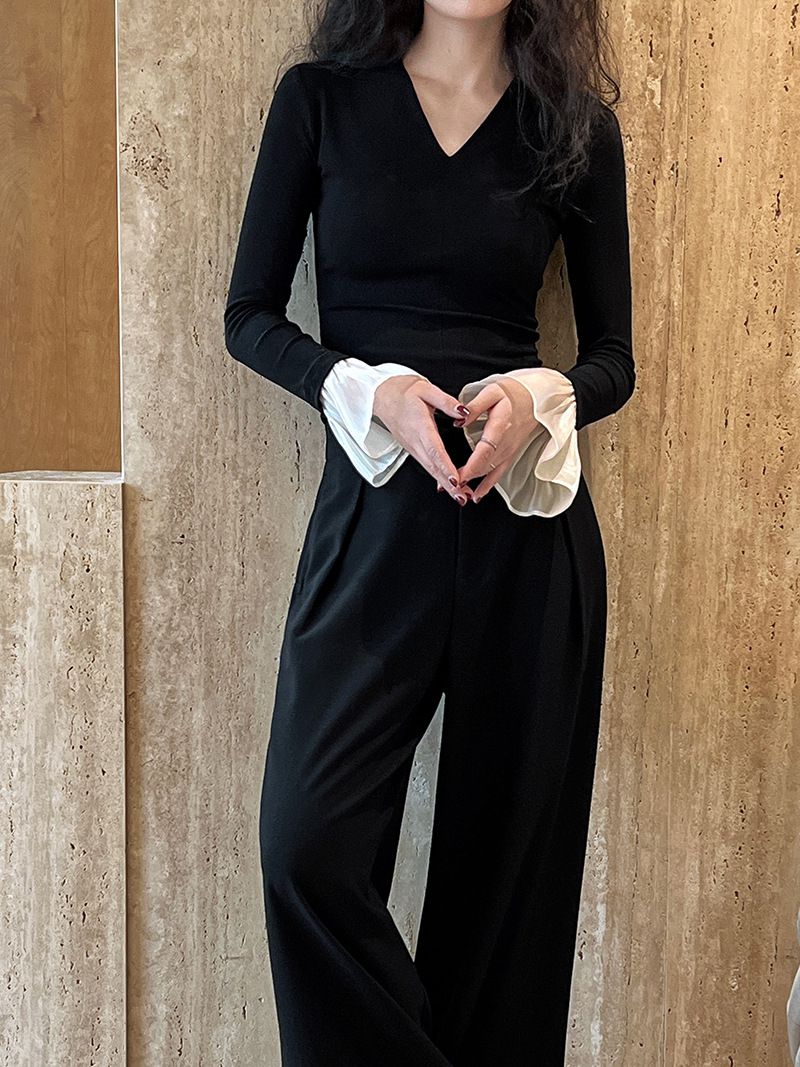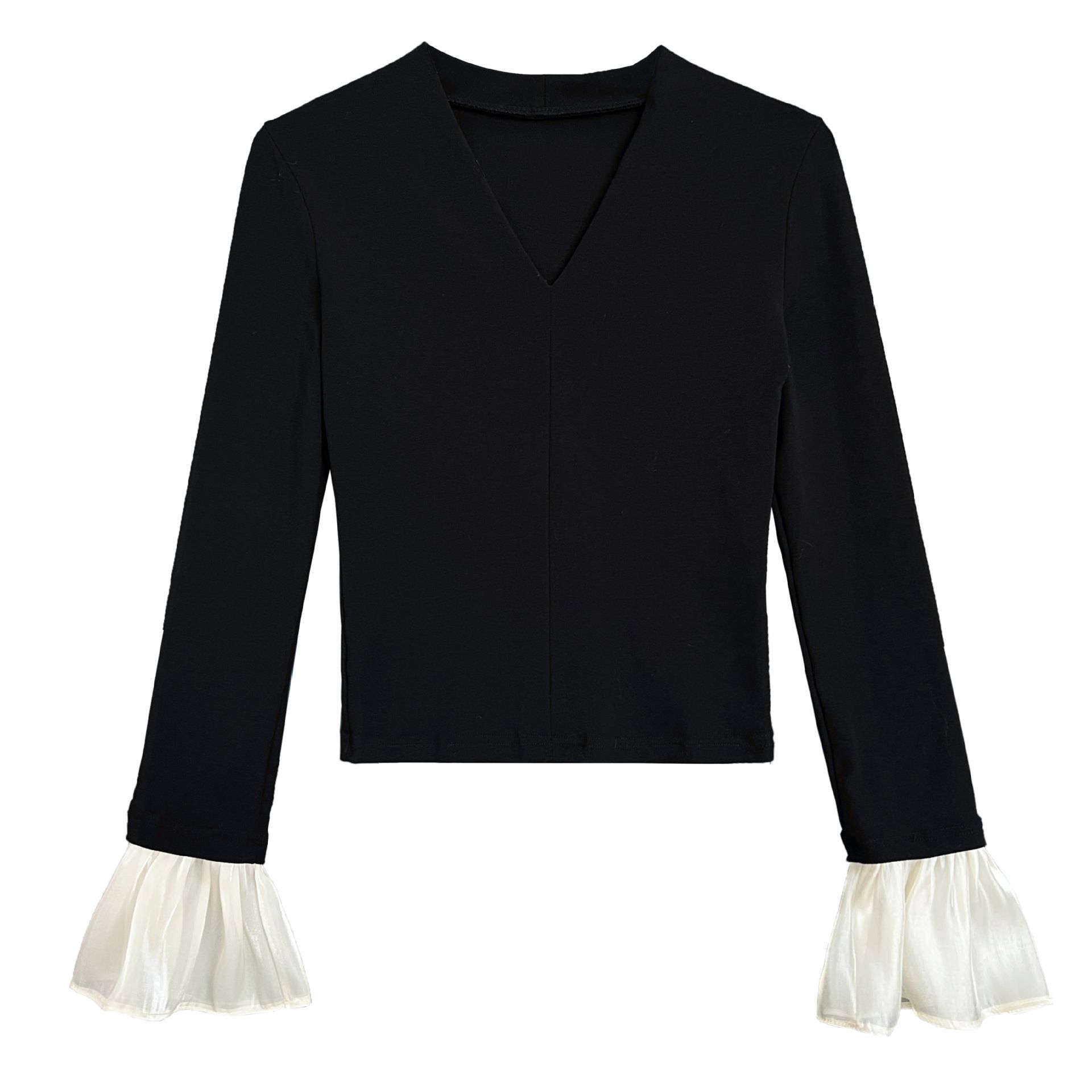 三種尺寸/透紗花邊袖/假兩件拼接袖口/紗袖/深V領/合身內搭上衣 - 休閒婚禮OL上班族假兩件拼接喇叭袖上衣長袖上衣多尺寸SML黑色