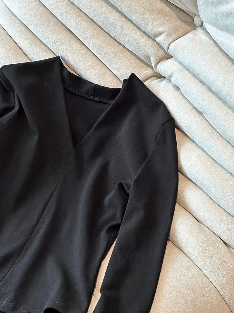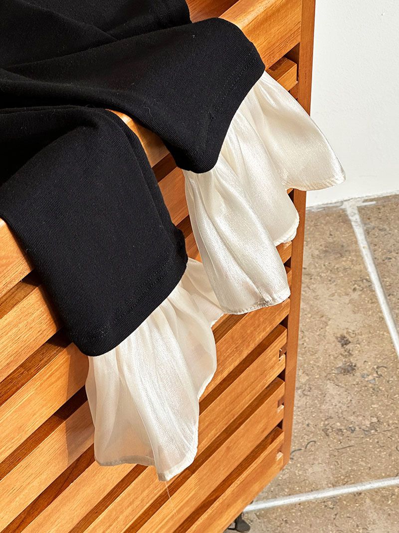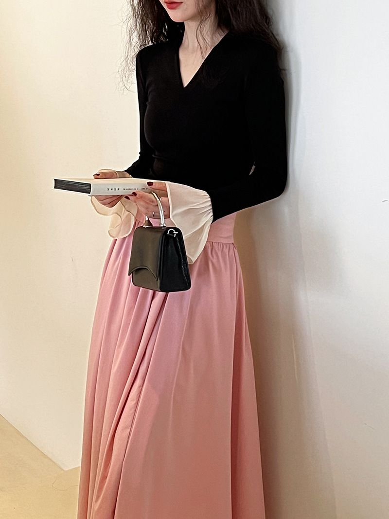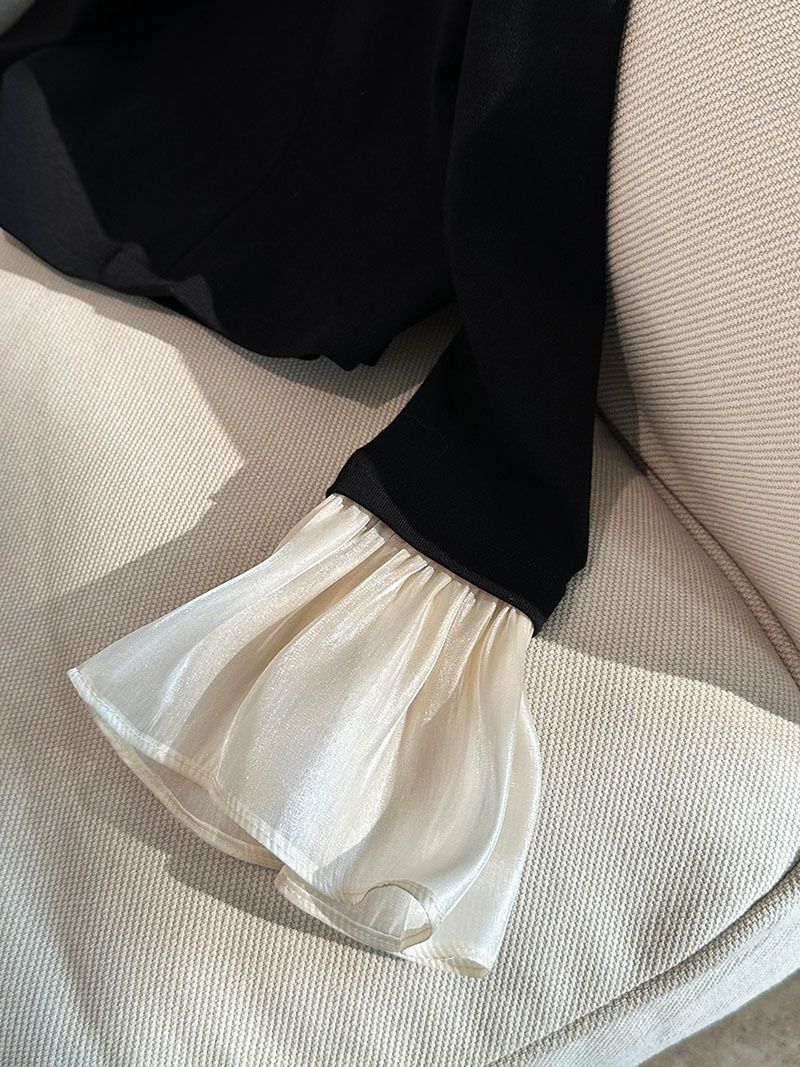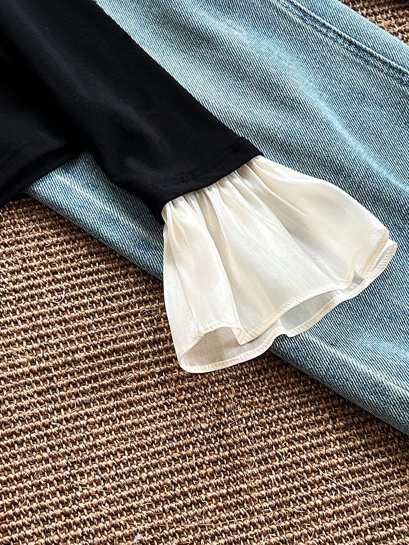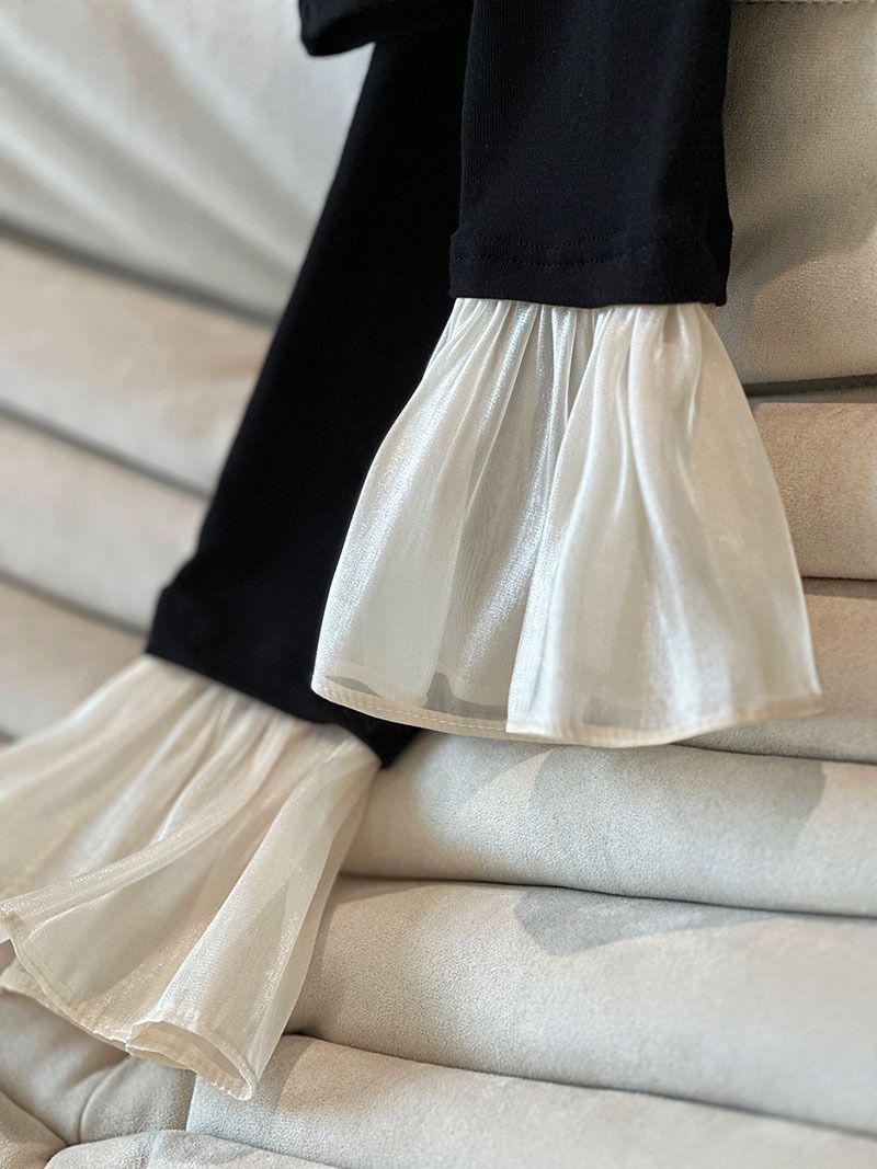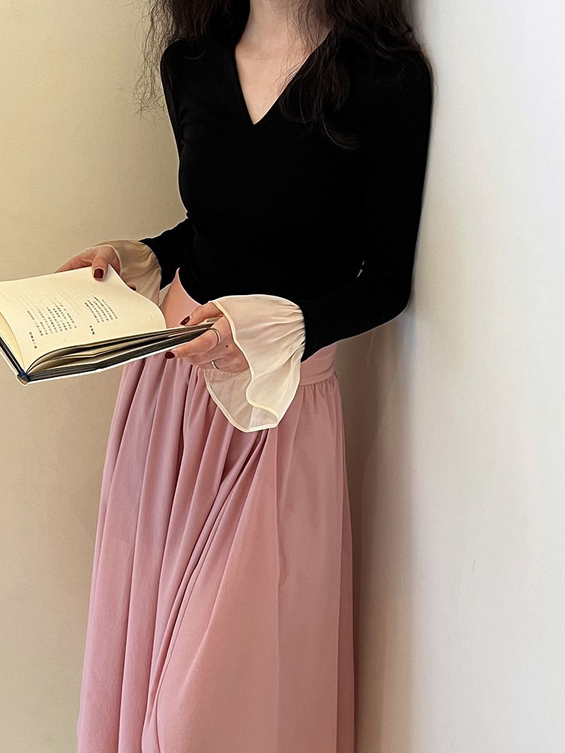三種尺寸/透紗花邊袖/假兩件拼接袖口/紗袖/深V領/合身內搭上衣 - 休閒婚禮OL上班族假兩件拼接喇叭袖上衣長袖上衣多尺寸SML黑色