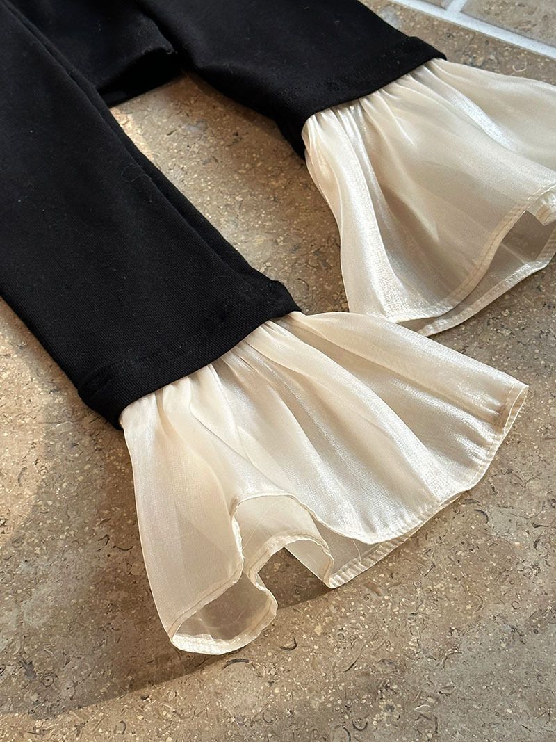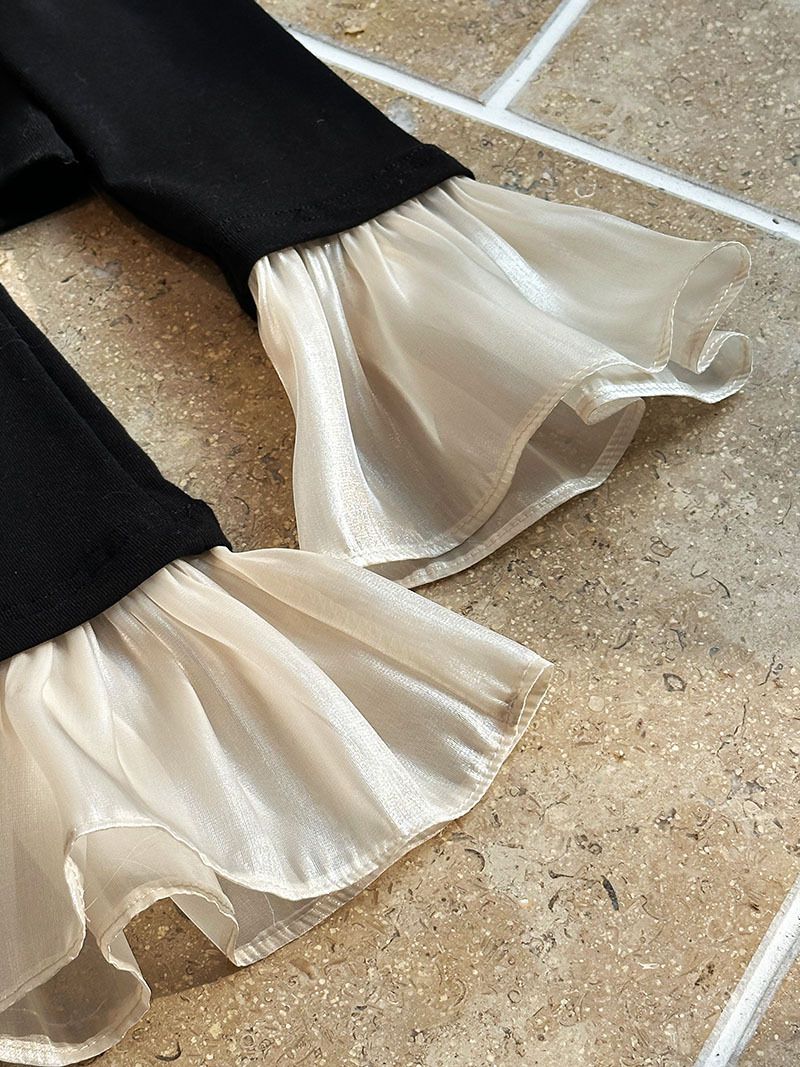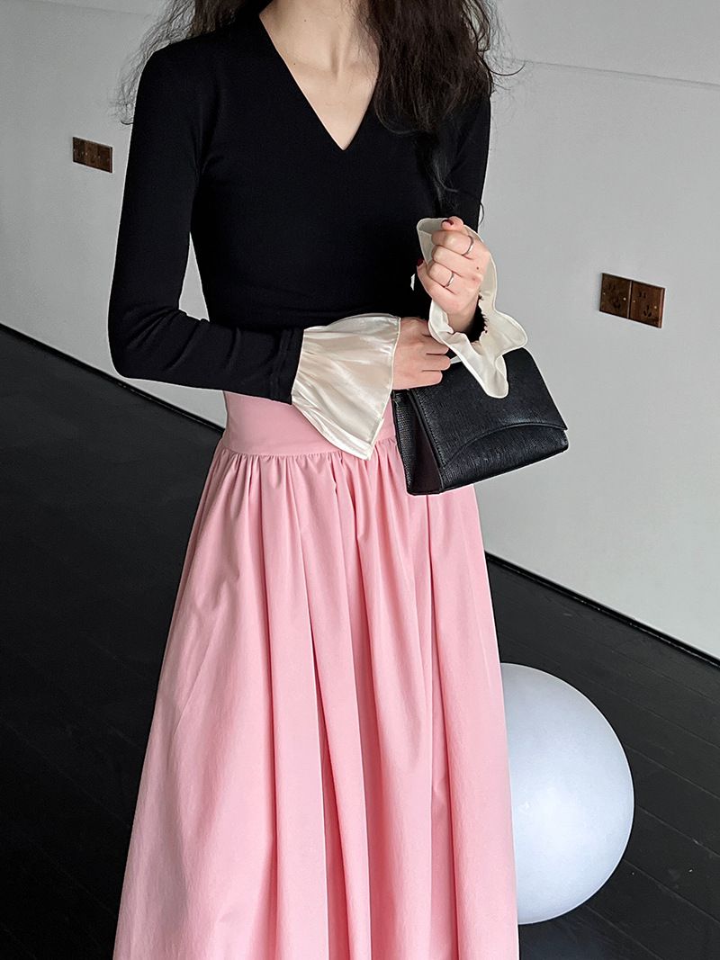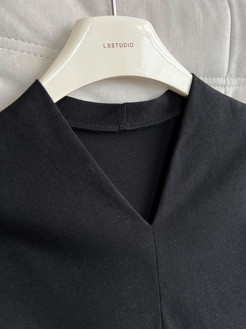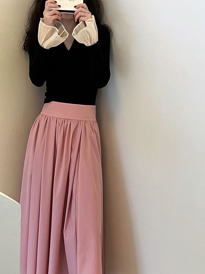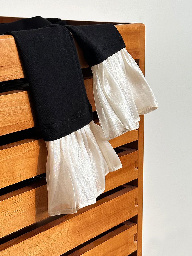 三種尺寸/透紗花邊袖/假兩件拼接袖口/紗袖/深V領/合身內搭上衣 - 休閒婚禮OL上班族假兩件拼接喇叭袖上衣長袖上衣多尺寸SML黑色