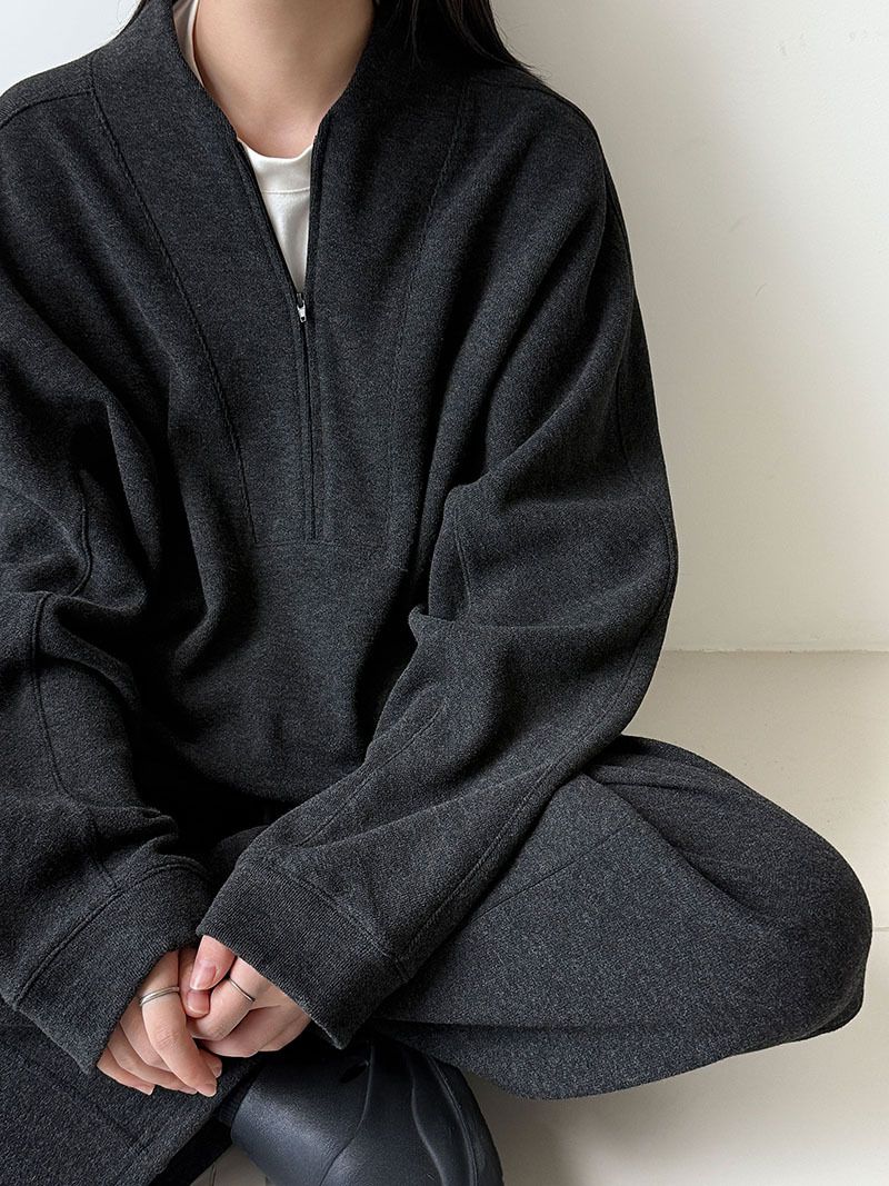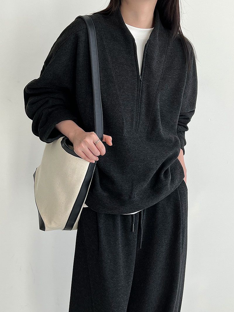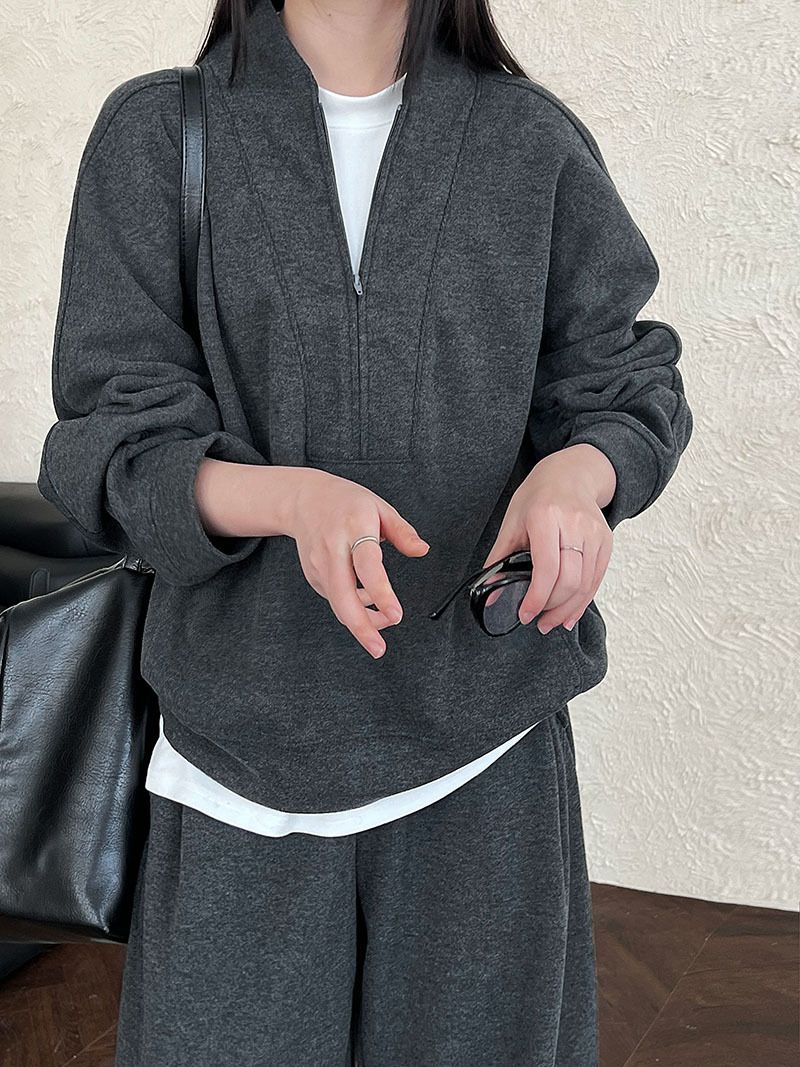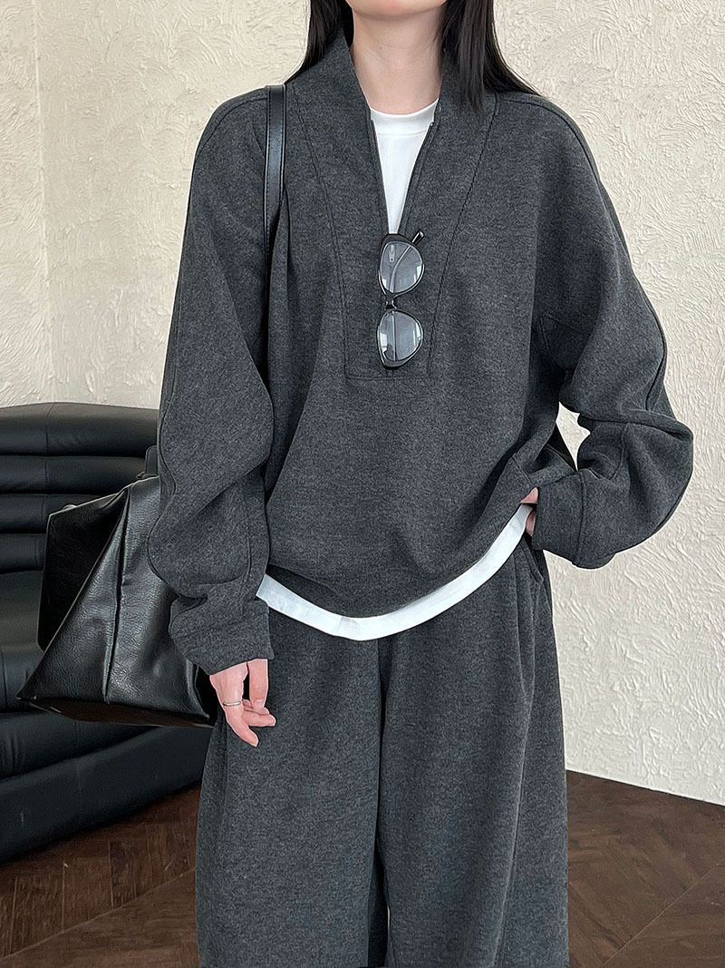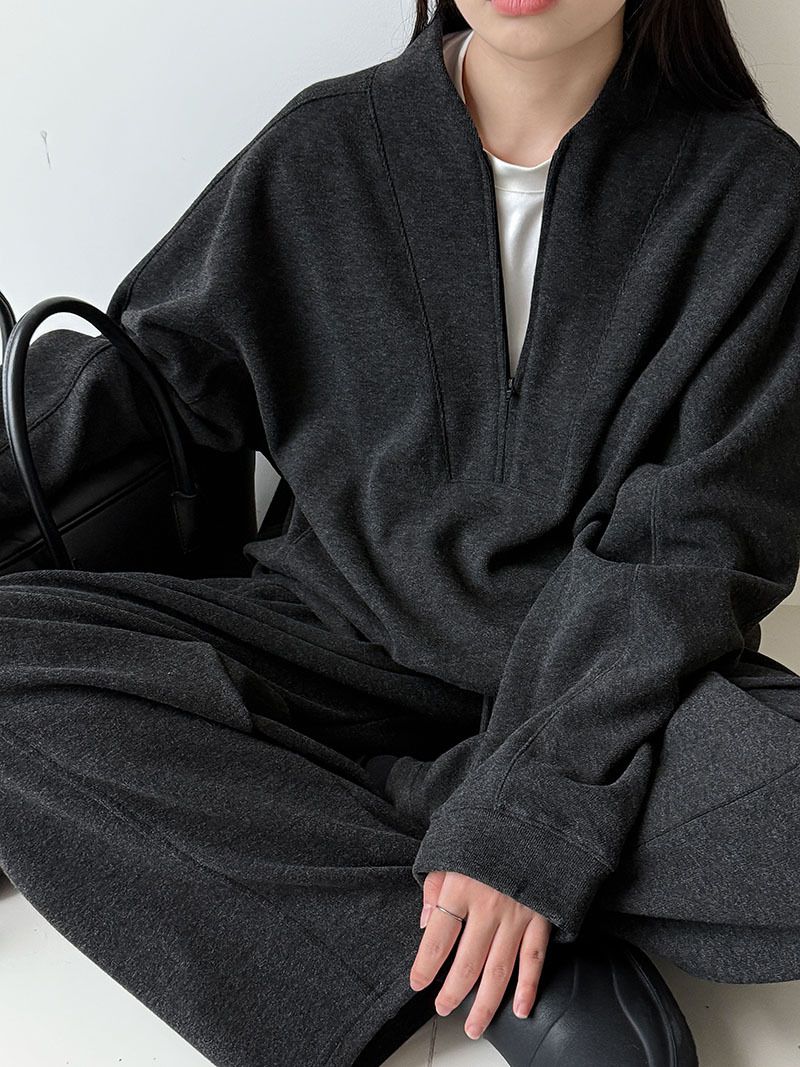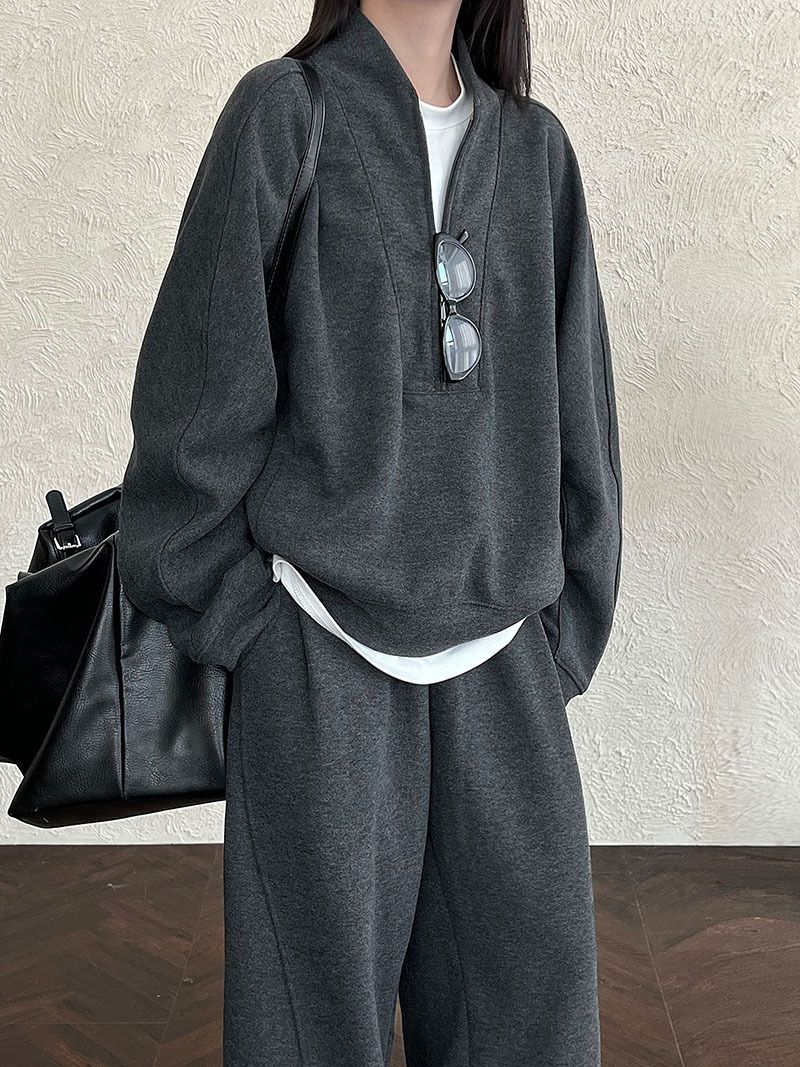 兩種尺寸/超值兩件組/半開襟拉鍊領/V領/連肩袖/飛鼠袖/抽繩鬆緊腰/雙口袋/出芽車線/彎刀褲/寬褲管 - 休閒居家簡約百搭素面兩件式套裝拉鍊V領套裝長袖上衣長褲多尺寸ML黑色深灰色