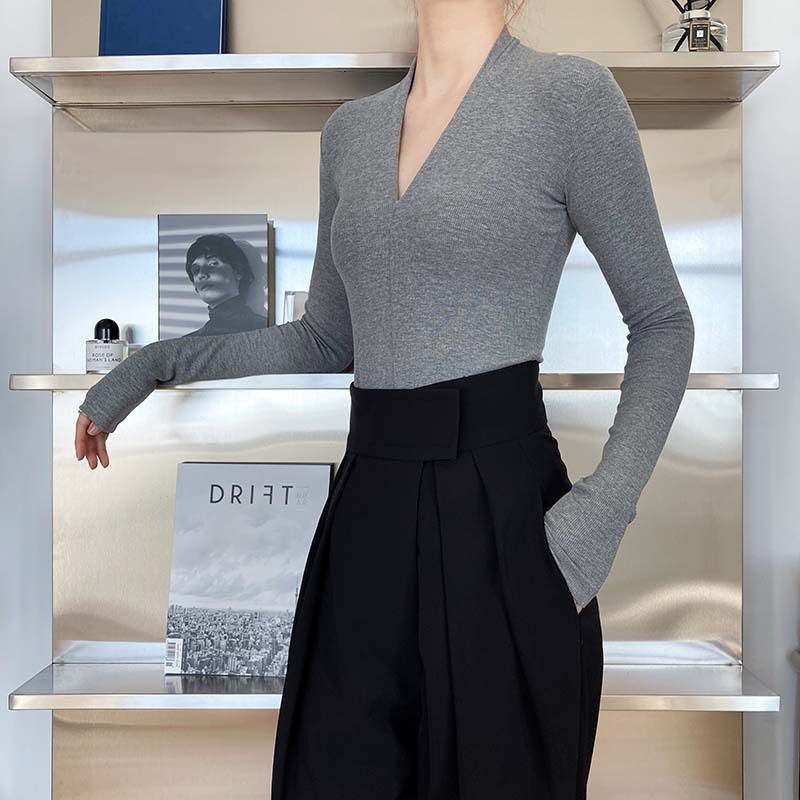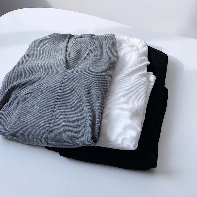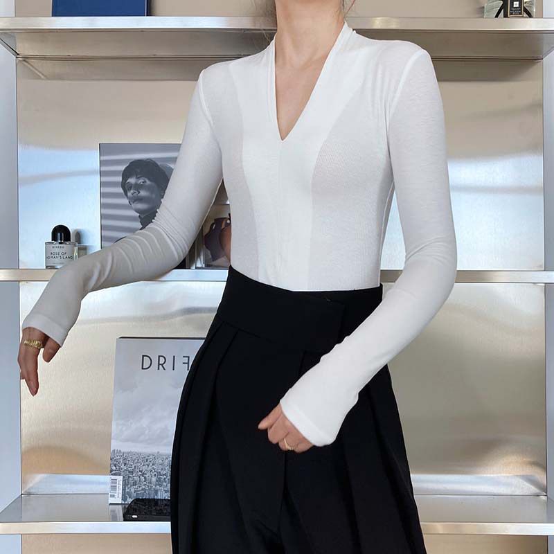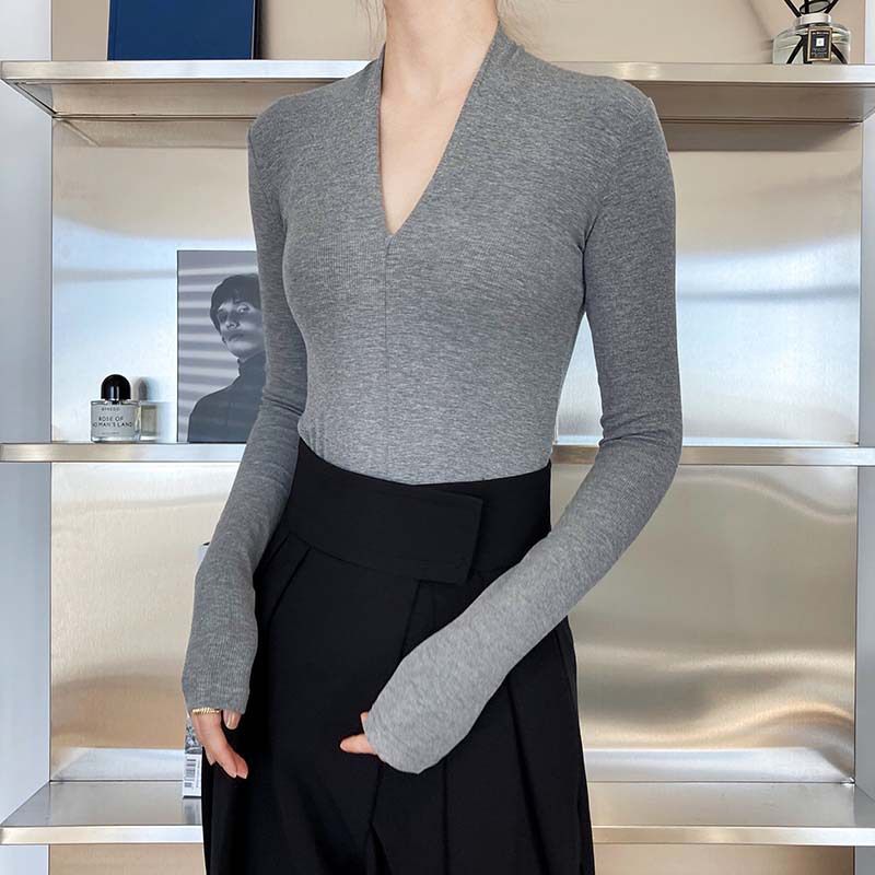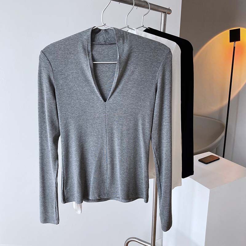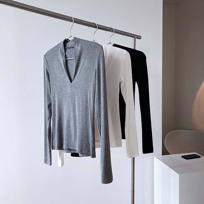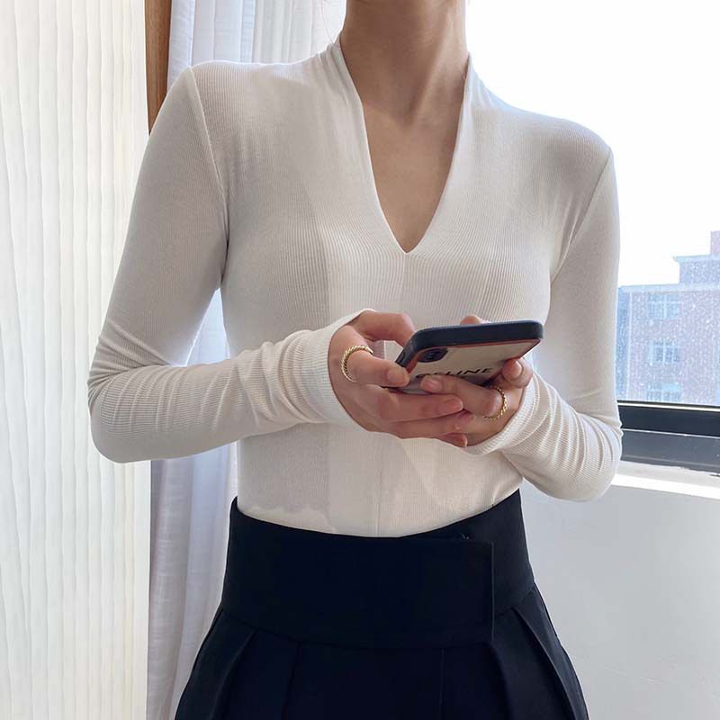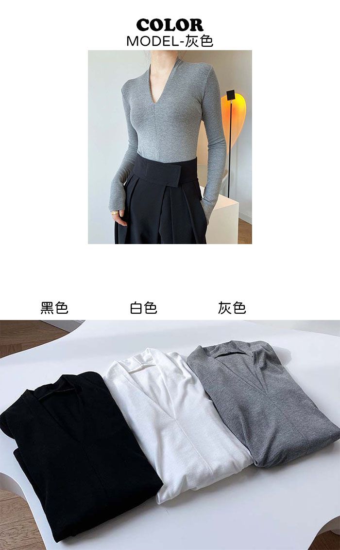 兩種尺寸/彈力面料/短版上衣/貼身內搭/深V領 - 休閒居家OL上班族簡約百搭素面彈力深V領上衣長袖上衣多尺寸ML黑色白色灰色