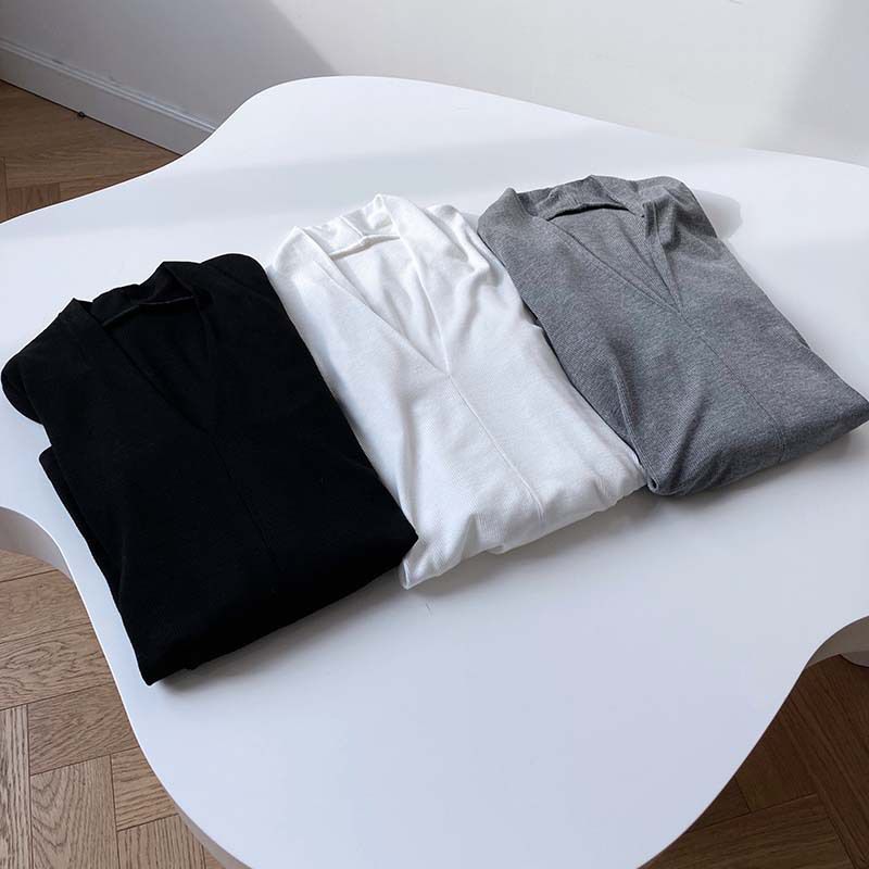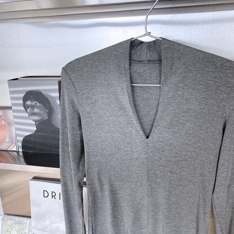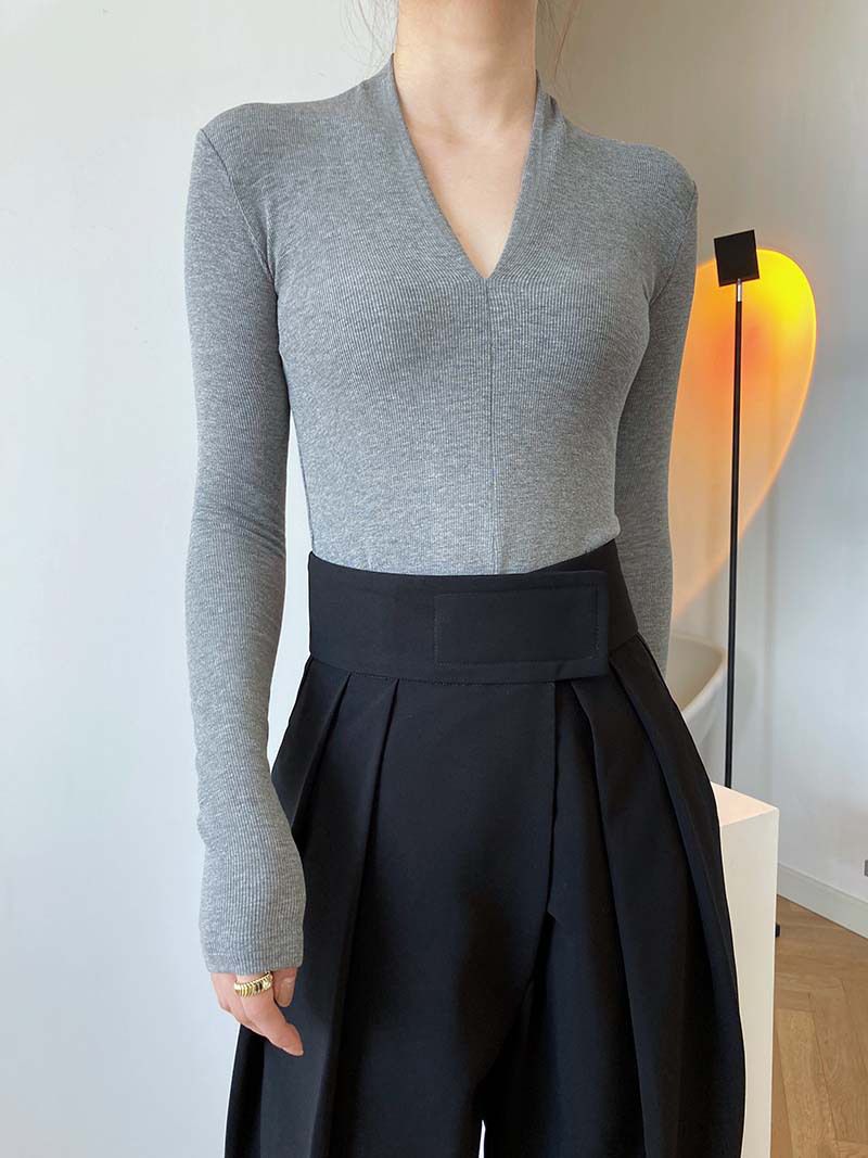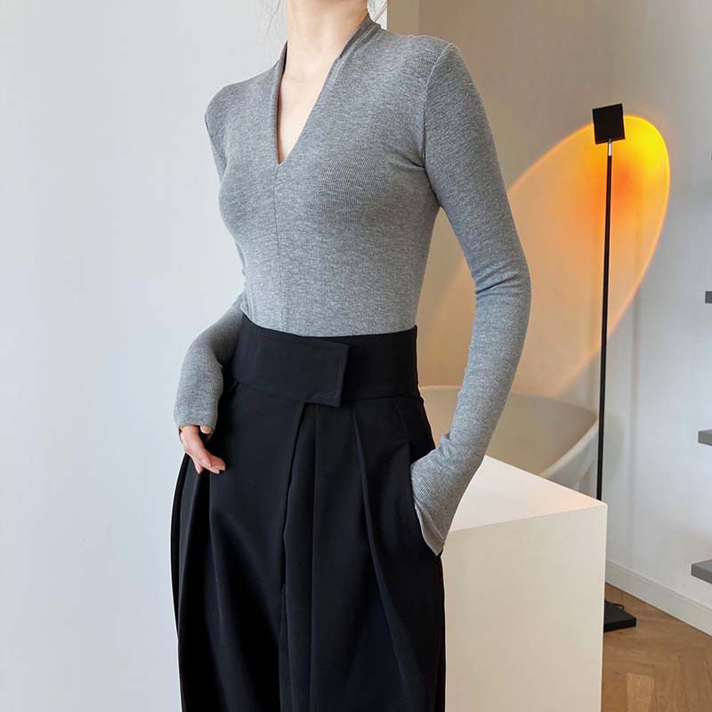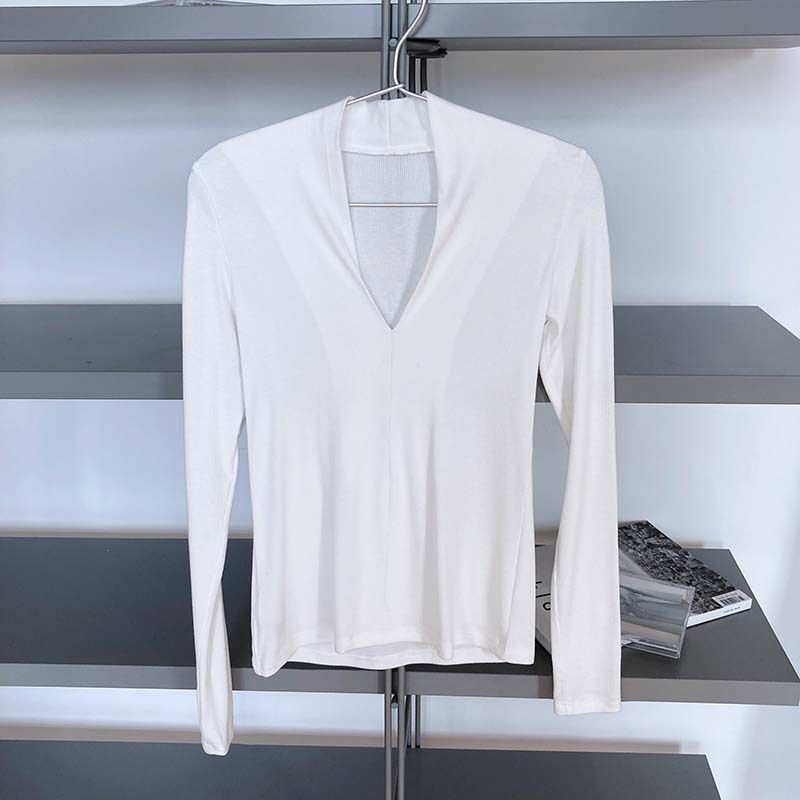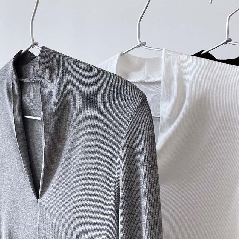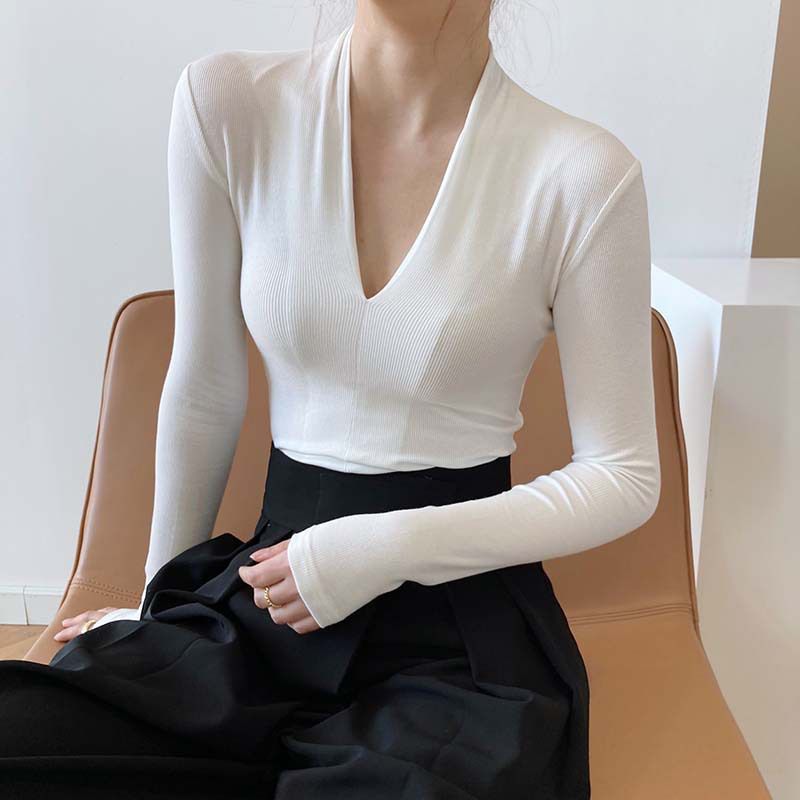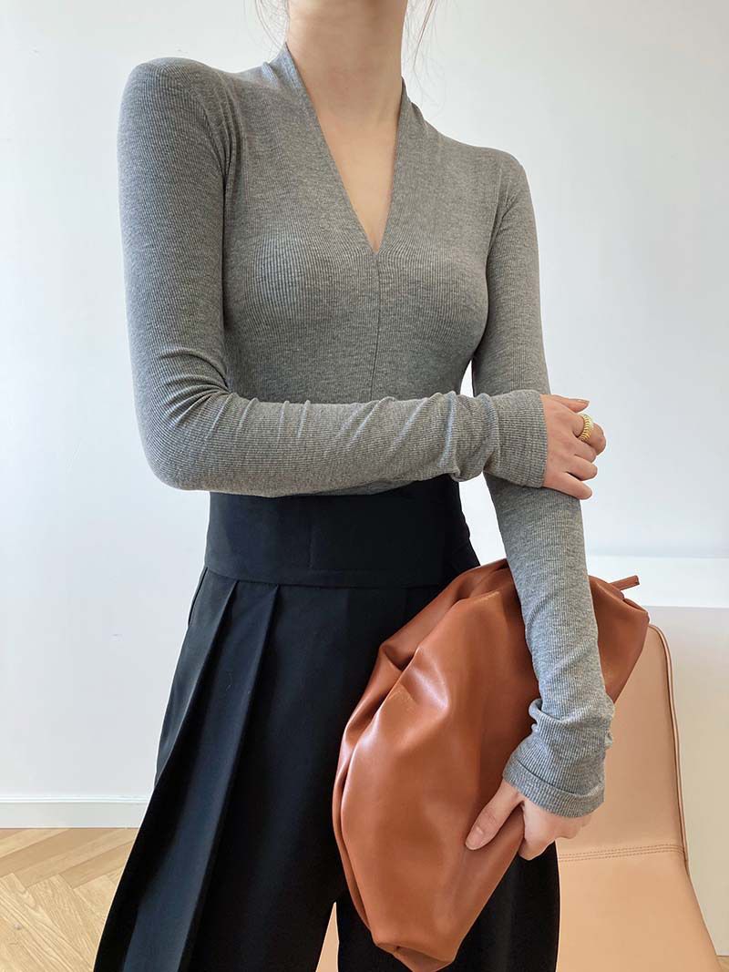 兩種尺寸/彈力面料/短版上衣/貼身內搭/深V領 - 休閒居家OL上班族簡約百搭素面彈力深V領上衣長袖上衣多尺寸ML黑色白色灰色