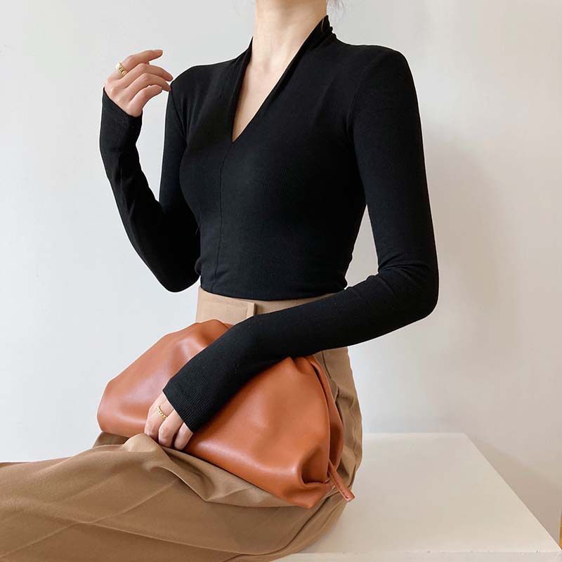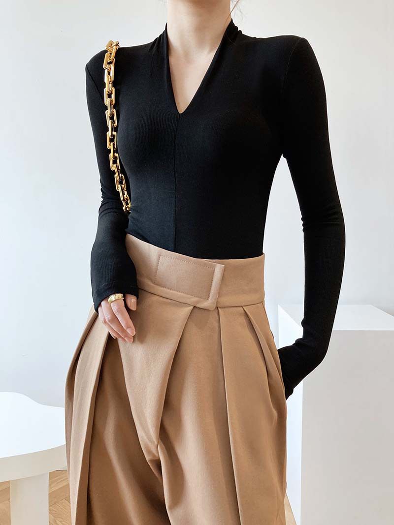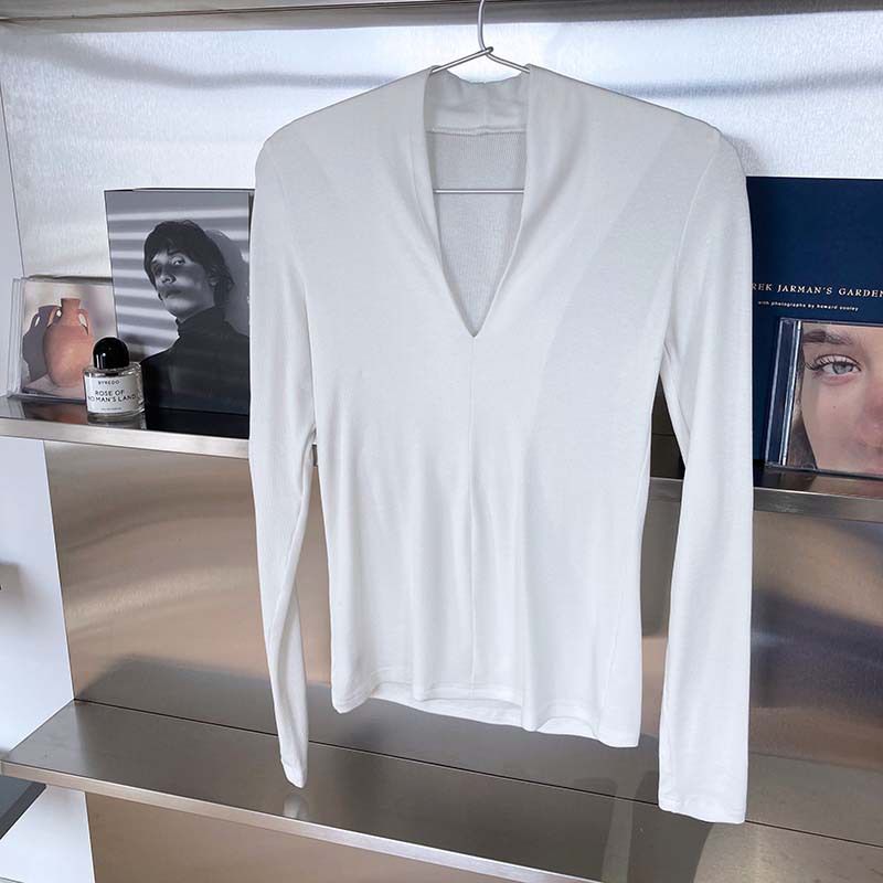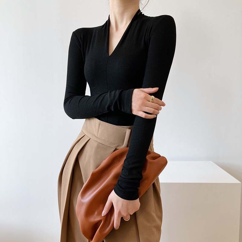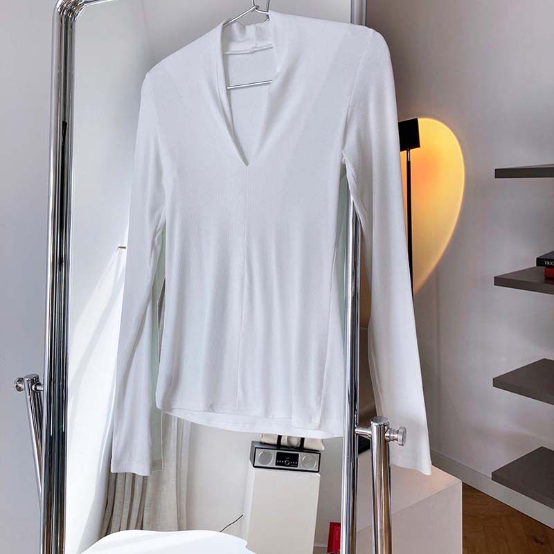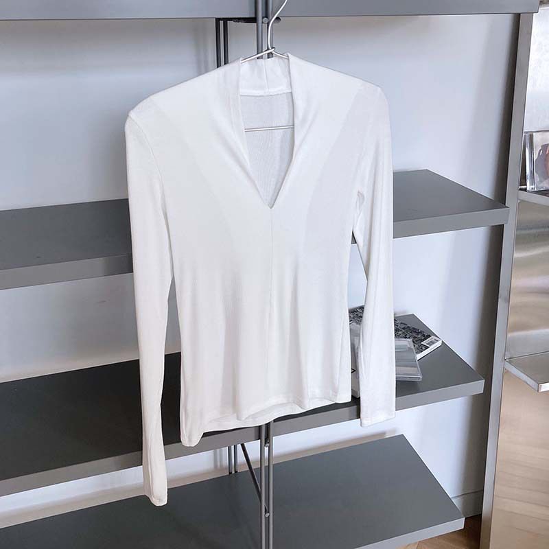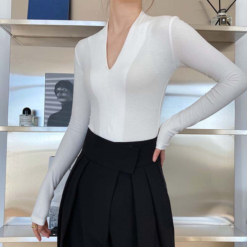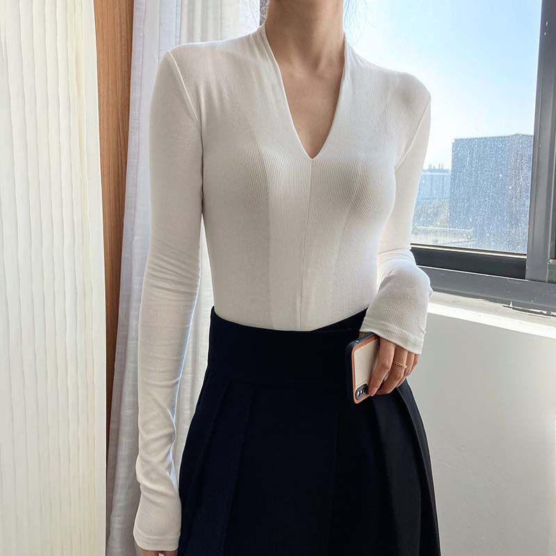 【C60159】品牌 彈力深V領上衣-素面短版貼身內搭長袖上衣