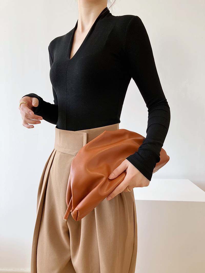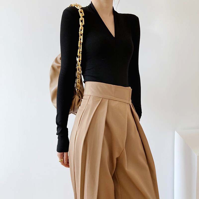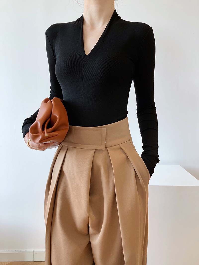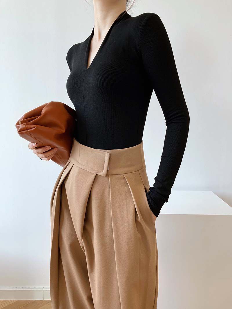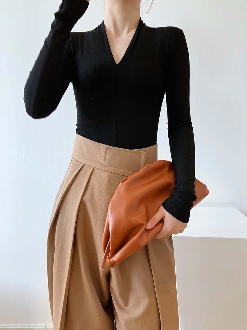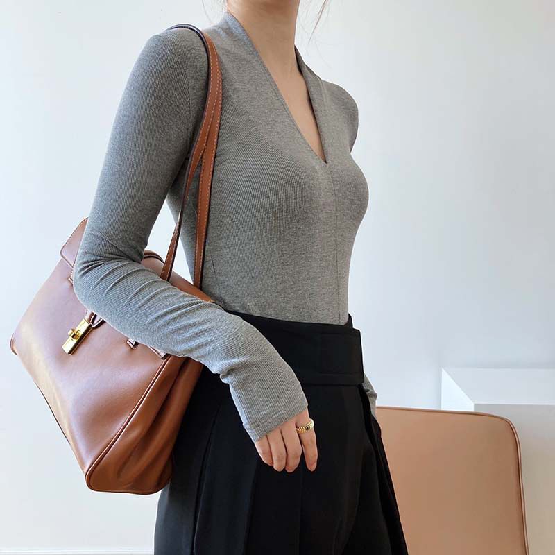 【C60159】品牌 彈力深V領上衣-素面短版貼身內搭長袖上衣