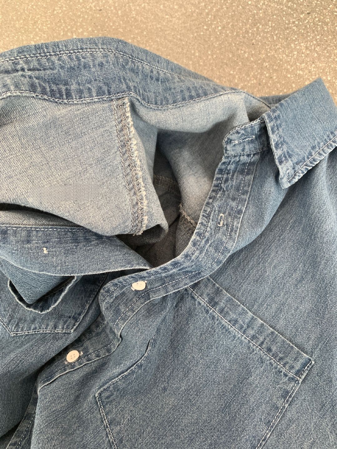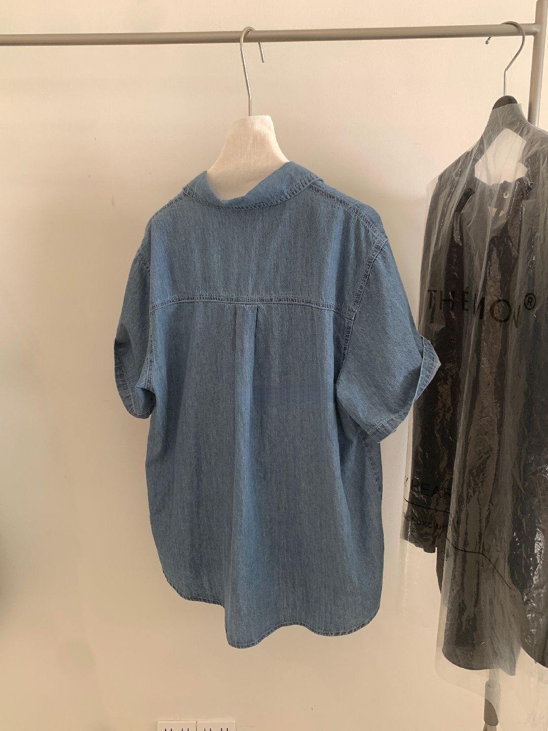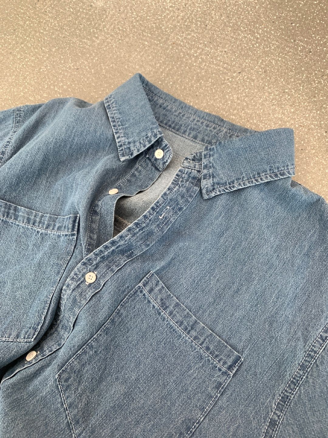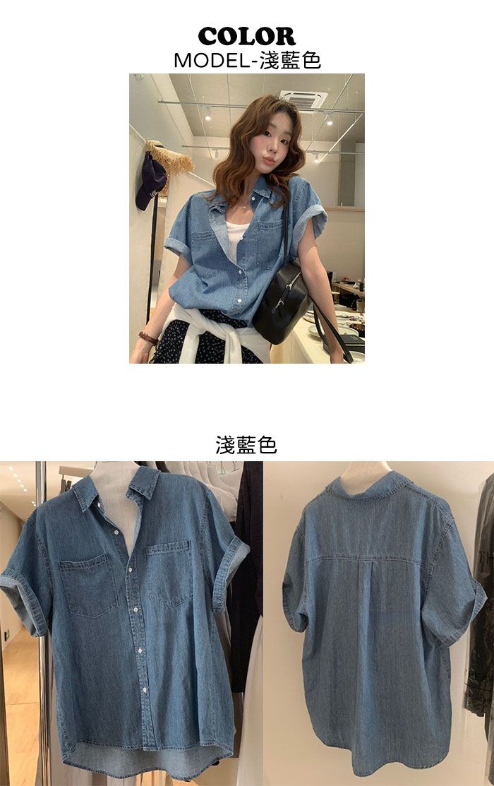 前短後長/後襬弧形/雙口袋/開襟排釦 - 休閒居家簡約百搭素面牛仔襯衫外套五分袖上衣淺藍色