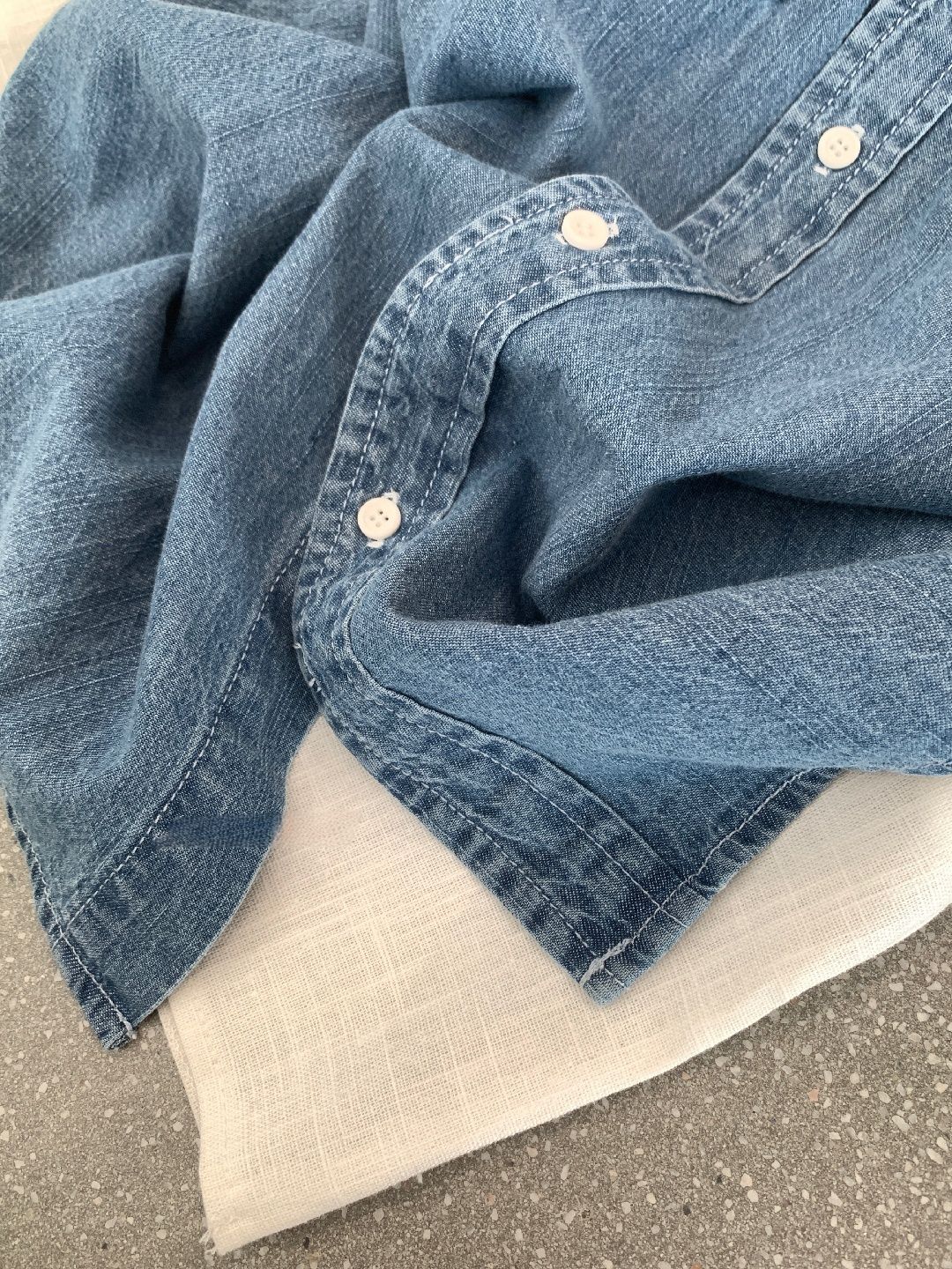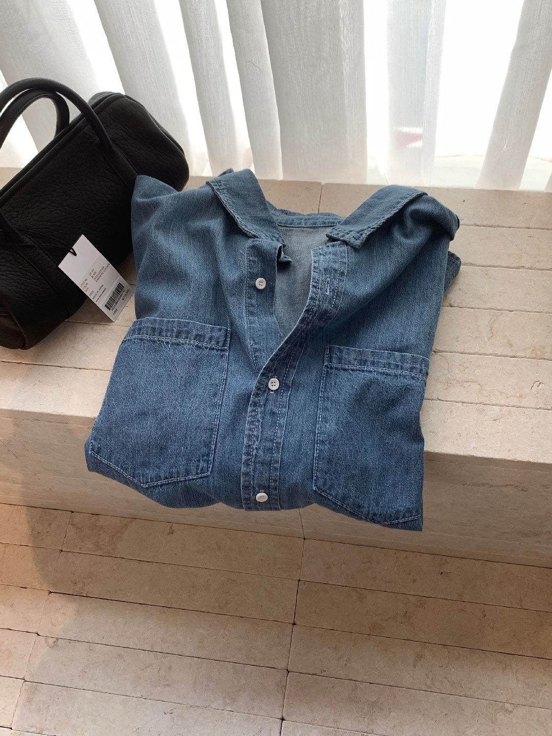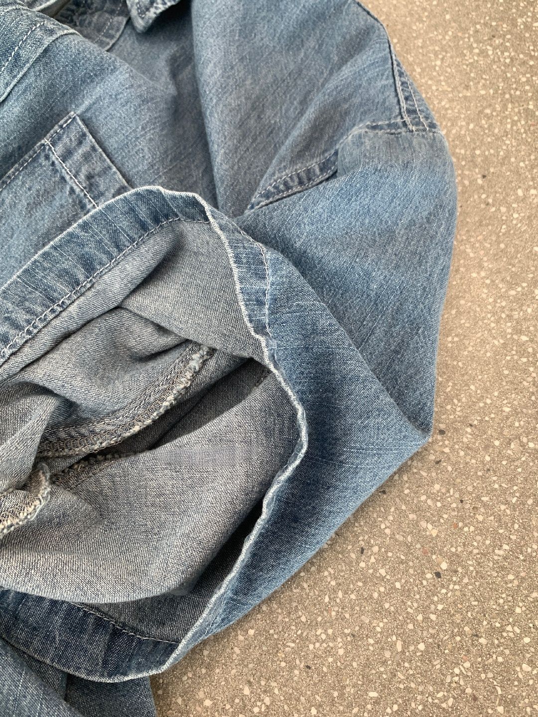 前短後長/後襬弧形/雙口袋/開襟排釦 - 休閒居家簡約百搭素面牛仔襯衫外套五分袖上衣淺藍色