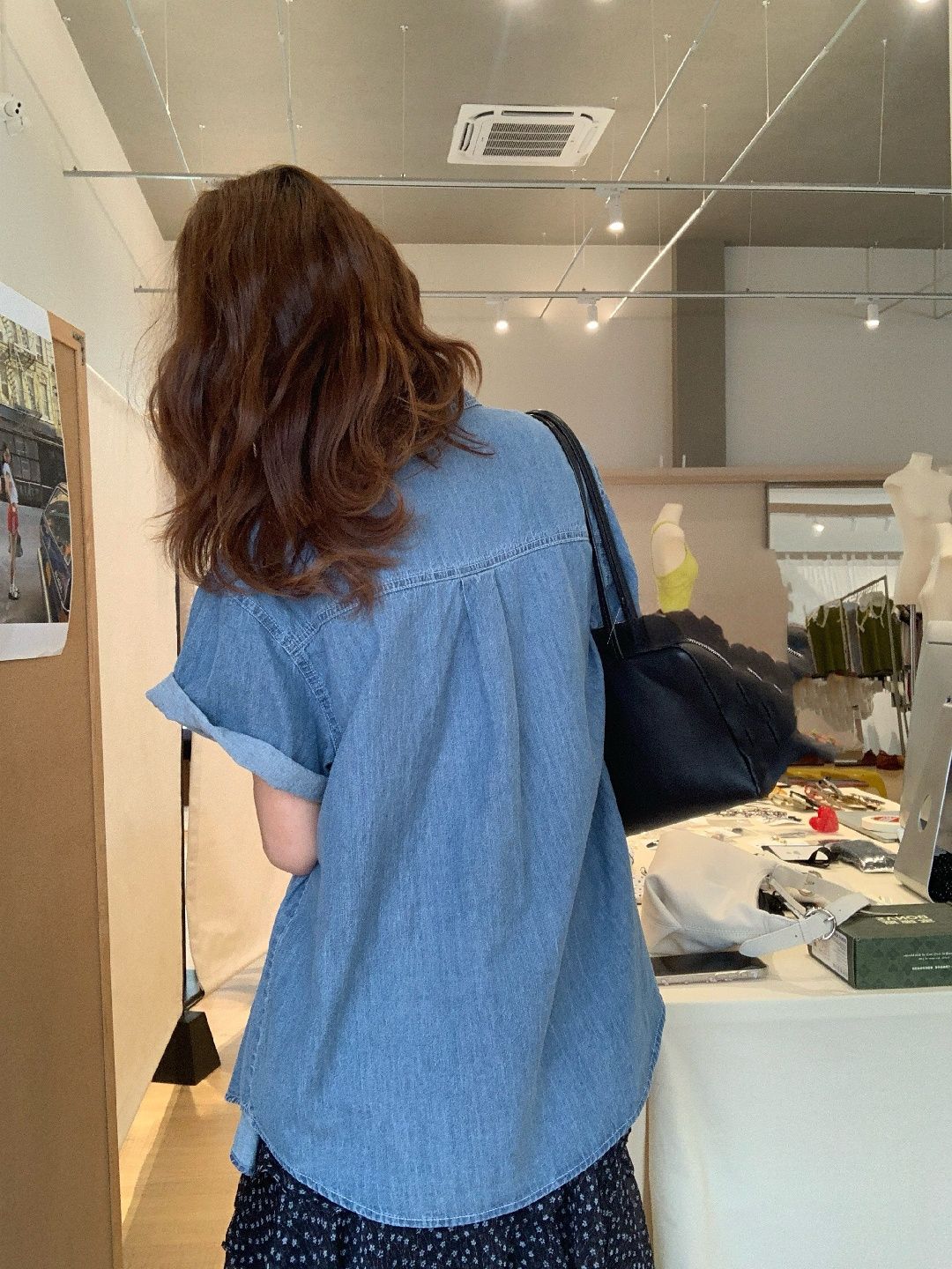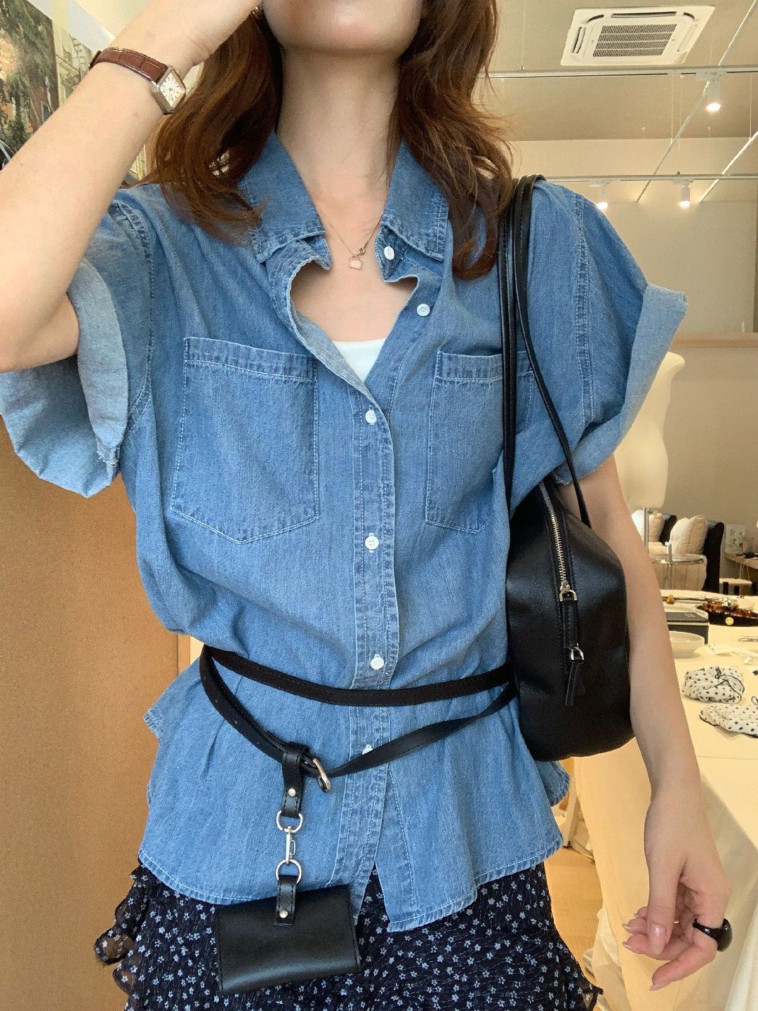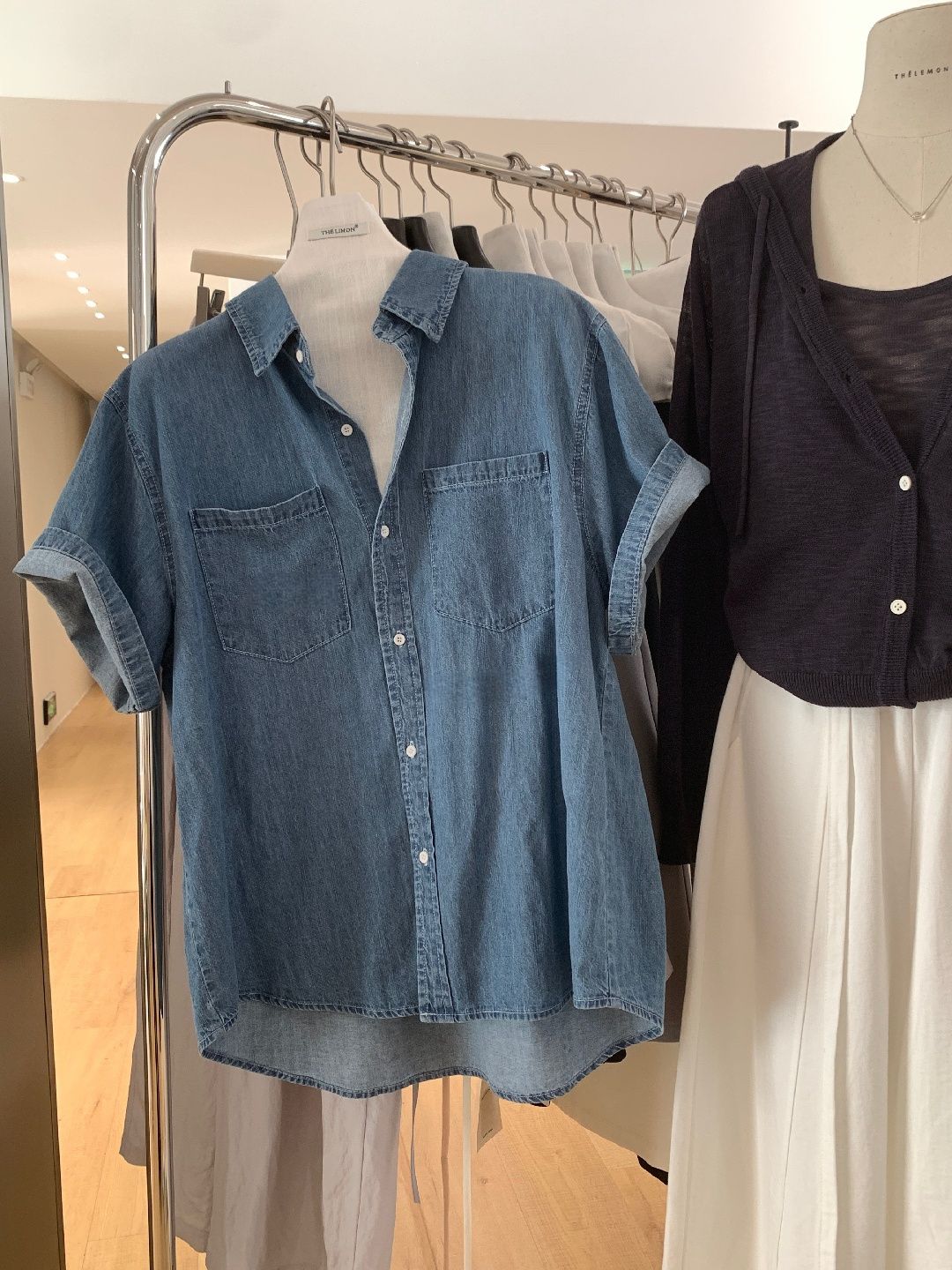 【C73818】品牌 牛仔襯衫外套-素面前短後長雙口袋五分袖上衣★★