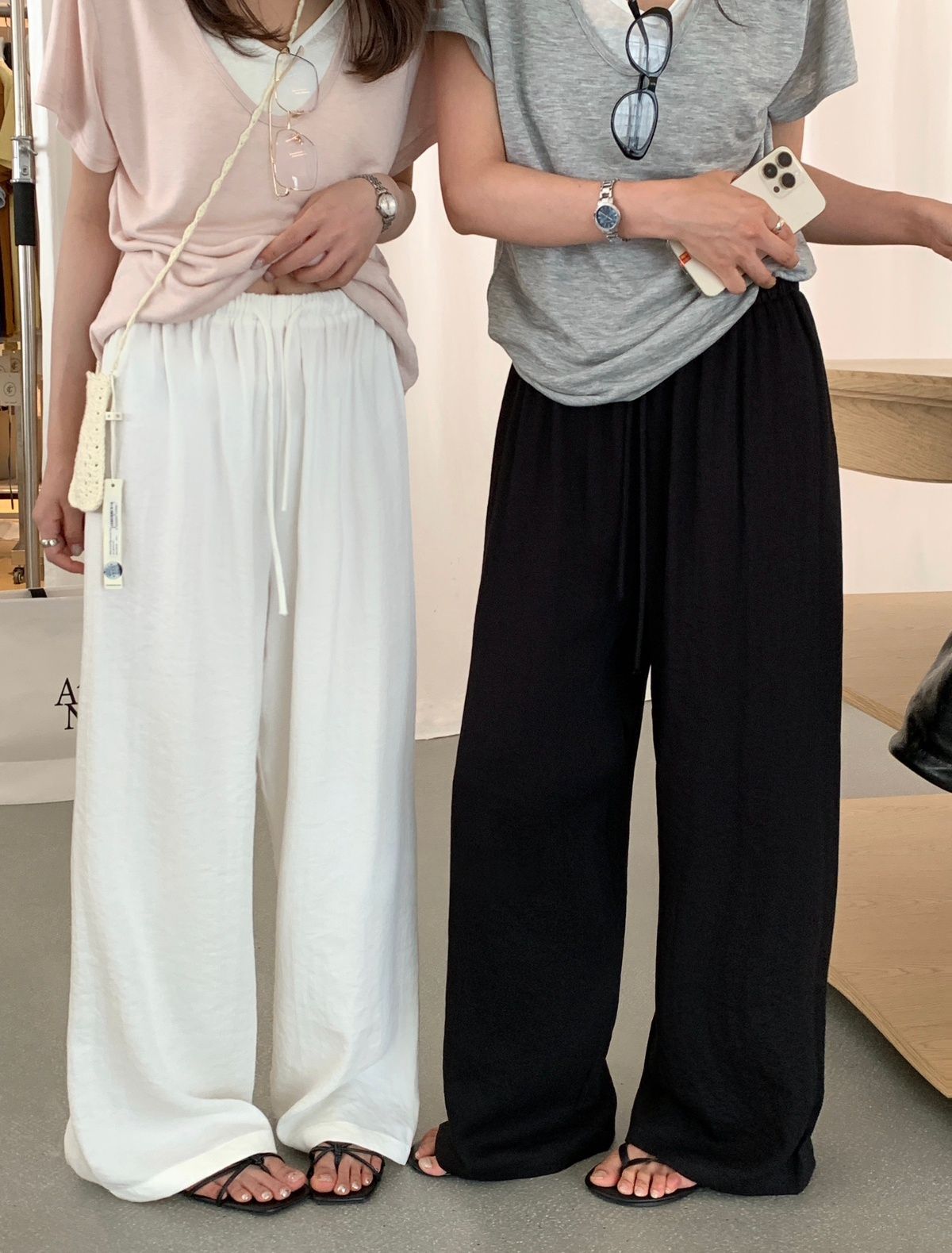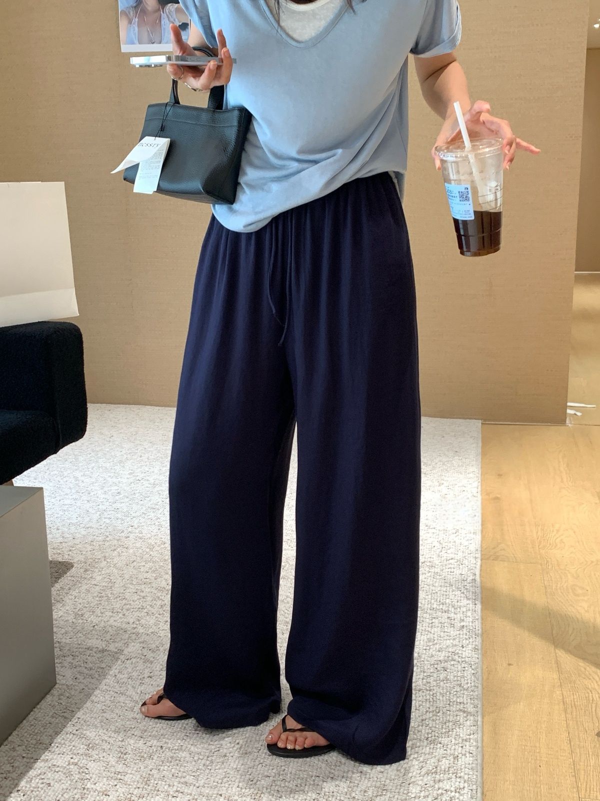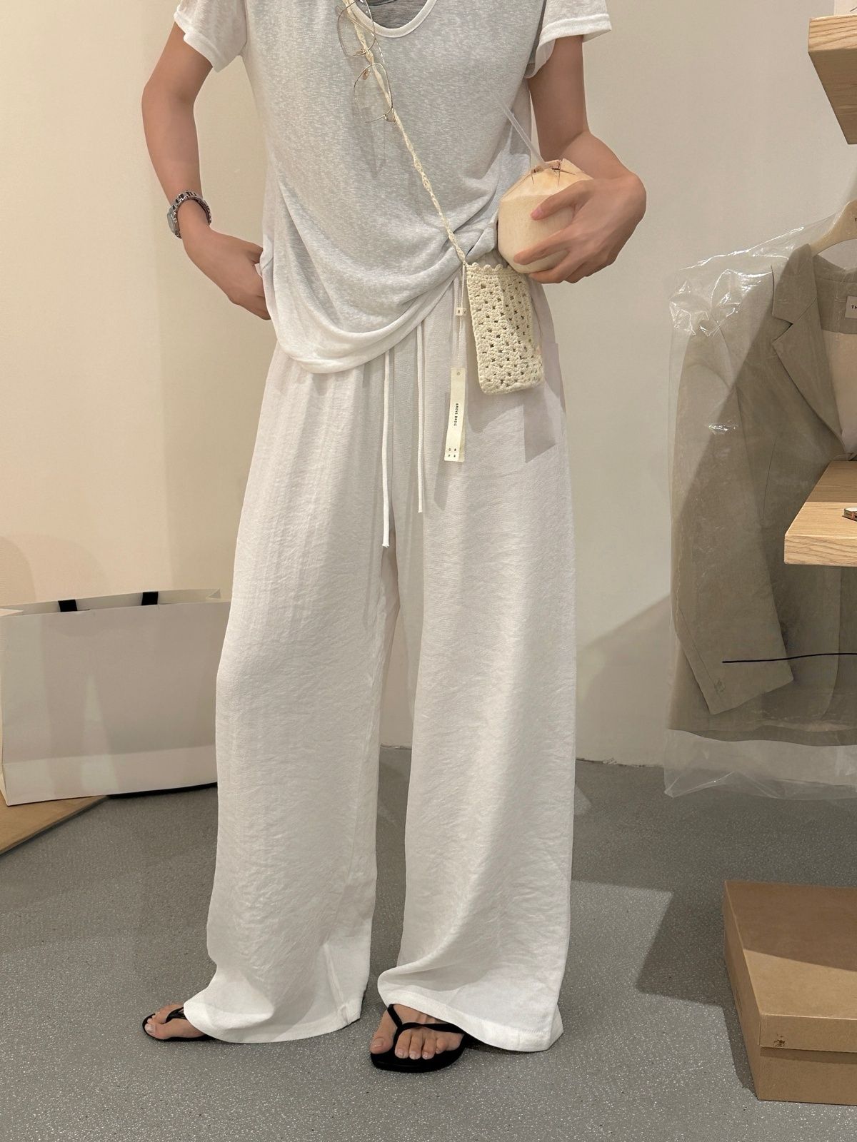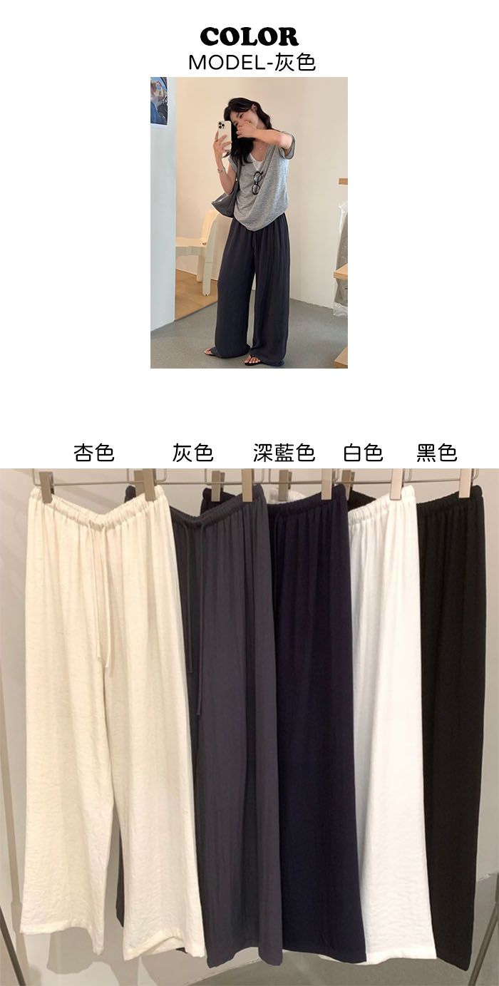 三種尺寸/抽繩鬆緊腰/寬褲管/直筒褲/落地褲 - 休閒居家渡假簡約百搭素面透氣素面直筒褲落地長褲多尺寸SML黑色杏色深藍色白色灰色