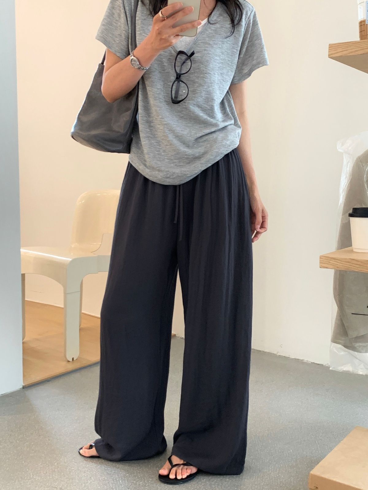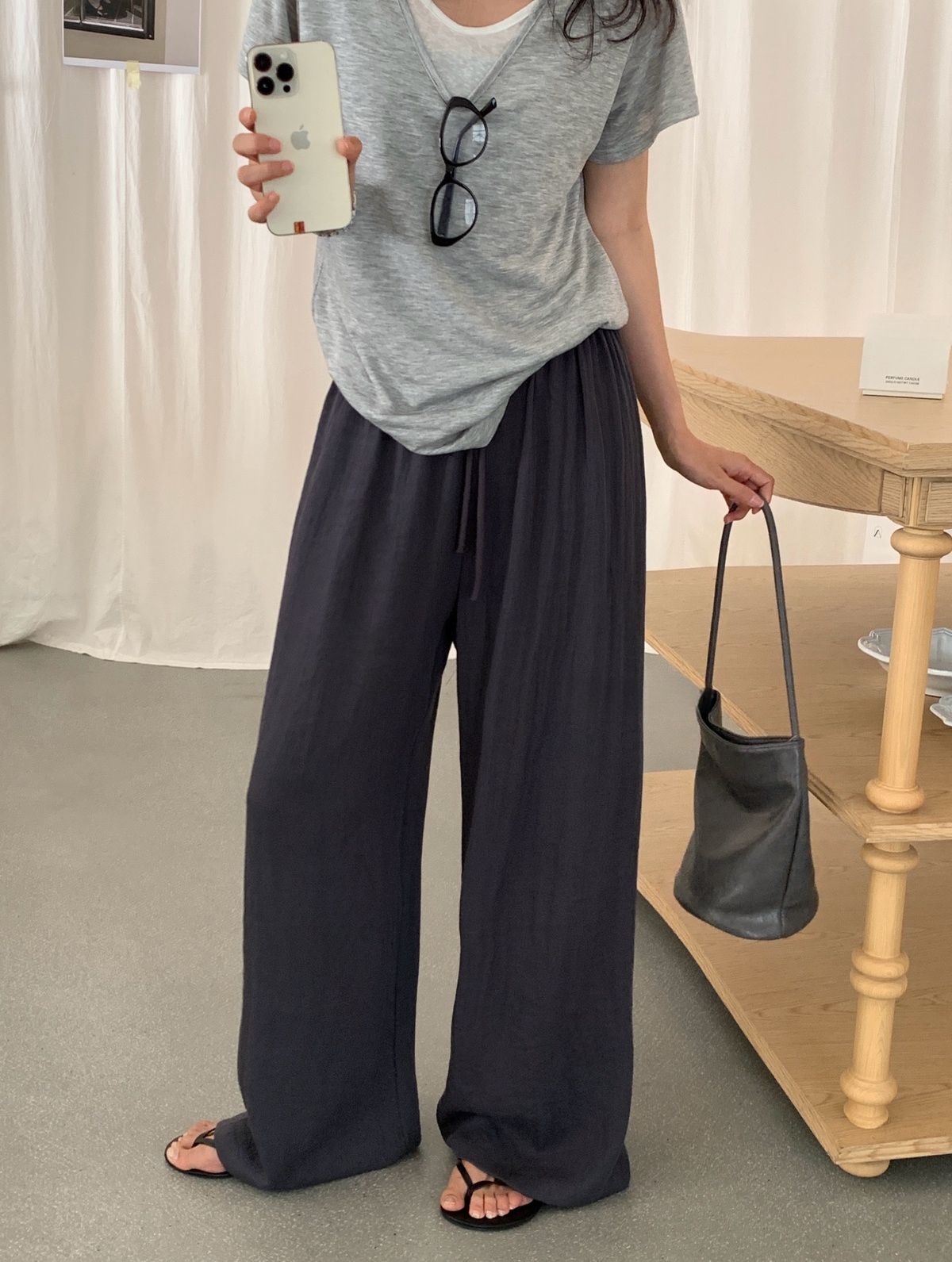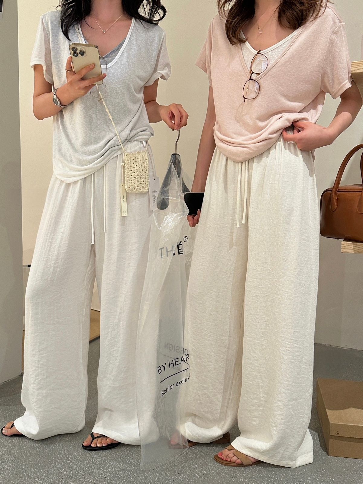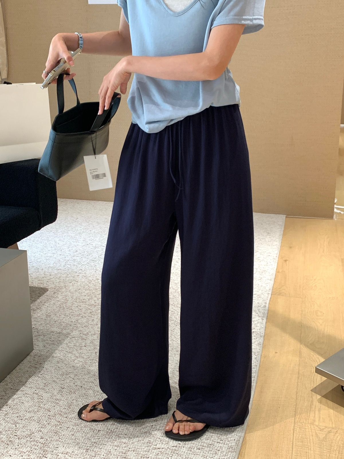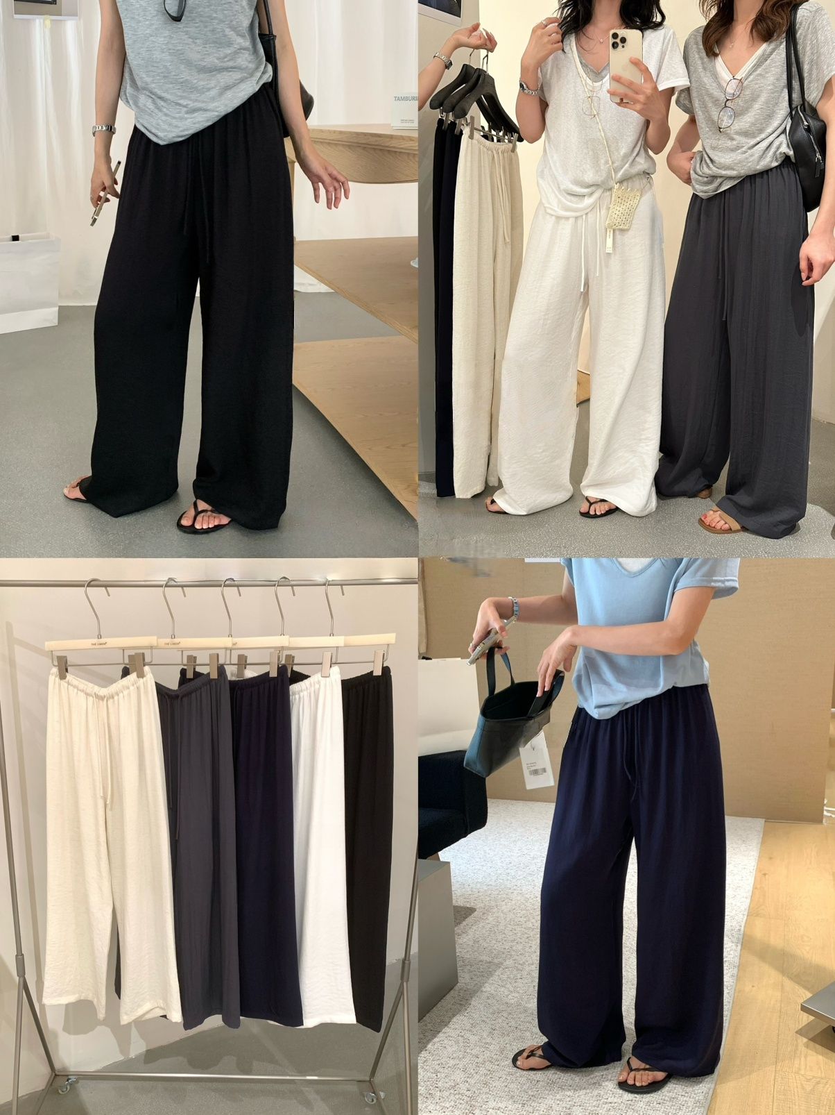 三種尺寸/抽繩鬆緊腰/寬褲管/直筒褲/落地褲 - 休閒居家渡假簡約百搭素面透氣素面直筒褲落地長褲多尺寸SML黑色杏色深藍色白色灰色