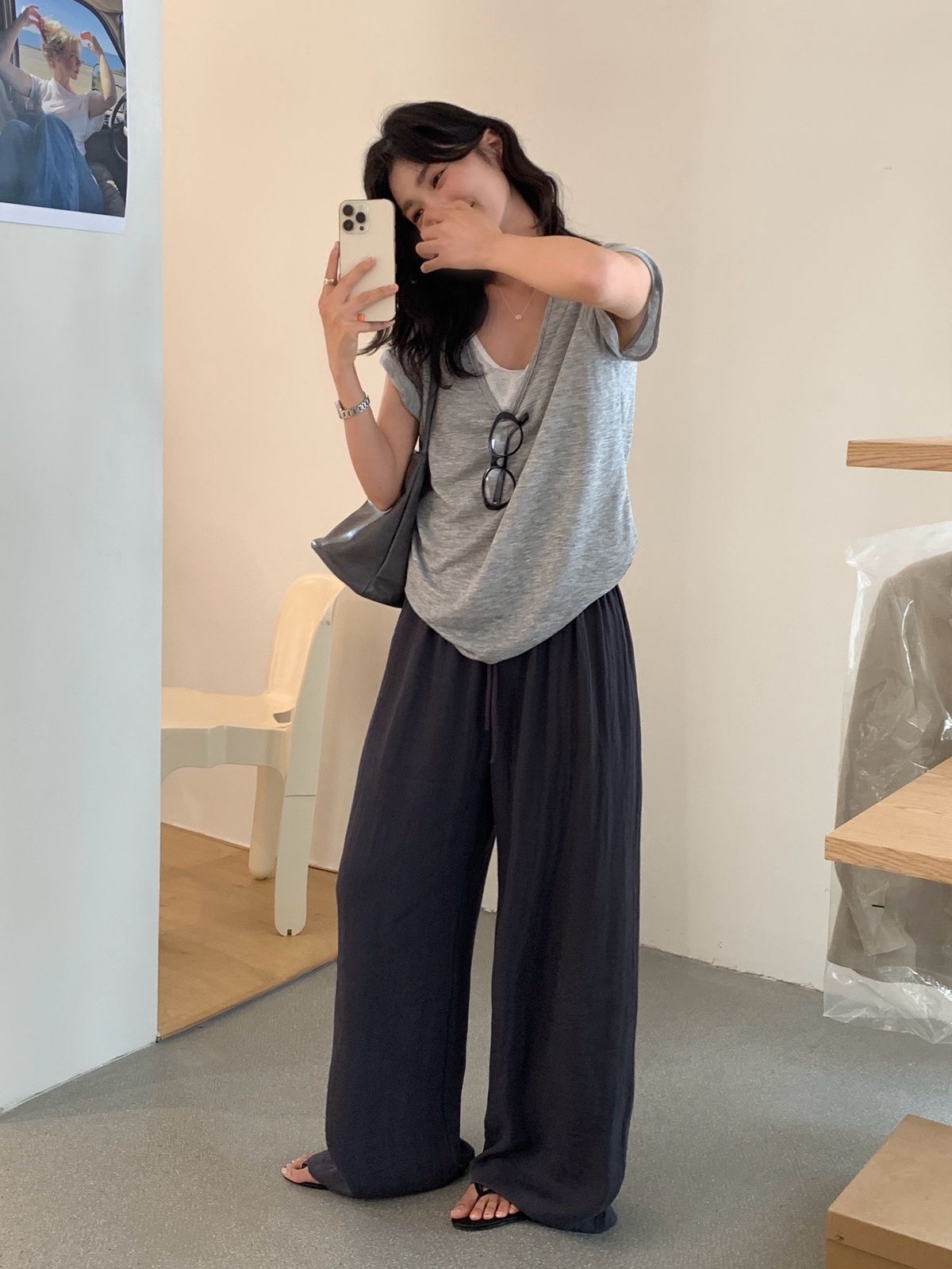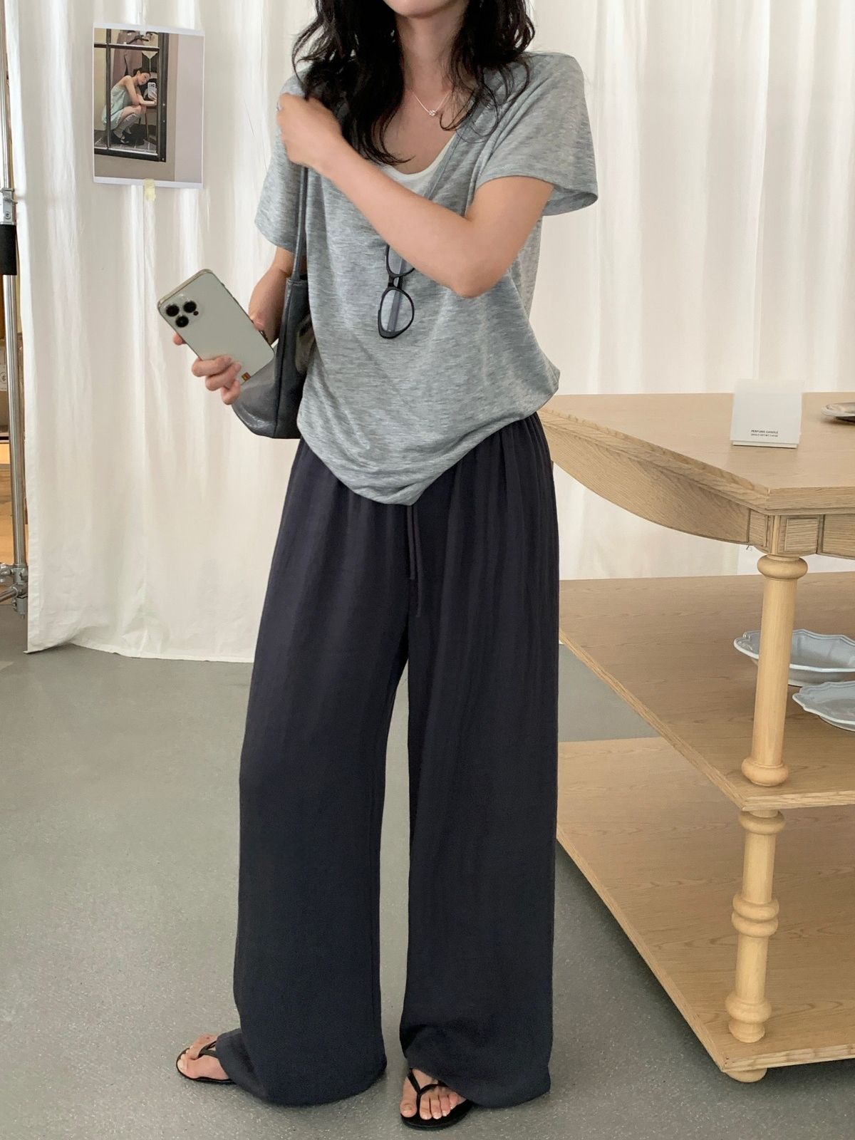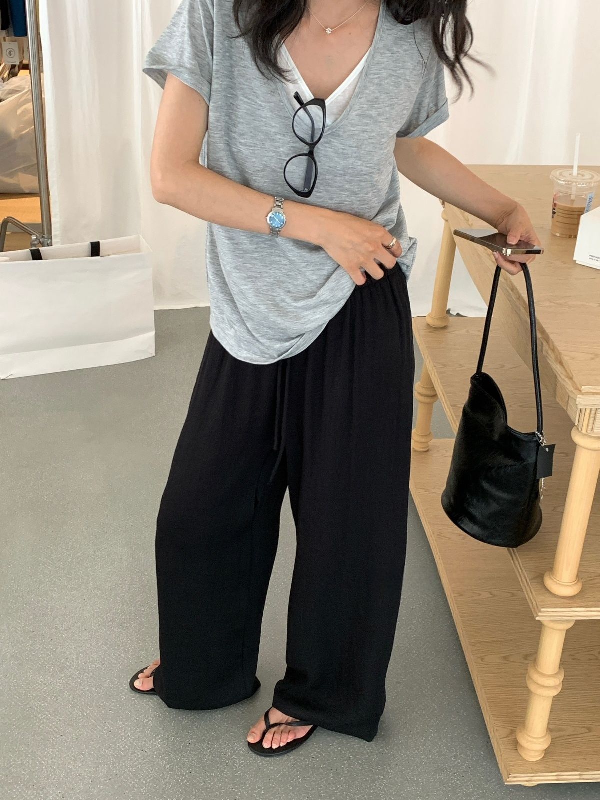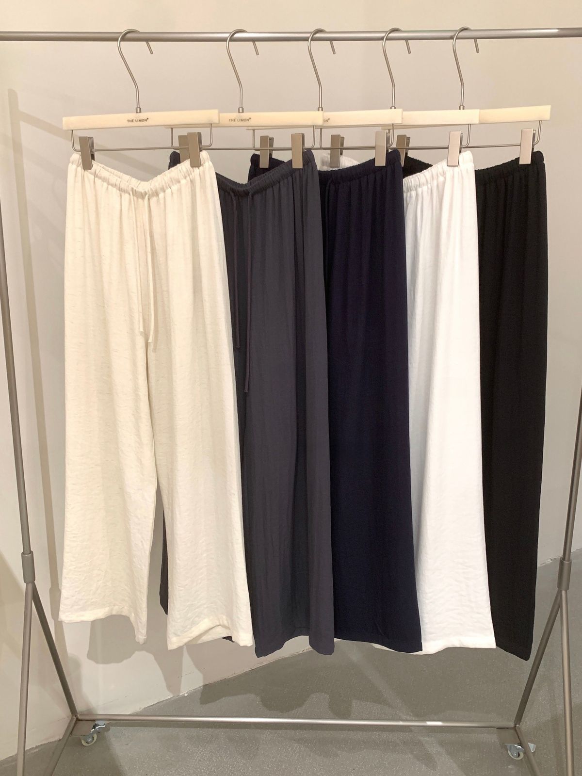三種尺寸/抽繩鬆緊腰/寬褲管/直筒褲/落地褲 - 休閒居家渡假簡約百搭素面透氣素面直筒褲落地長褲多尺寸SML黑色杏色深藍色白色灰色